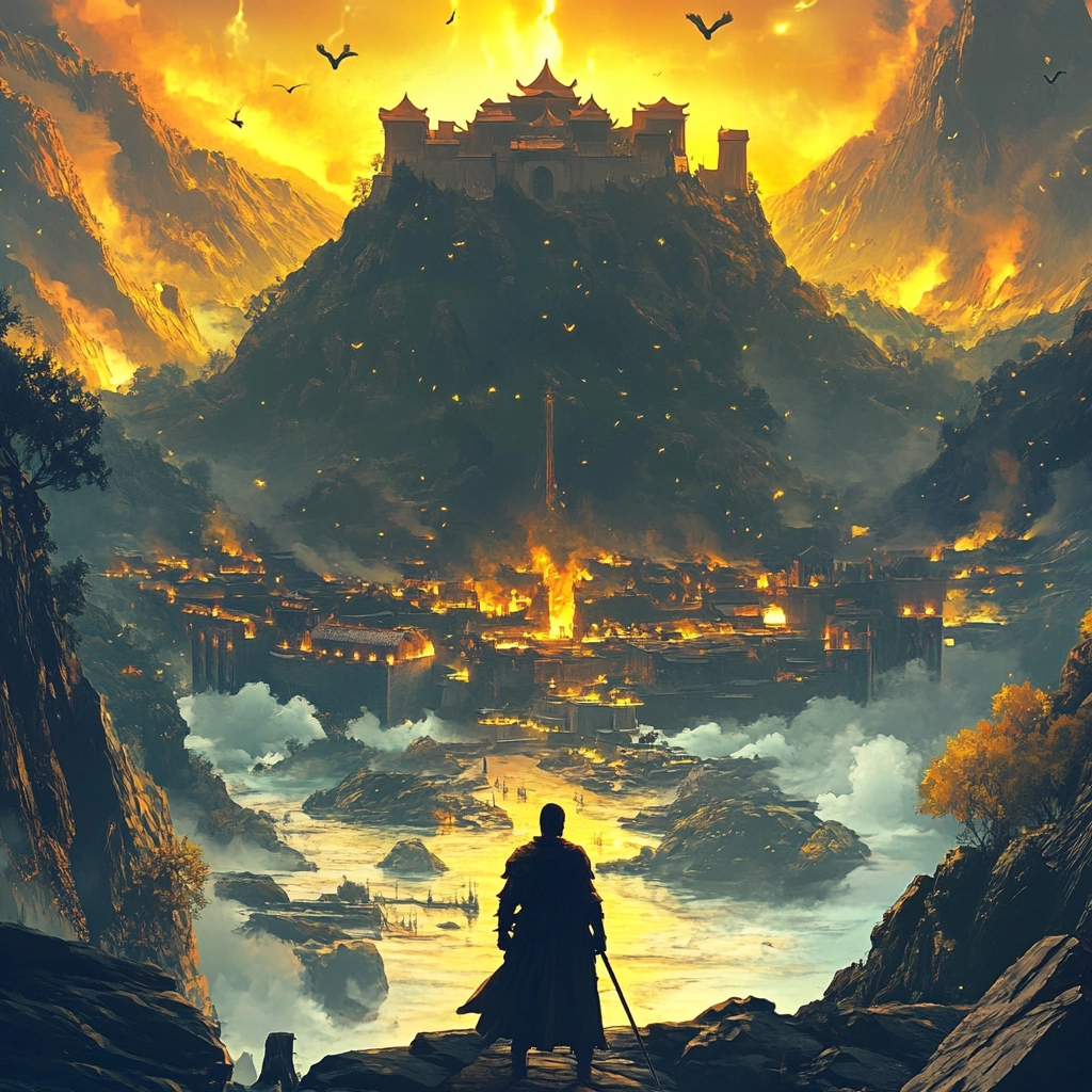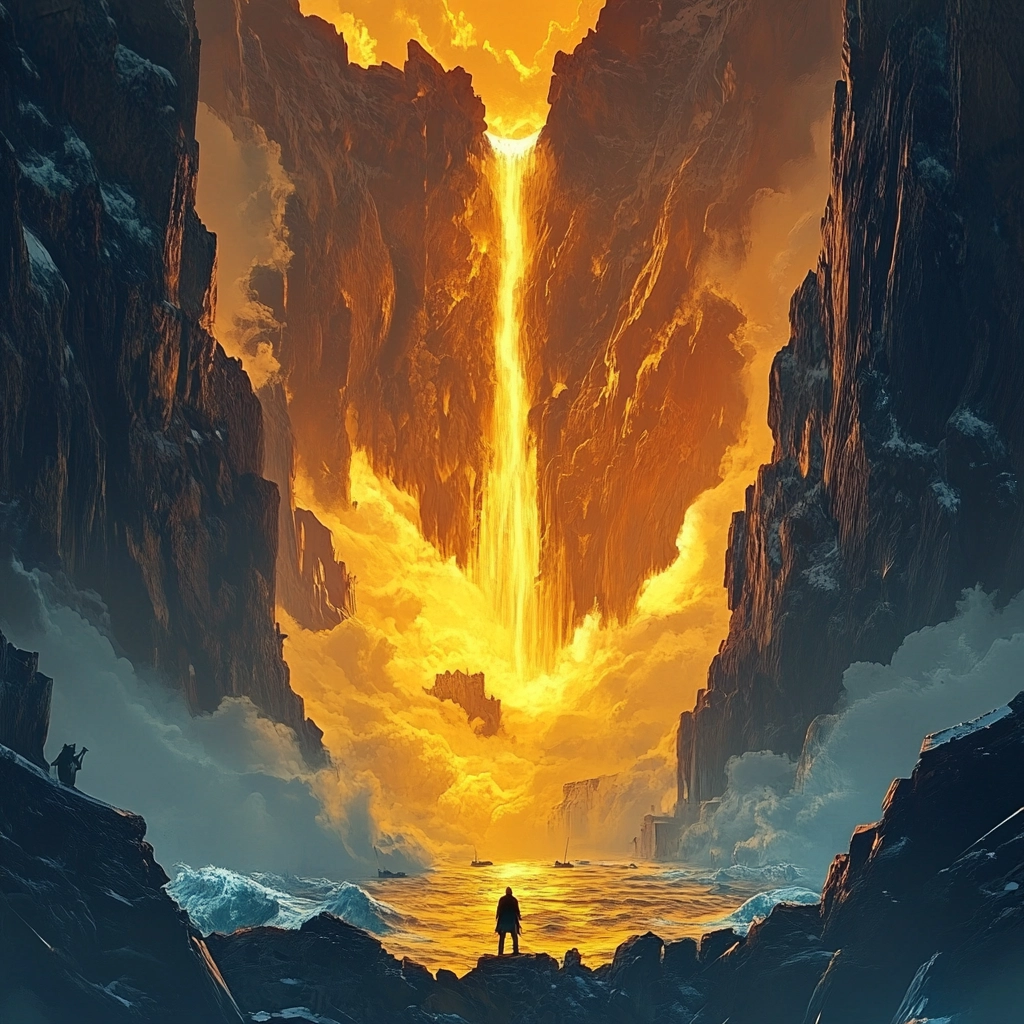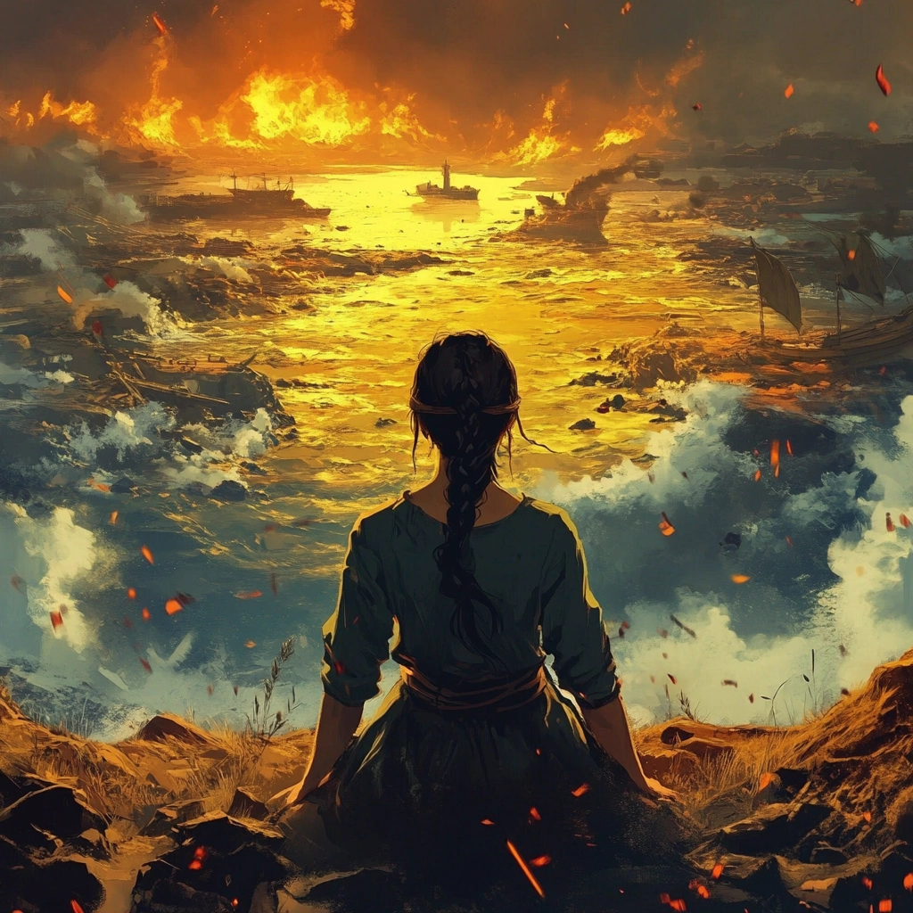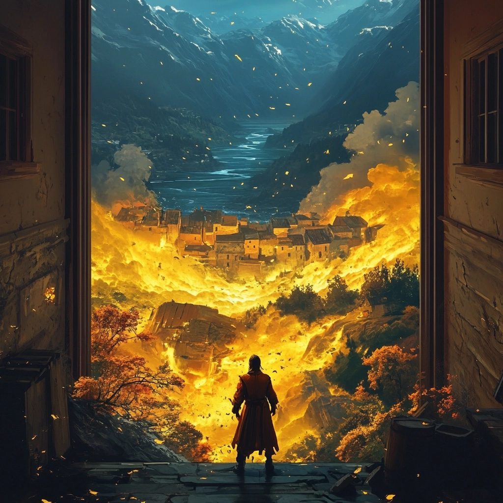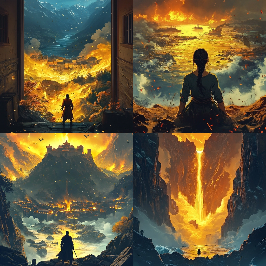 An intense contrast between fiery tones and cool shades with dramatic composition.