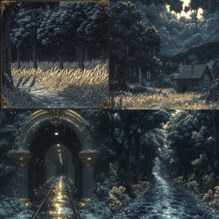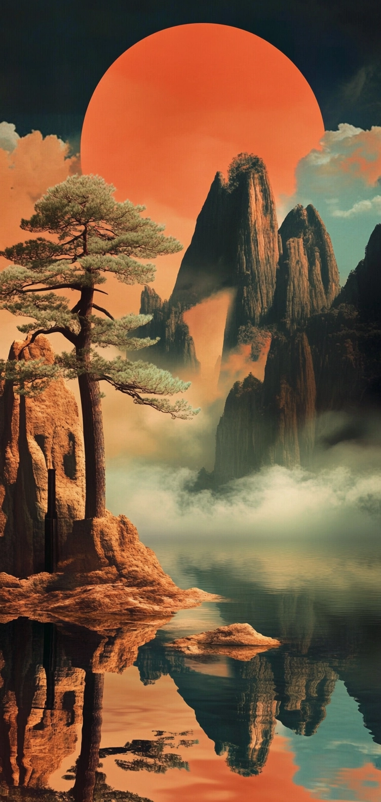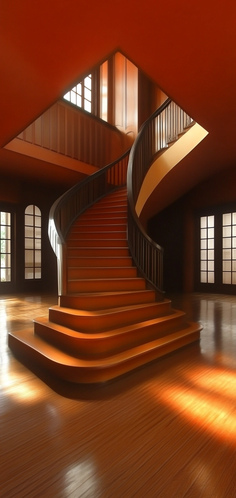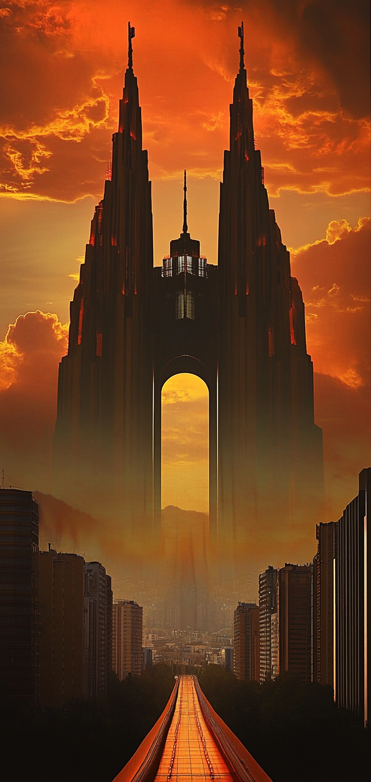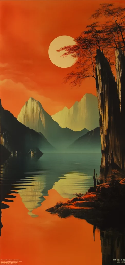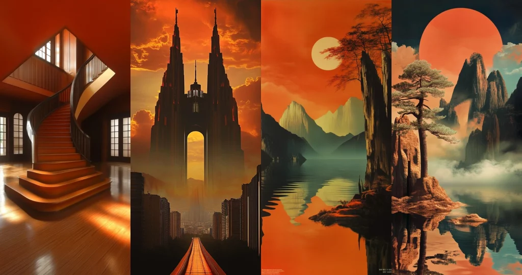 The lighting accentuates the warm and vivid orange tones, creating dramatic contrasts with softer shadows and darker elements. The spatial composition is vast and detailed, enhancing depth and intrigue.