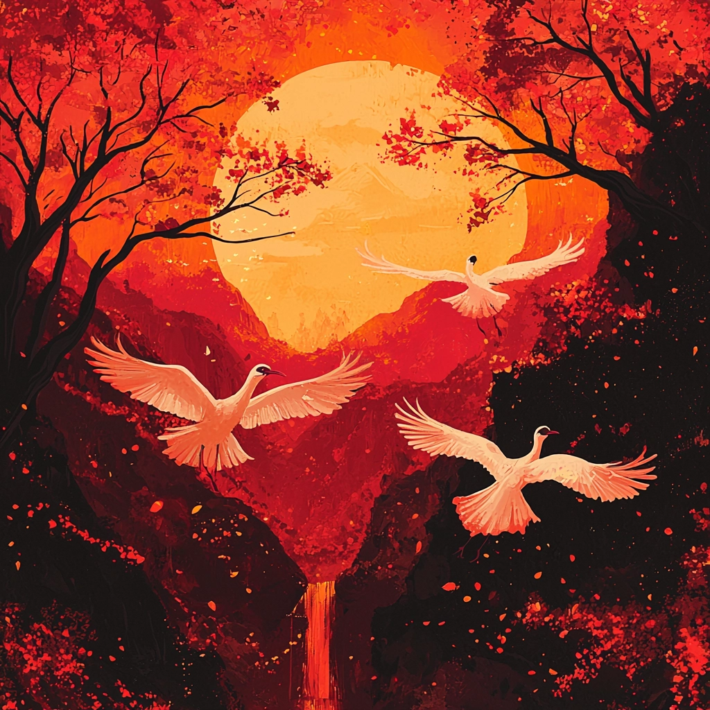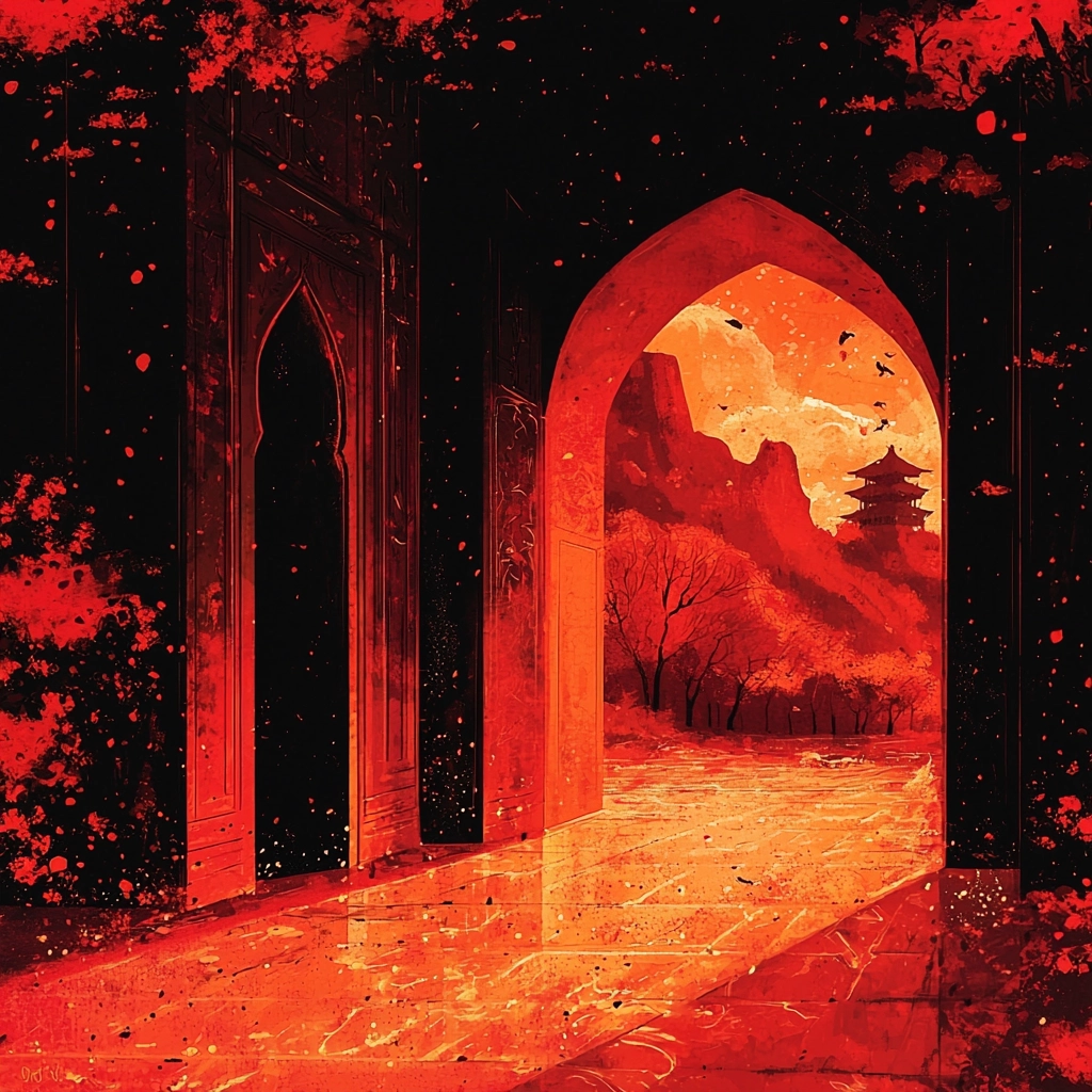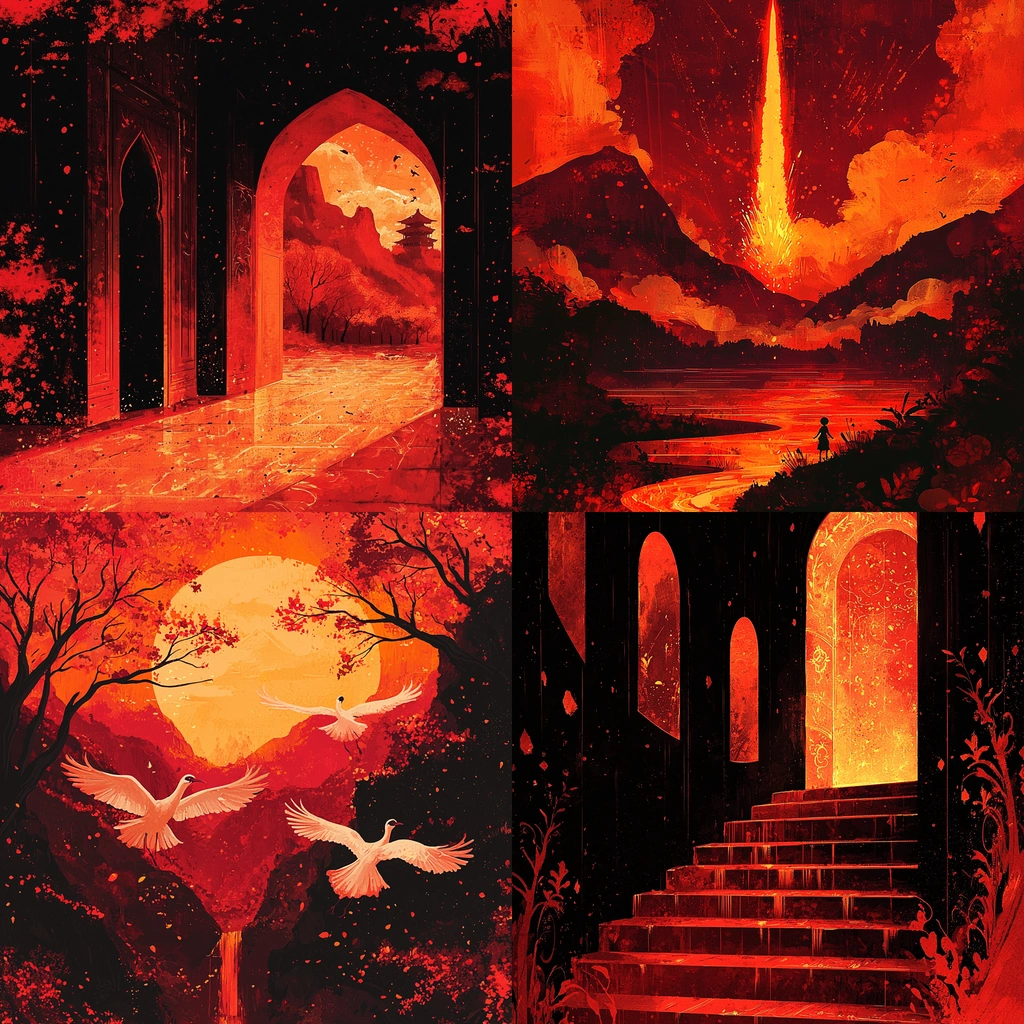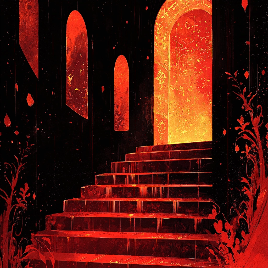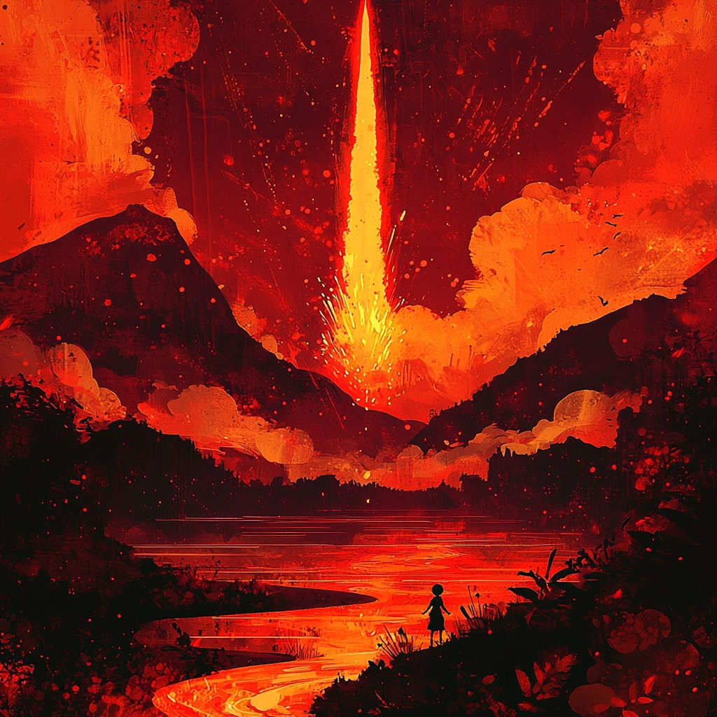 Vivid lighting highlights fiery tones, while contrasting darkness introduces depth. The surface texture alternates between smooth and rugged, enhancing spatial perception and focus.