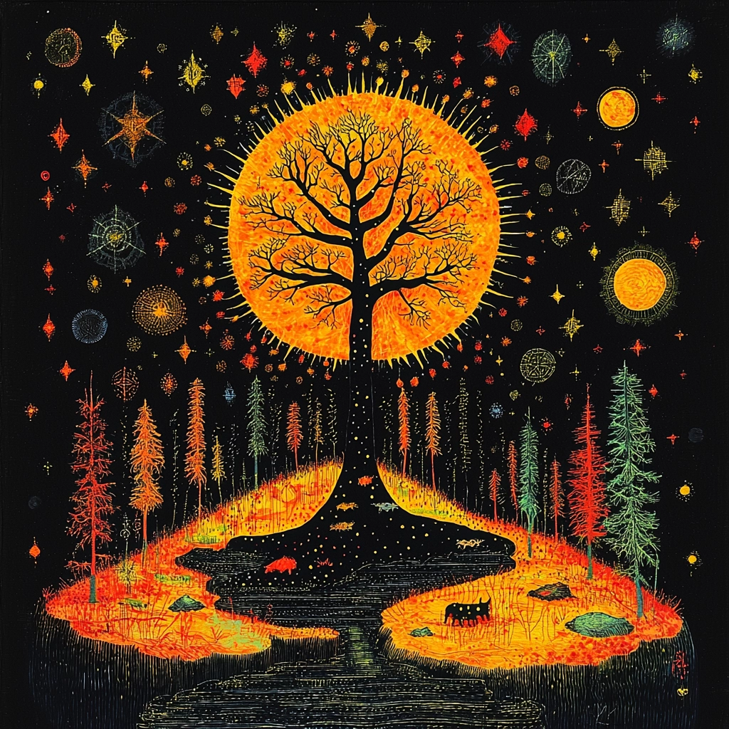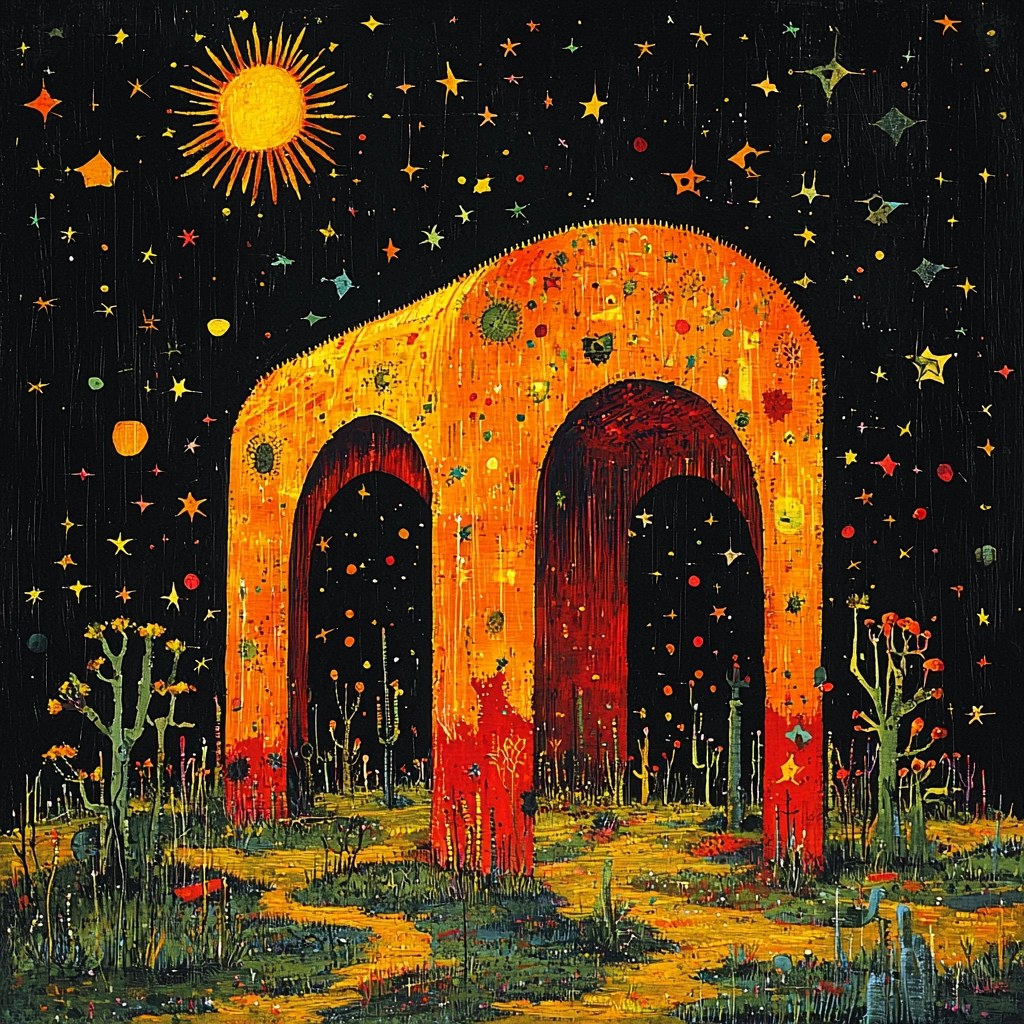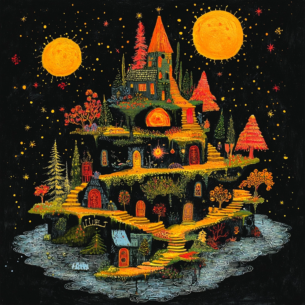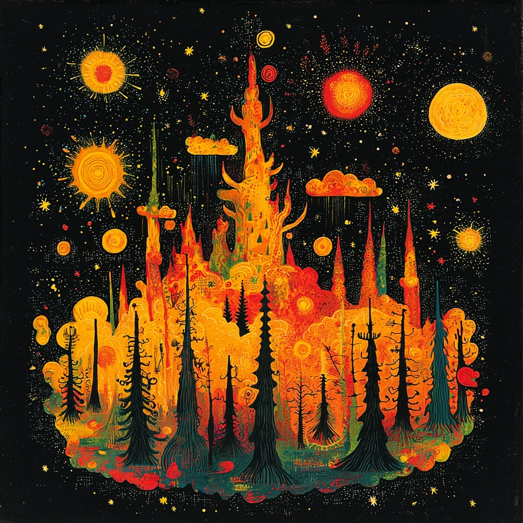 The dramatic lighting emphasizes the contrast between vivid orange and yellow against the deep black background, creating a sense of wonder. The textural variations enhance depth, and the arrangement suggests whimsical landscapes lit by cosmic illumination.