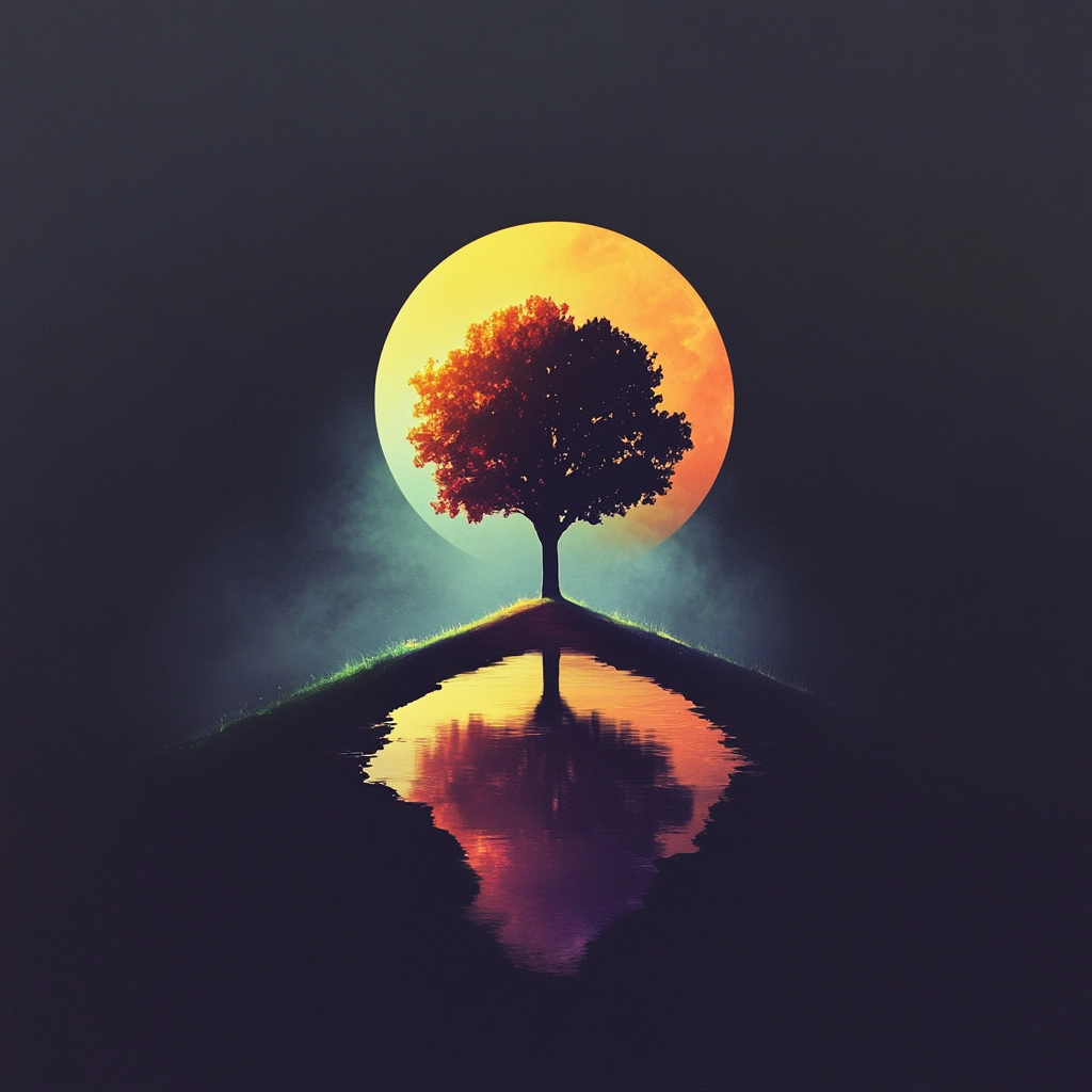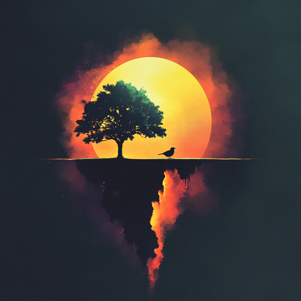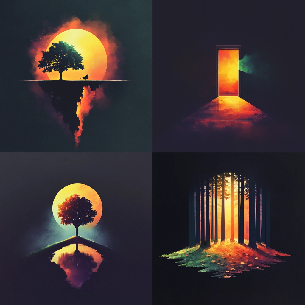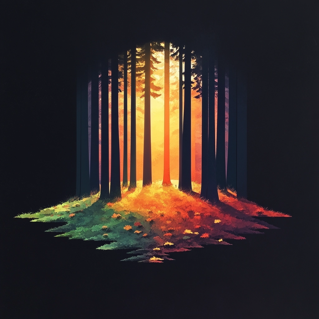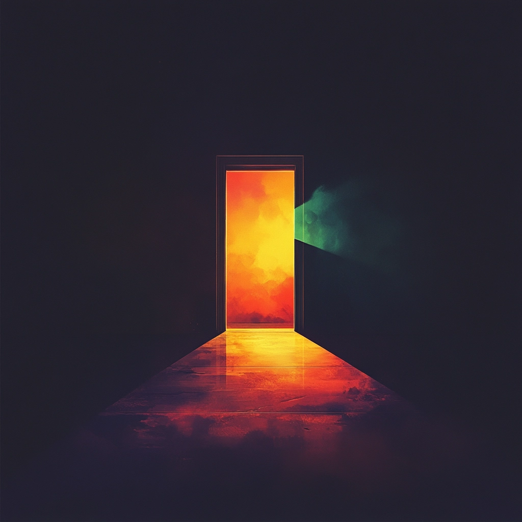 Soft gradient transitions illuminate the scene with a glowing warmth, emphasizing vibrant, fiery hues against shadowy backgrounds. Textures are smooth, lending a polished sense. The spatial arrangement demands attention through its stark illumination, inherently guiding vision through depth and light contrasts.