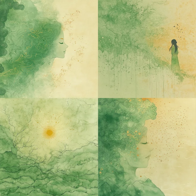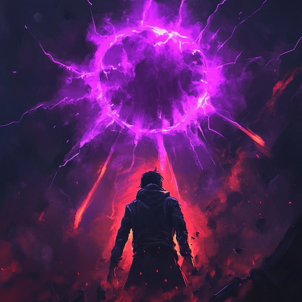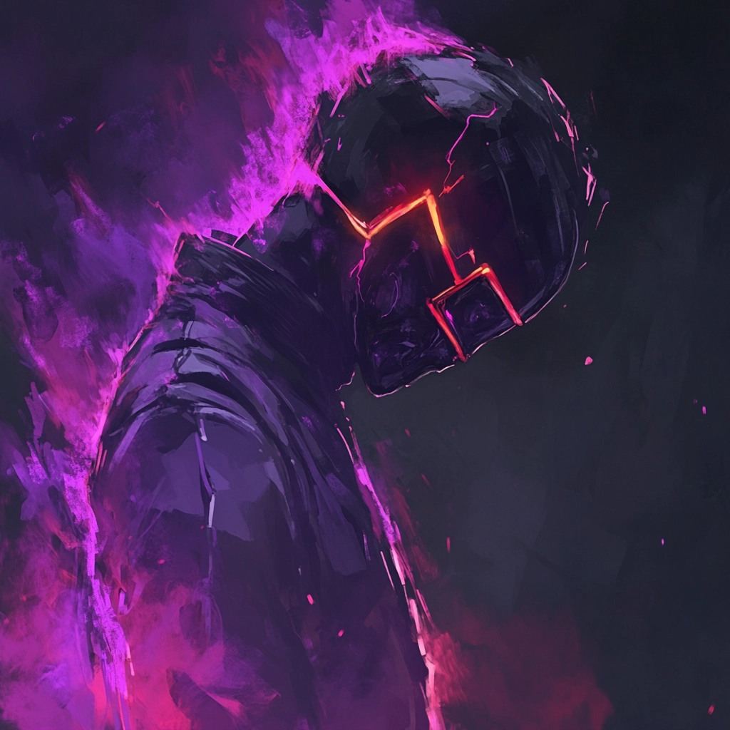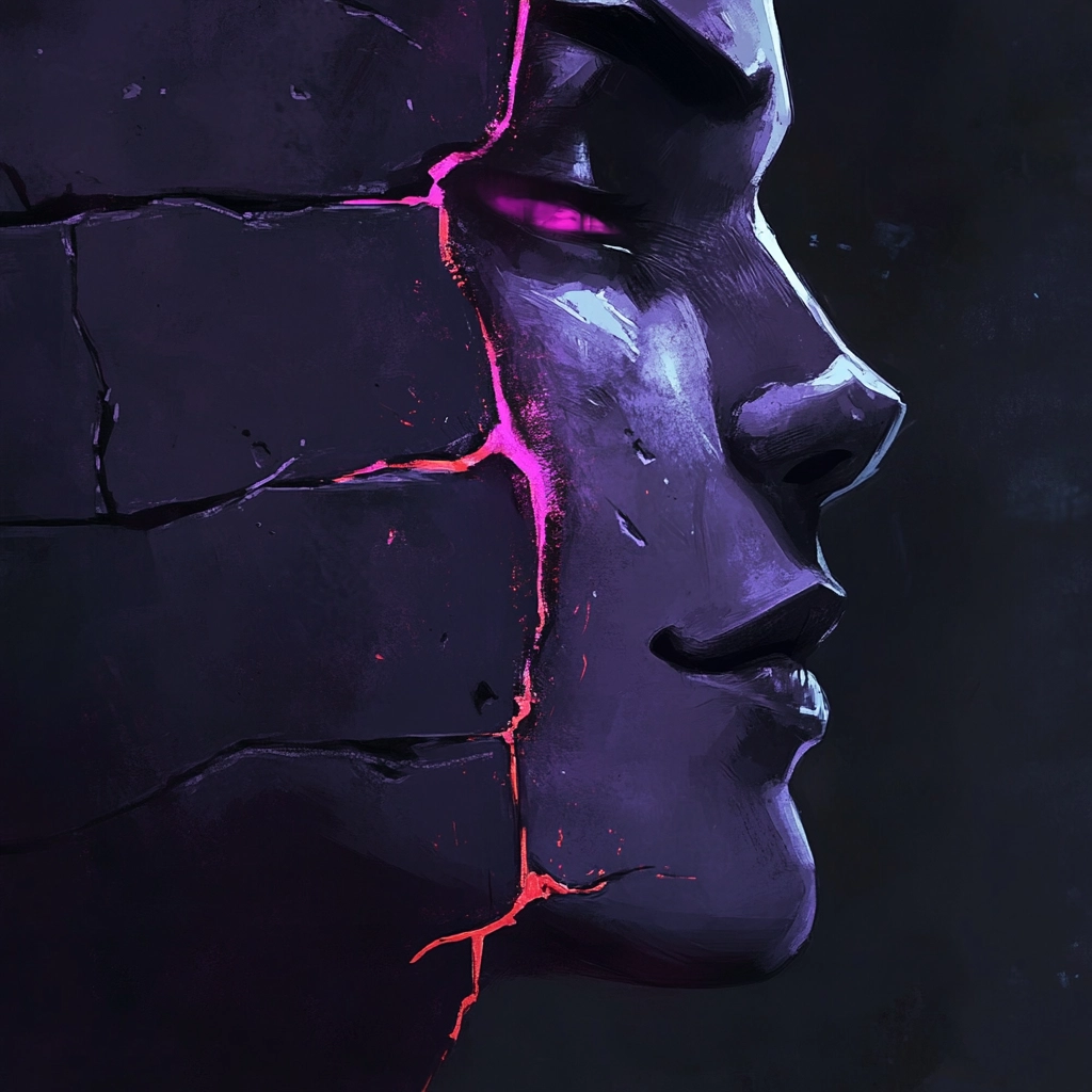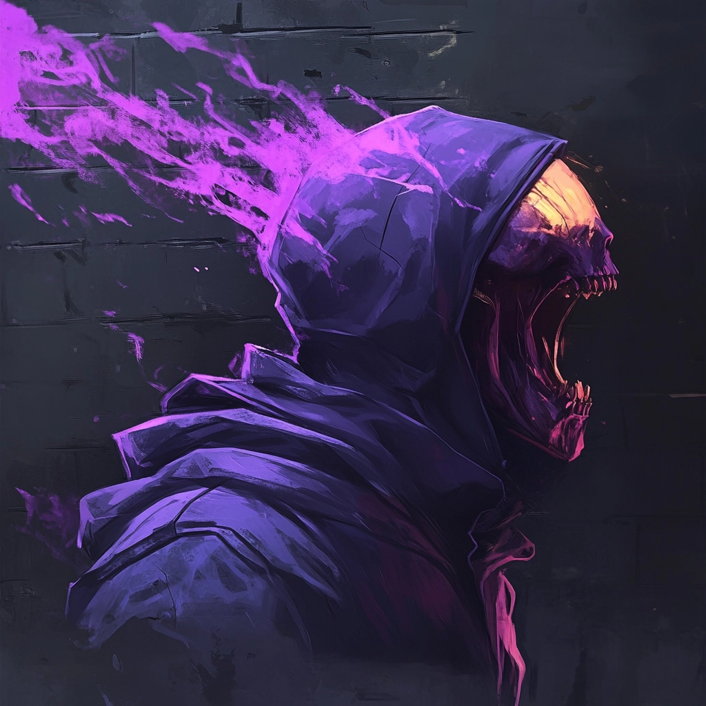 The lighting creates a stark contrast between glowing violet and somber black tones, heightening the sense of depth. Textures appear gritty and raw, with vibrant colors emphasizing focal points. Subtle gradients enhance the spatial illusion, while fragmented elements add tension.