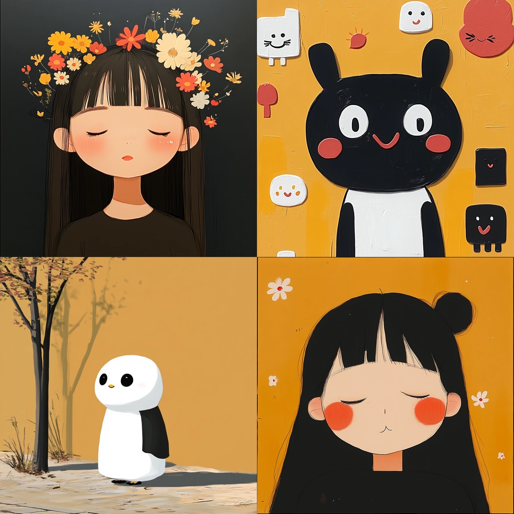 This style utilizes high contrast flat colors, creating bold shapes against uncomplicated backgrounds. The lighting is minimal, highlighting clear outlines and solid fills that enhance the simple yet striking appearance of each element.
