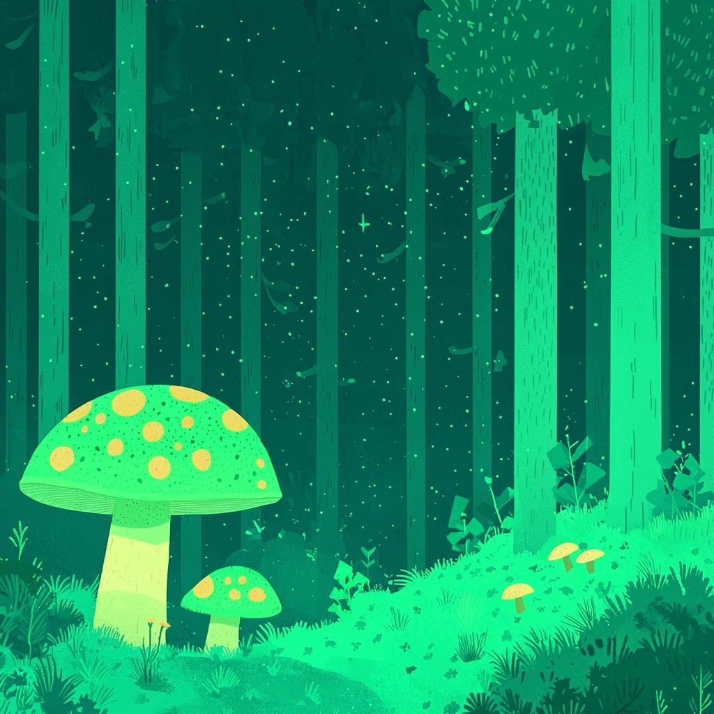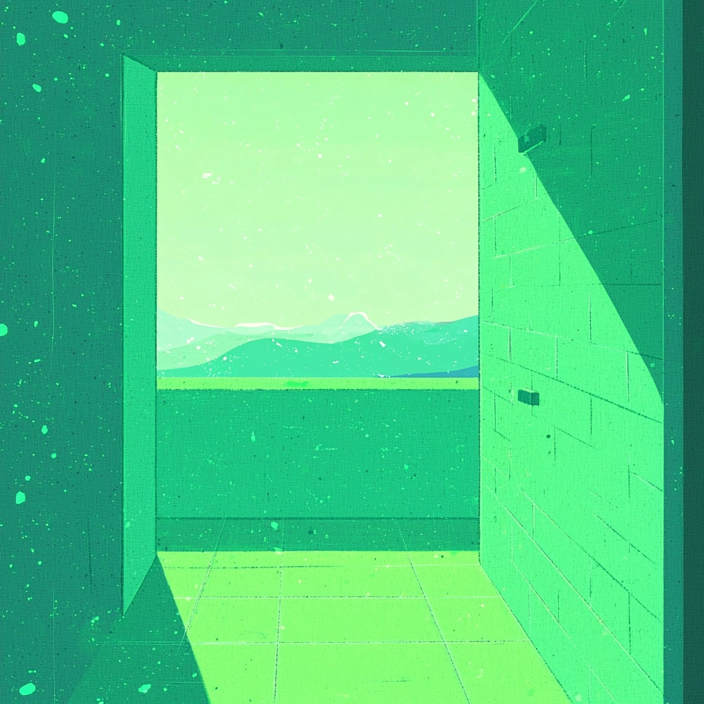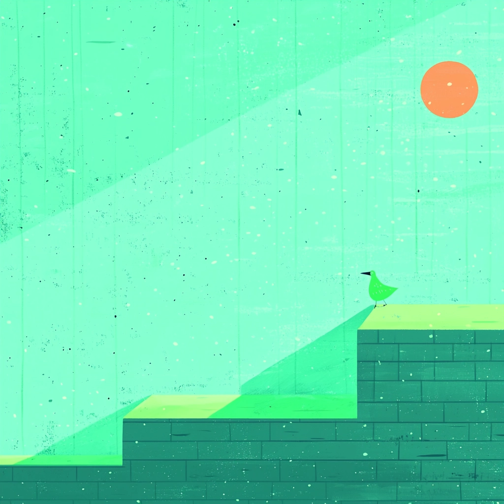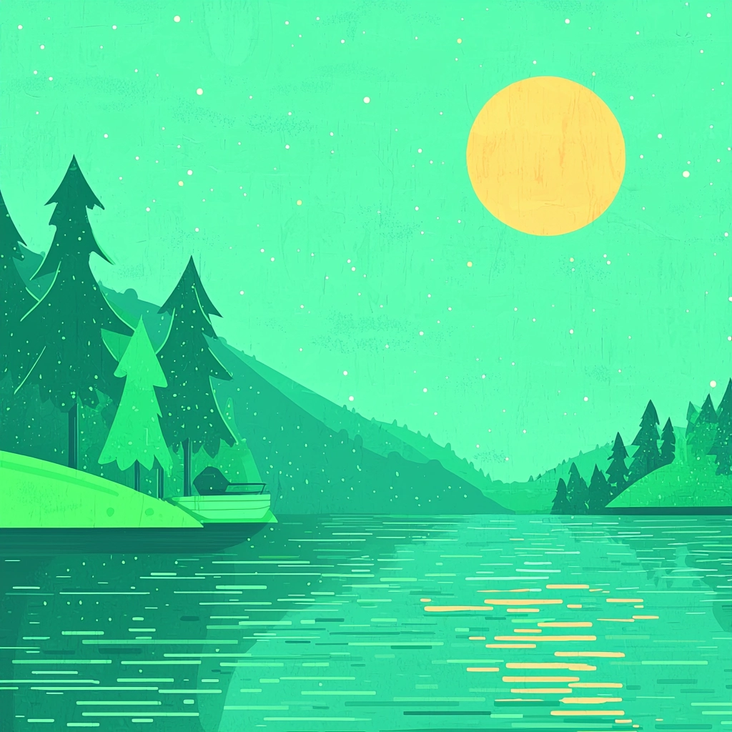 The use of flat green with yellow accents and dark blue shading creates a visually striking yet coherent composition. Shadows contribute to the depth, while subtly textured surfaces add intrigue without distracting from the overall tranquility.