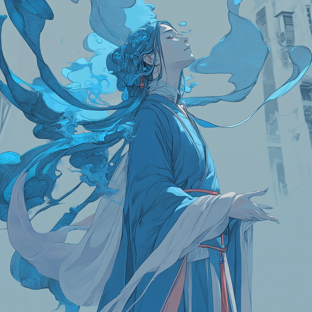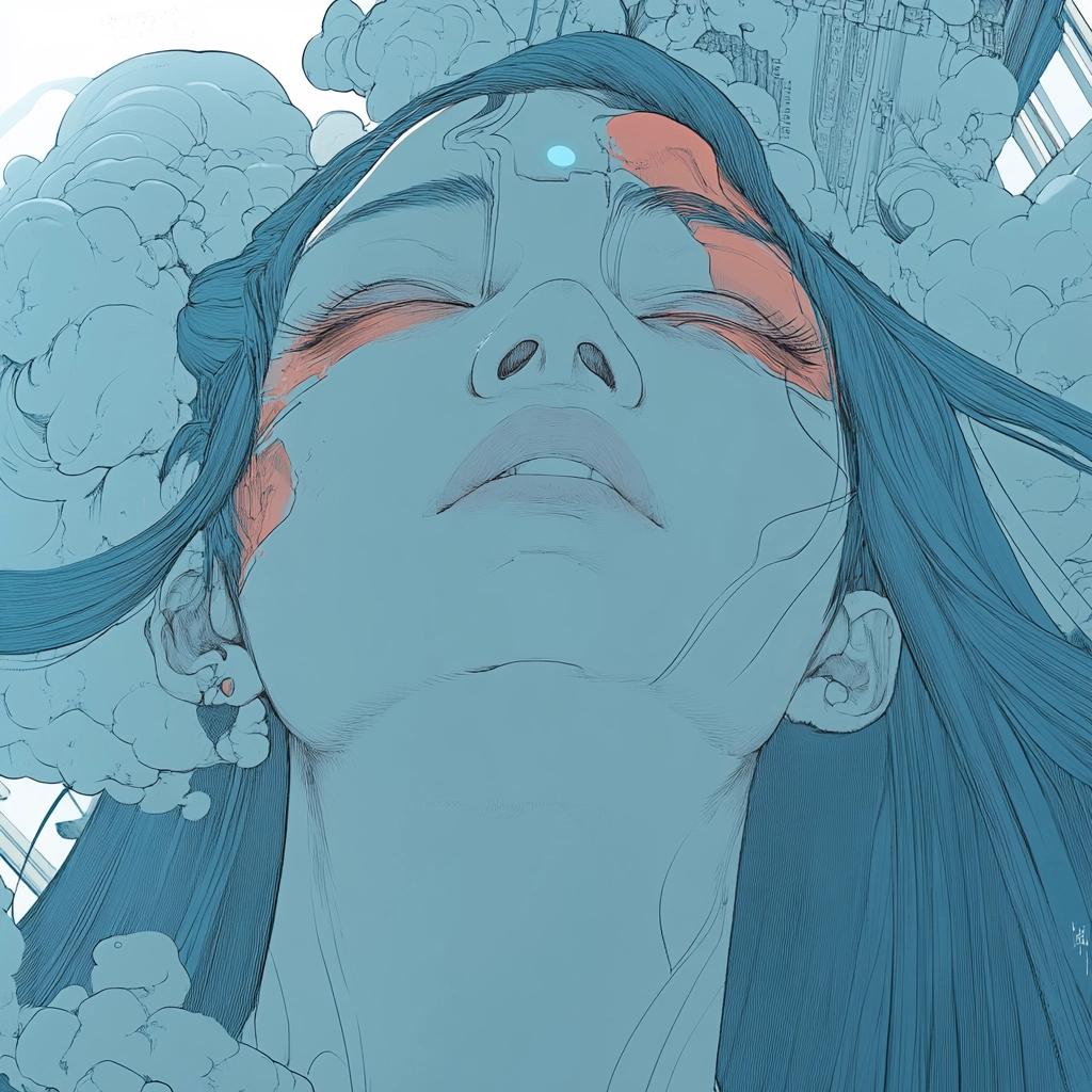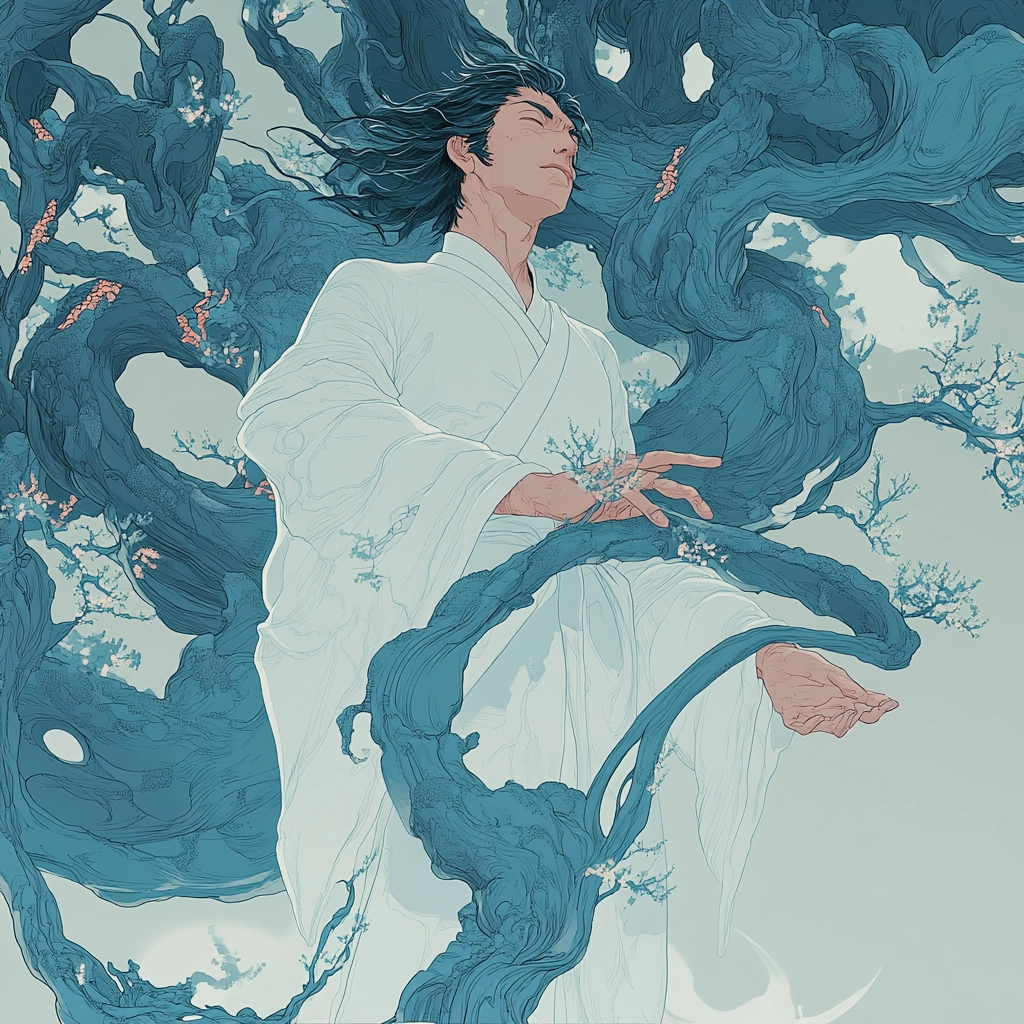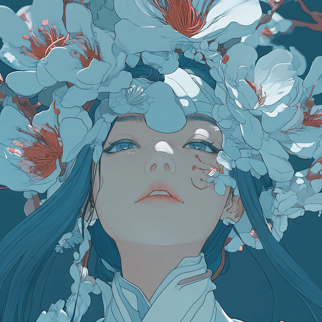 The artwork utilizes soft lighting that accentuates the floral elements, while a predominant use of blue provides depth and unity. The texture is smooth, creating a gentle flow, enhanced by contrasting white and pink for visual emphasis.