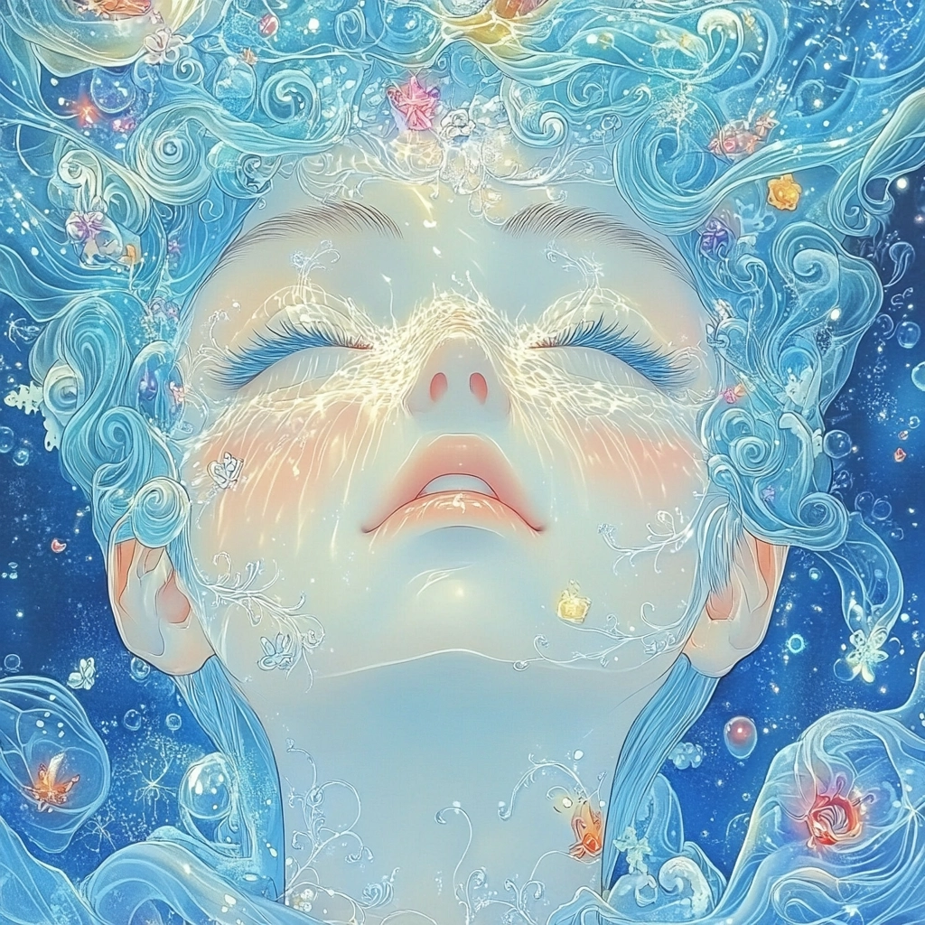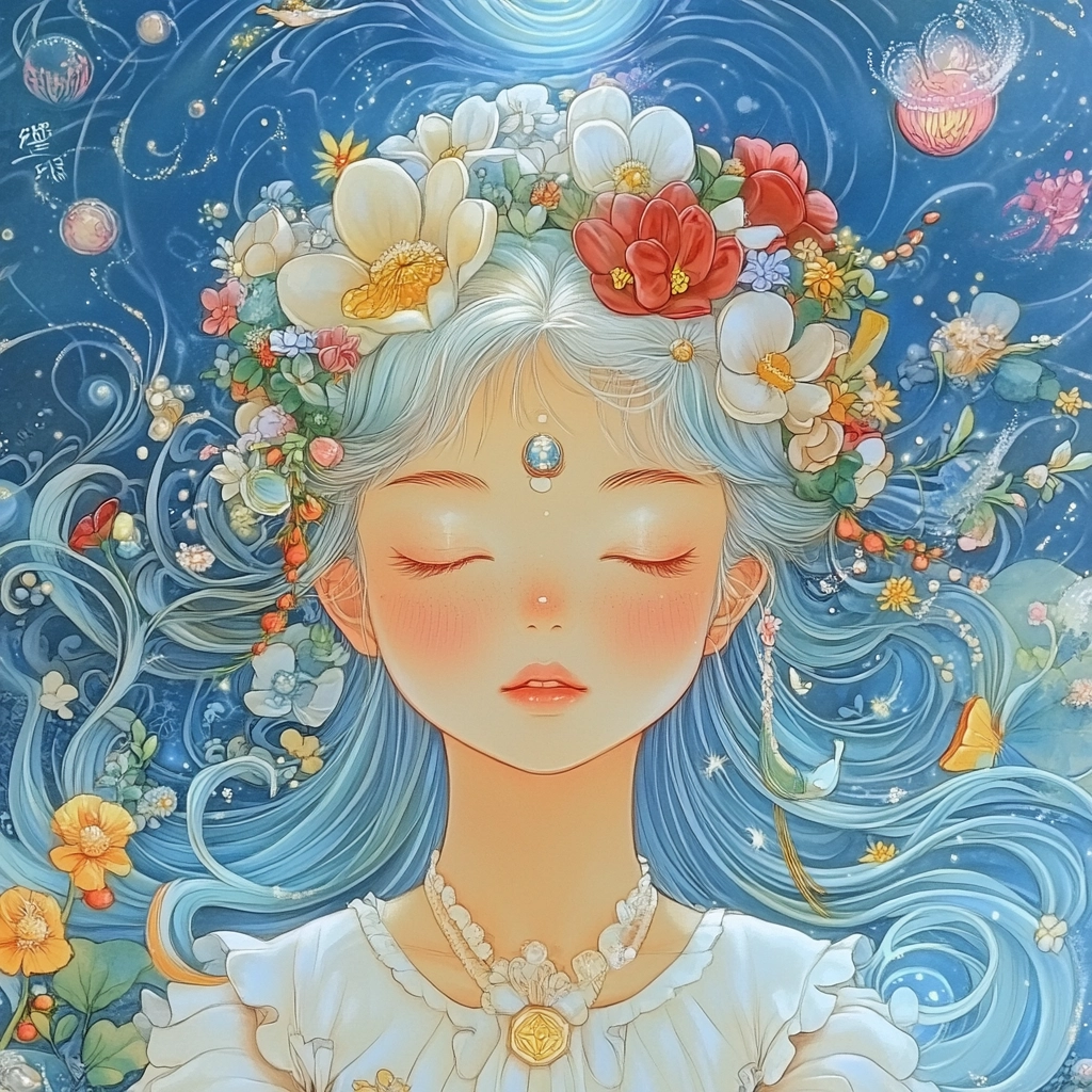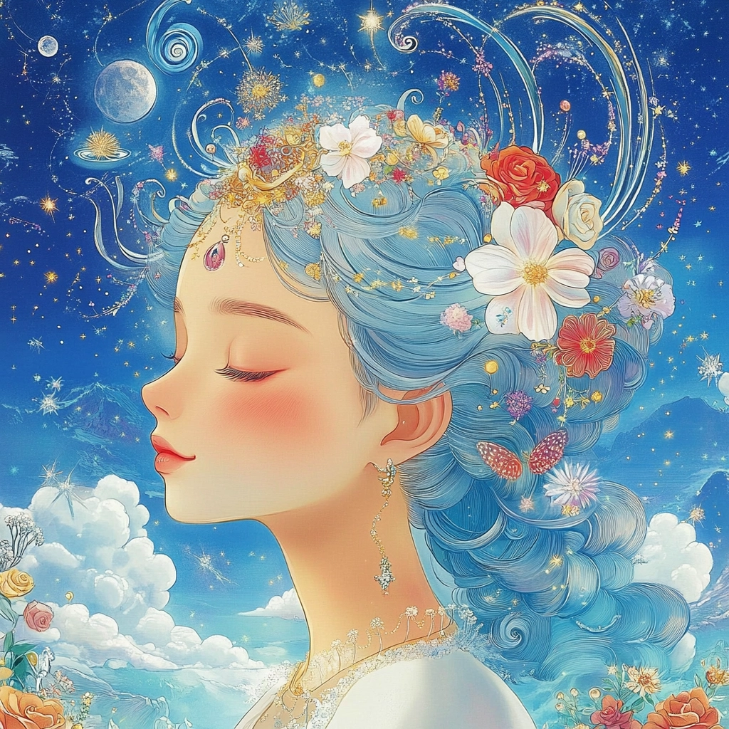 Luminous floral designs intertwine within a celestial blue setting, creating a dynamic visual interplay.