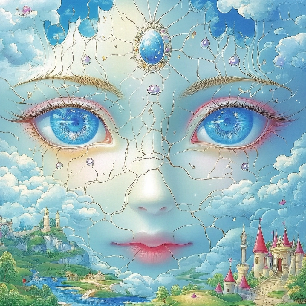 The artwork uses vibrant blues and whites under enhanced lighting to emphasize volume and depth. Fluid, curling textures overlay spatial elements, introducing vivid pops of color against a cosmic backdrop.
