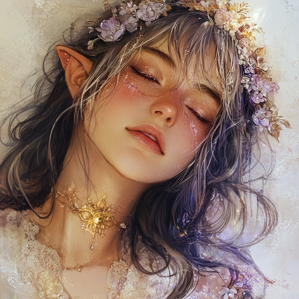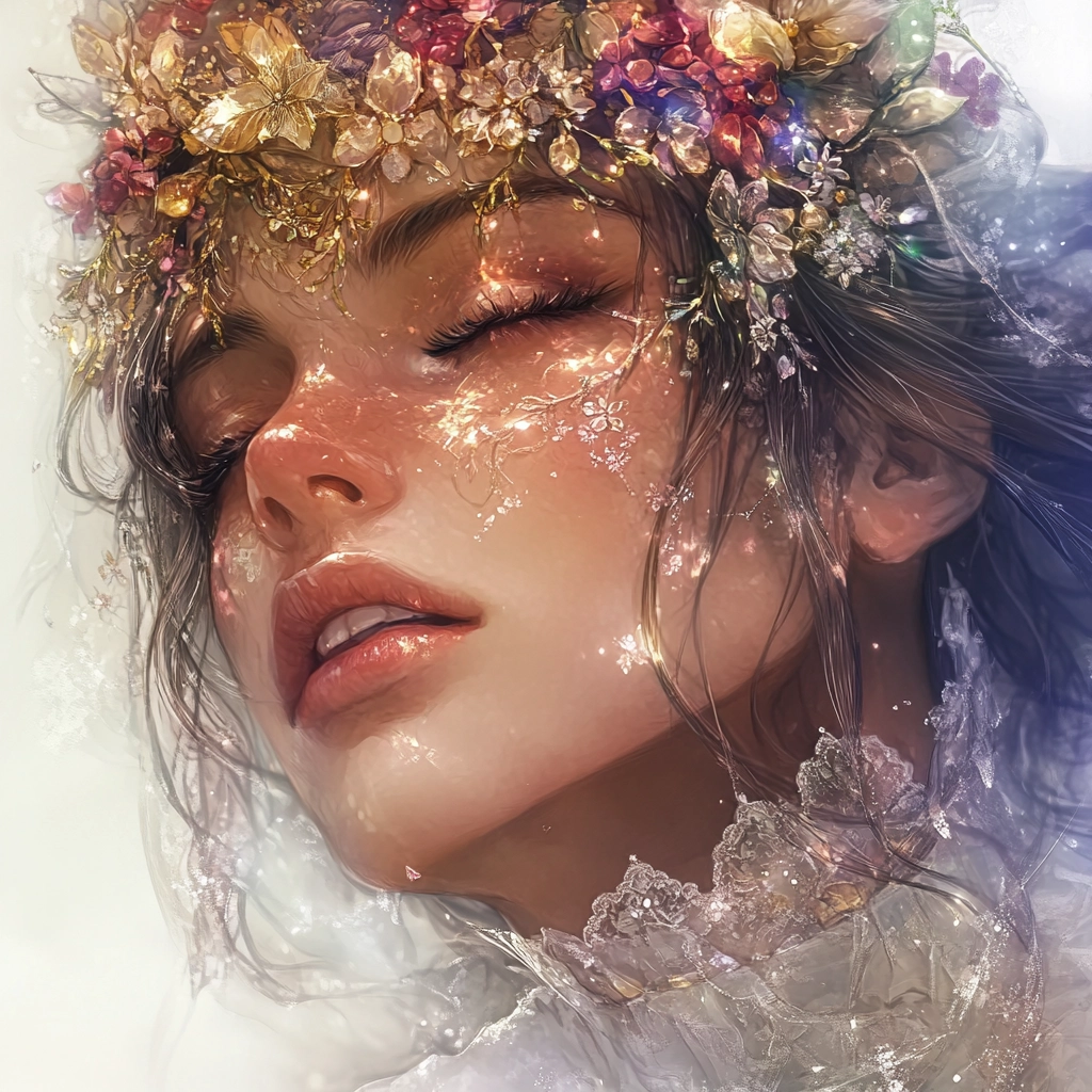 Interplay of intricate floral adornments and opulent jewelry against soft, ethereal lighting.