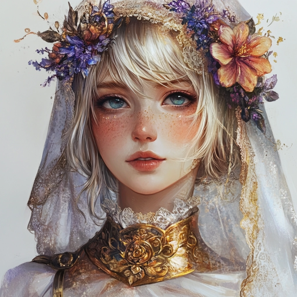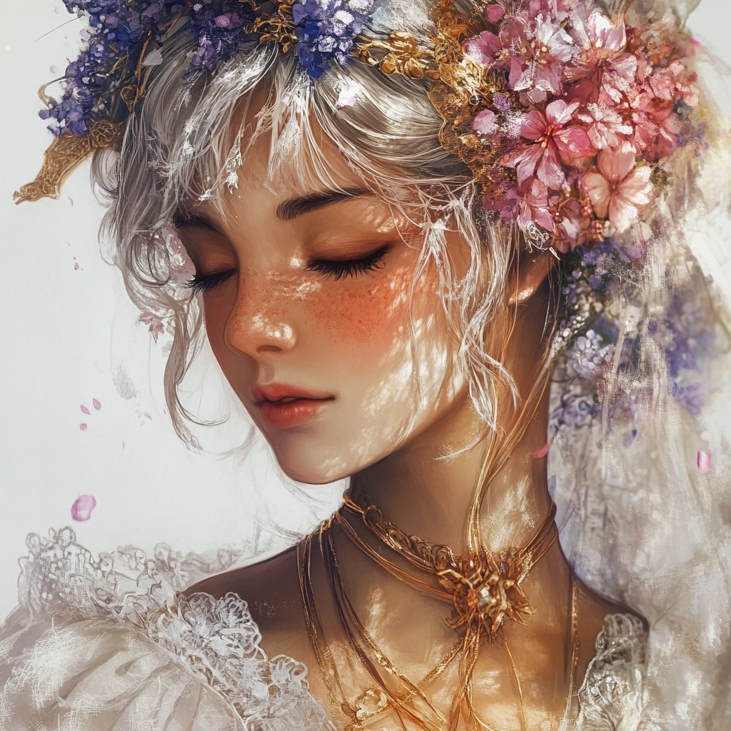 The lighting highlights the gold accents and floral details effectively, creating a luminous glow. The colors are rich and saturated, with purples adding a royal depth, contrasting with the purity of white and the brilliance of gold. Textures of the adornments are rendered in delicate detail, enhancing spatial perception.