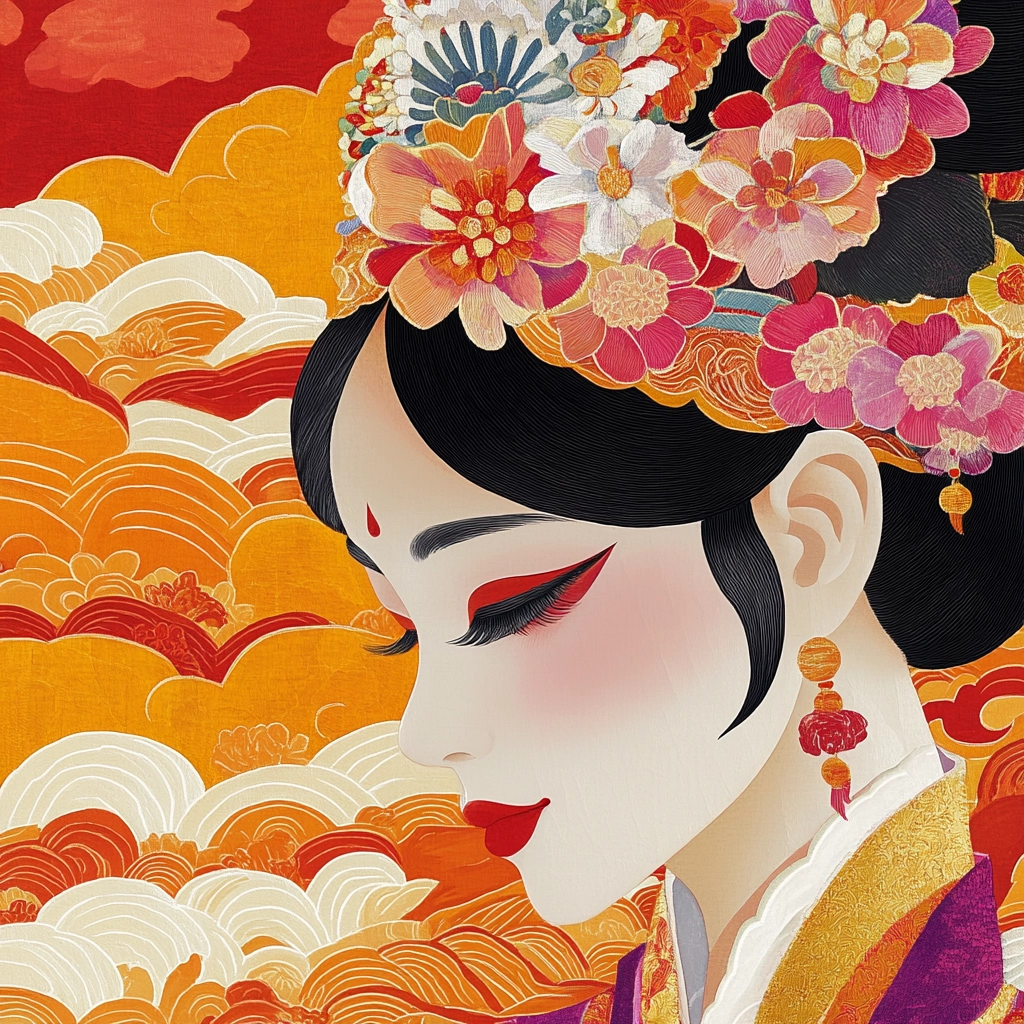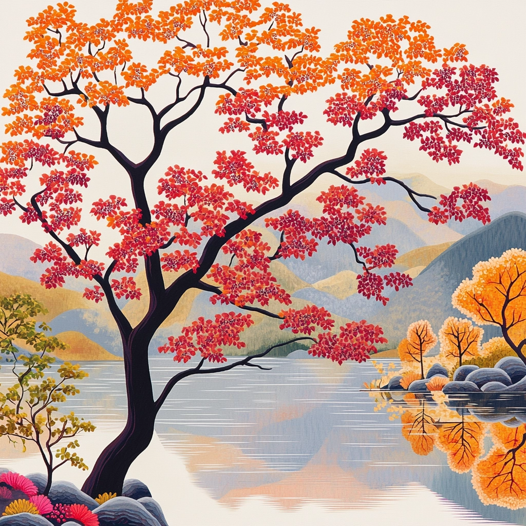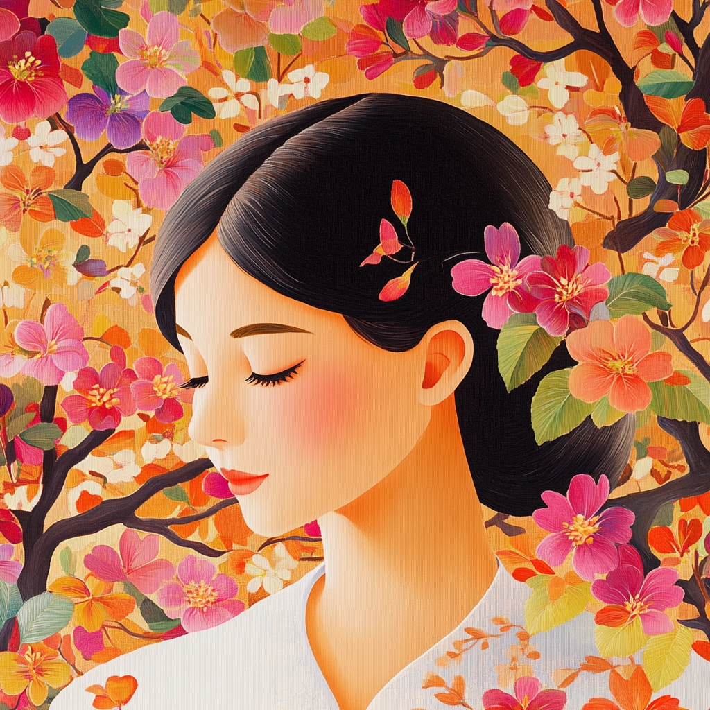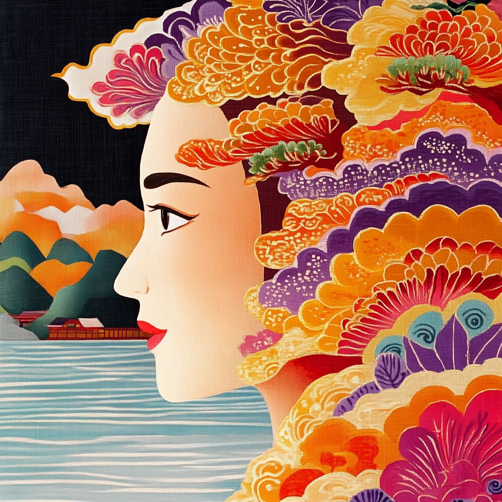 Vibrant tones with decorative nature motifs emphasize rhythmic patterns through dense layering.