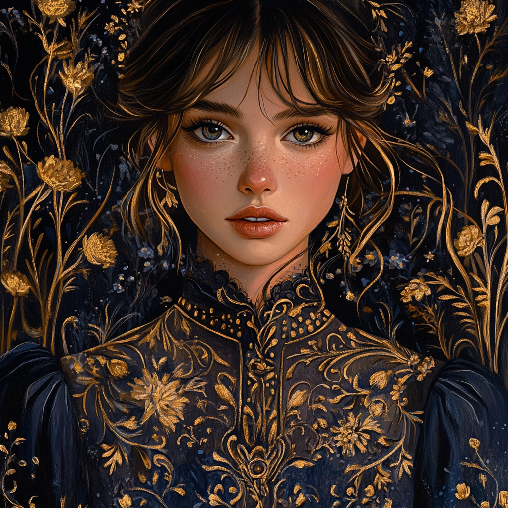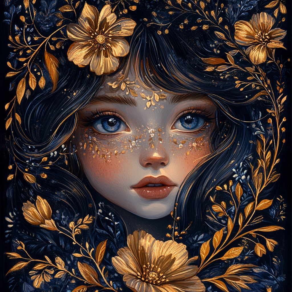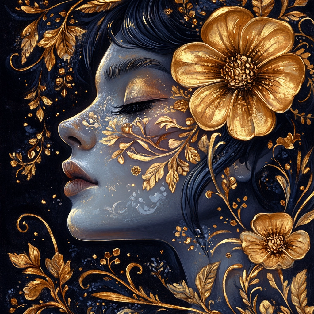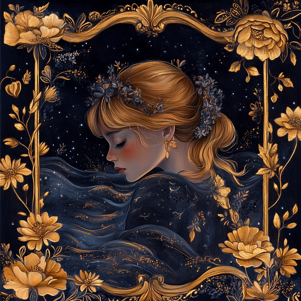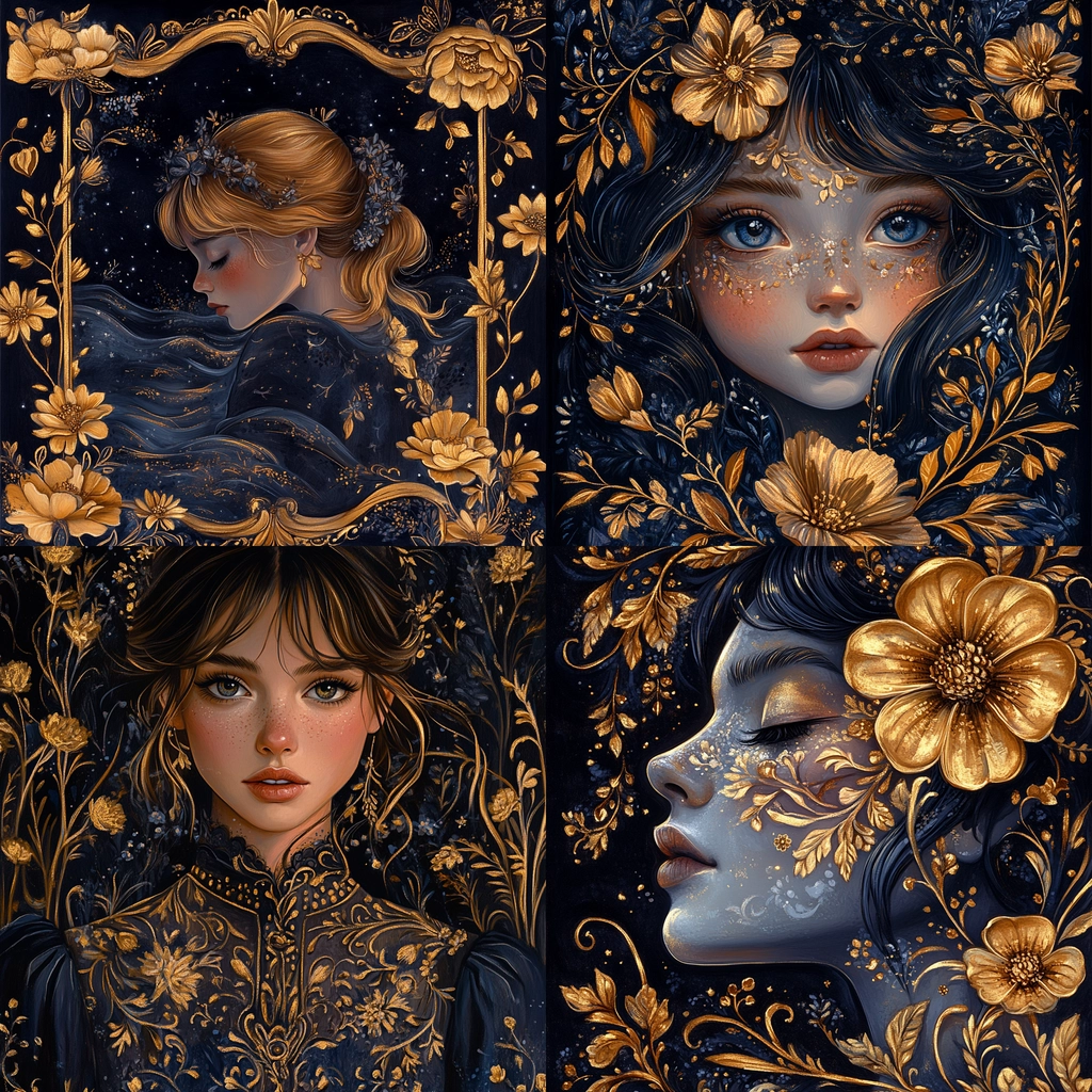 Lighting effects emphasize a rich contrast between dark blue backgrounds and glowing gold elements, enhancing the spatial depth and intricate texture of floral patterns.
