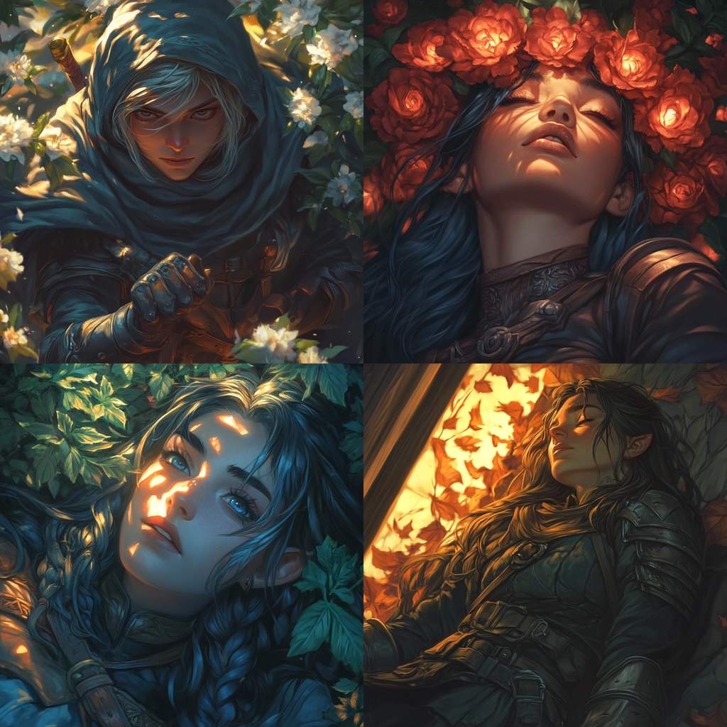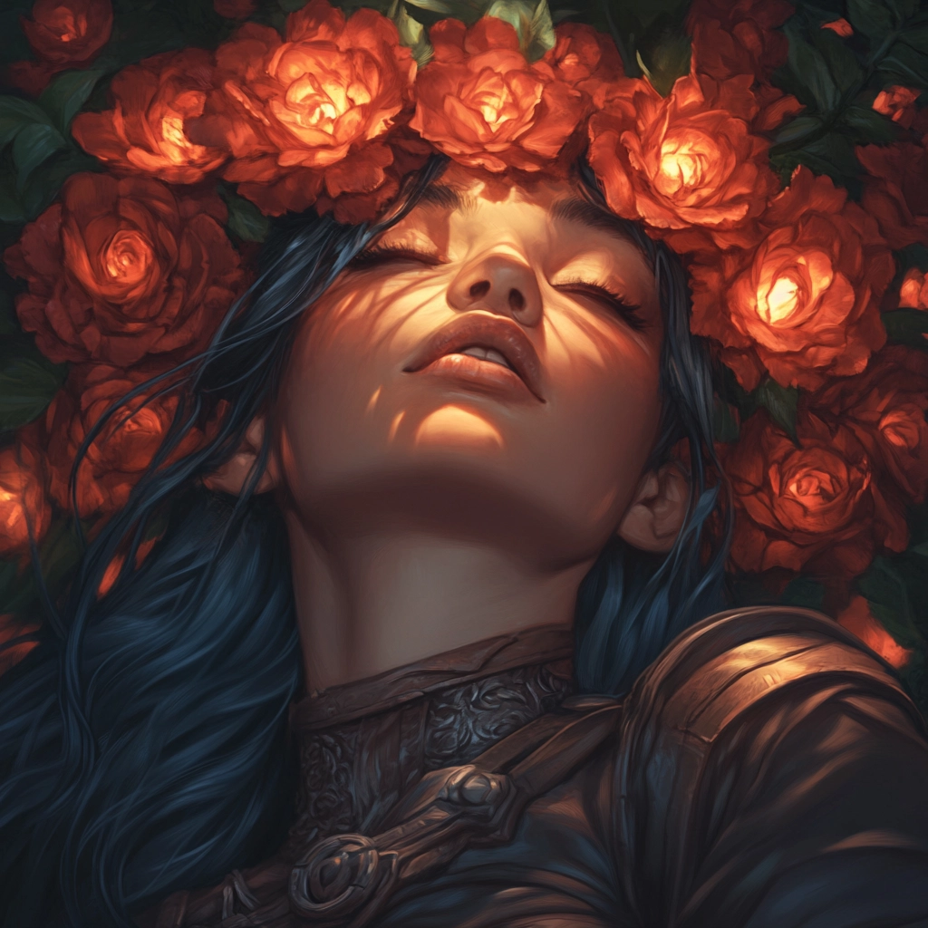 Vivid colors with intricate details juxtaposed against dramatic lighting.