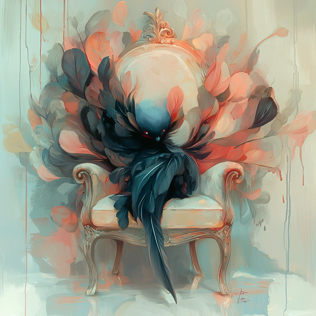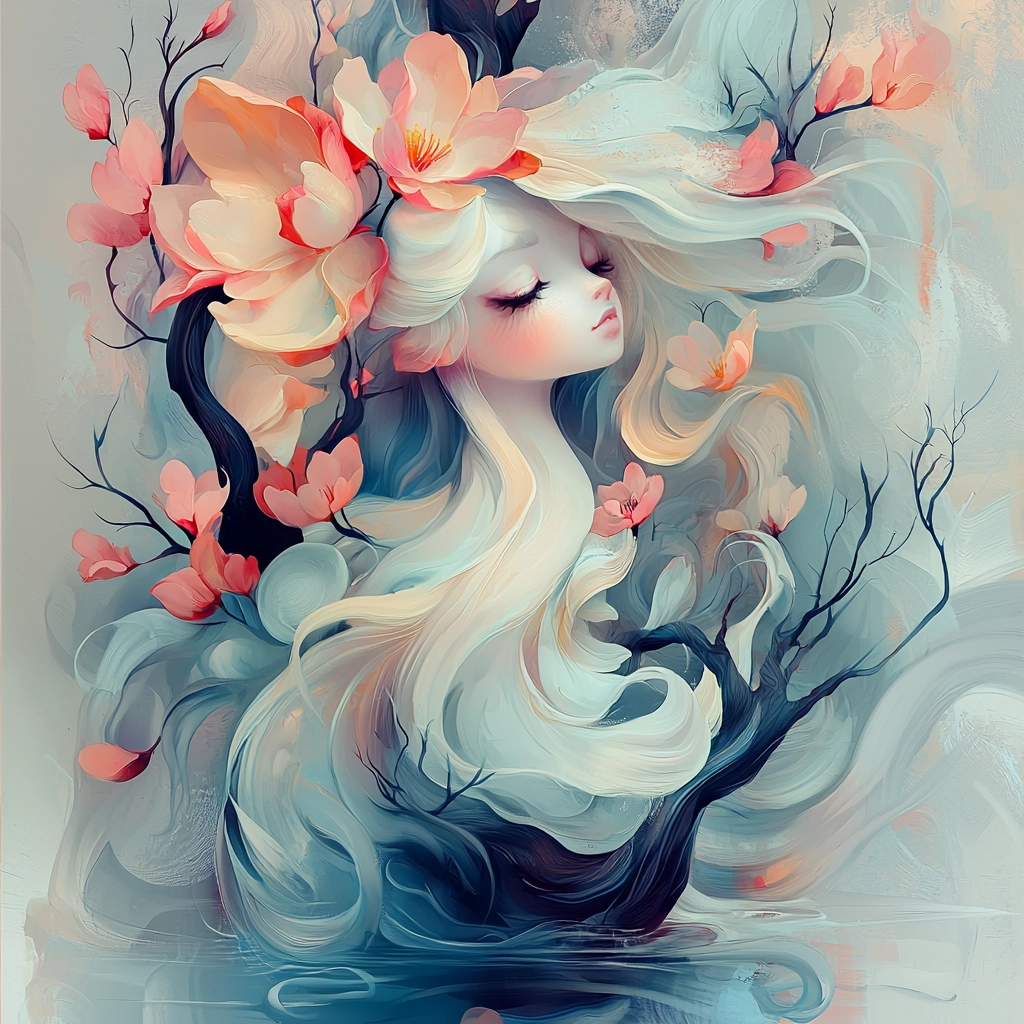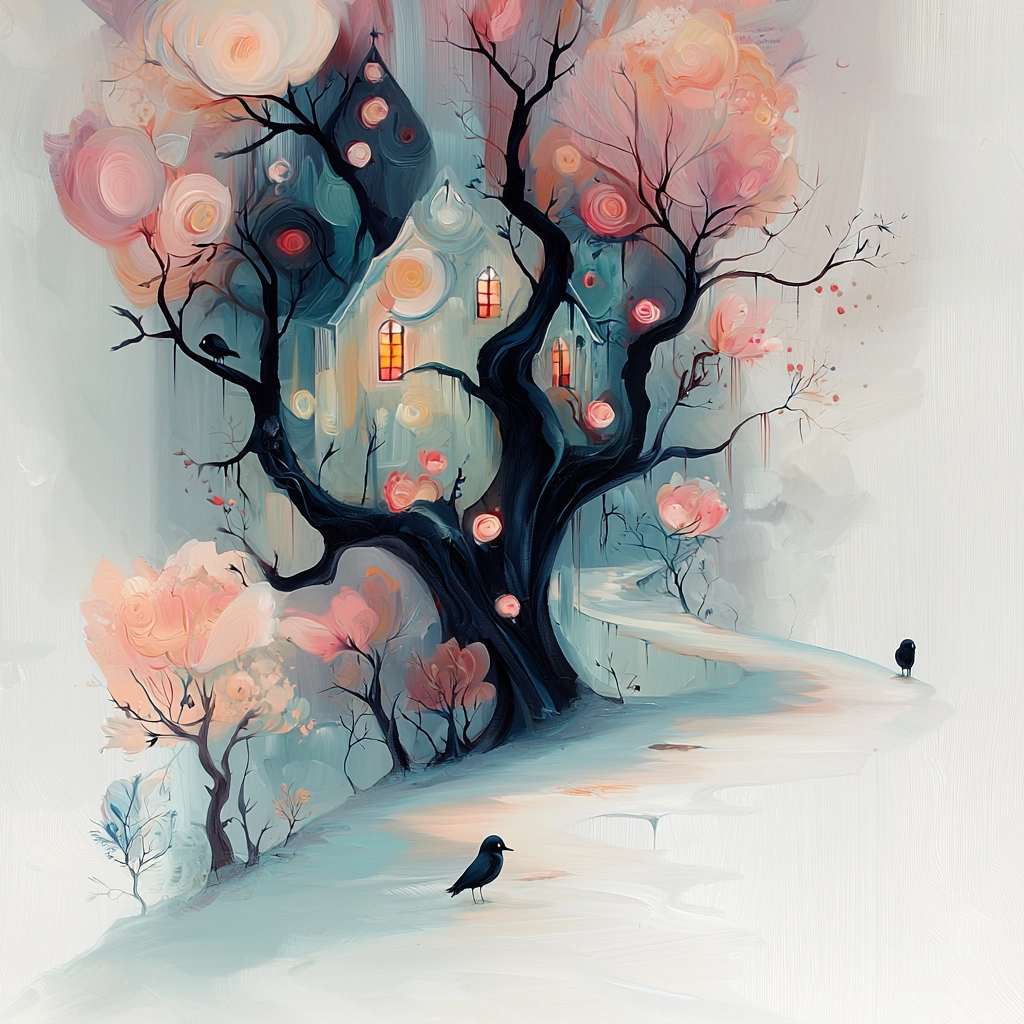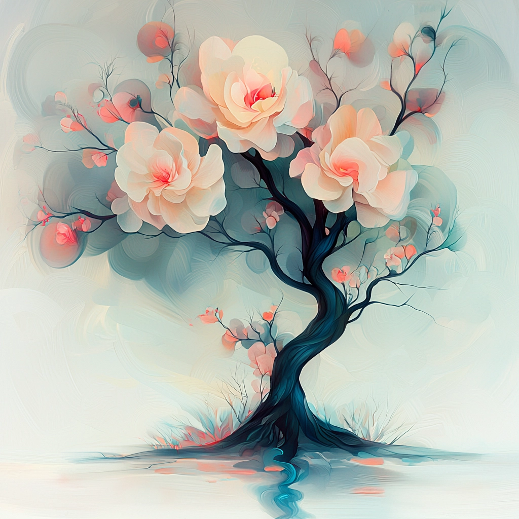 Soft lighting enhances the delicate pinks and blues, lending a fluid texture to the composition. The spatial arrangement feels open, inviting, with subtle brush strokes adding depth and clarity to the imagery, producing a harmonious effect.