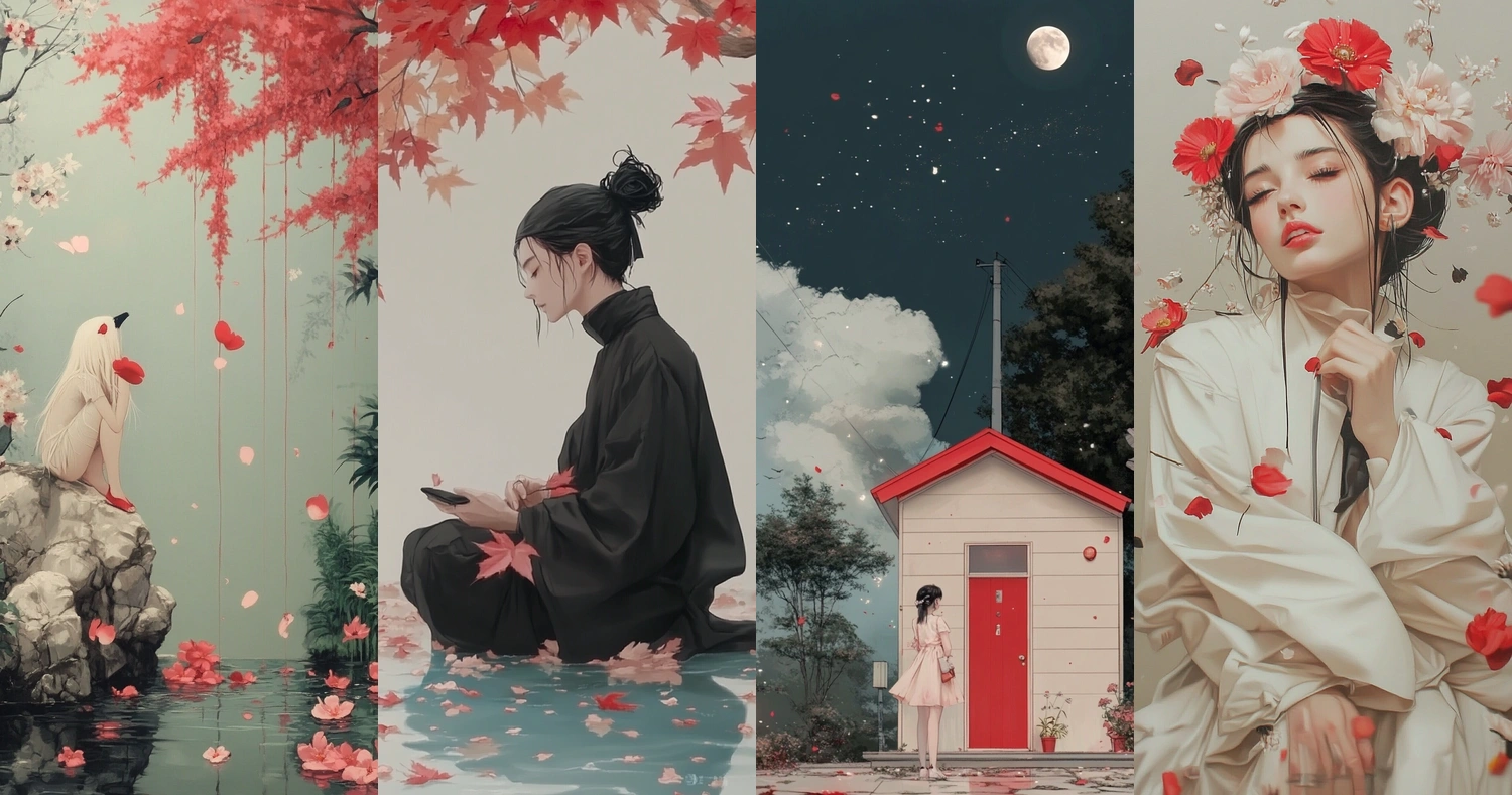 A harmonious blend of vibrant reds against soft whites, with a subtle presence of deep blacks creating a dynamic tension.