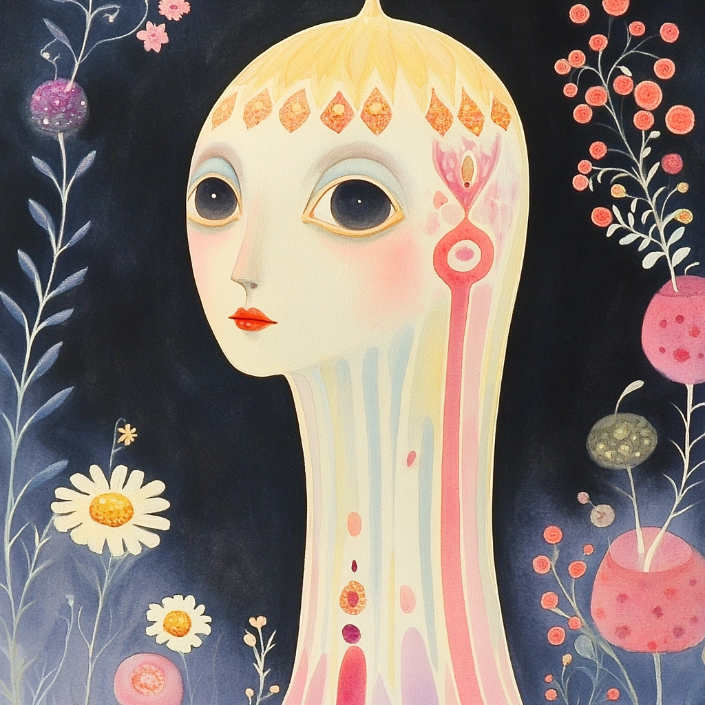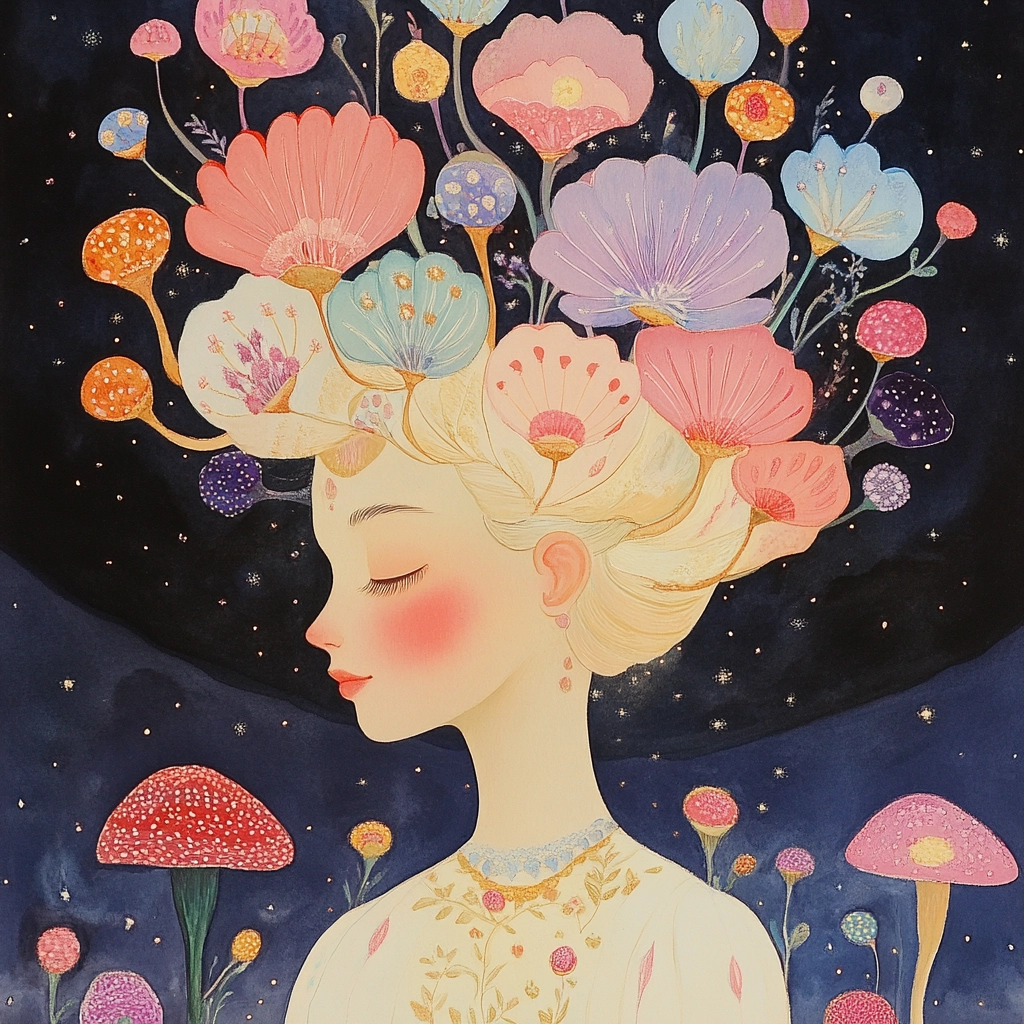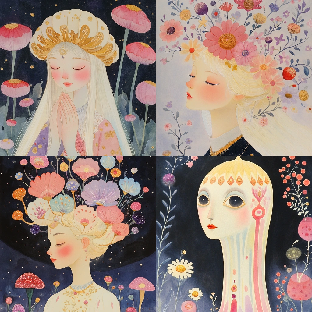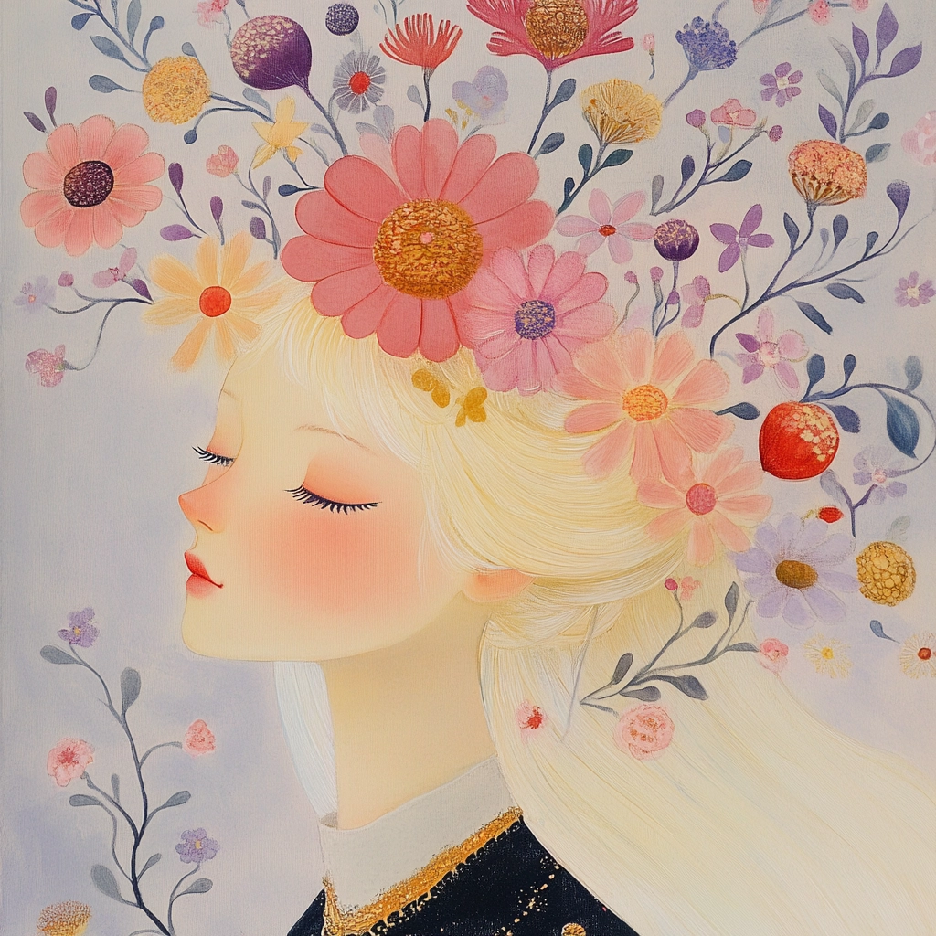 Whimsical compositions with pastel floral themes.