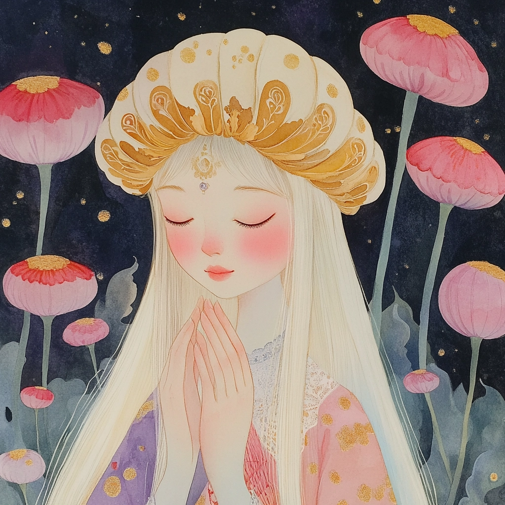 Delicate pastel colors dominate, with intricate floral motifs and soft, diffused lighting enhancing the dreamy yet structured spatial arrangement.