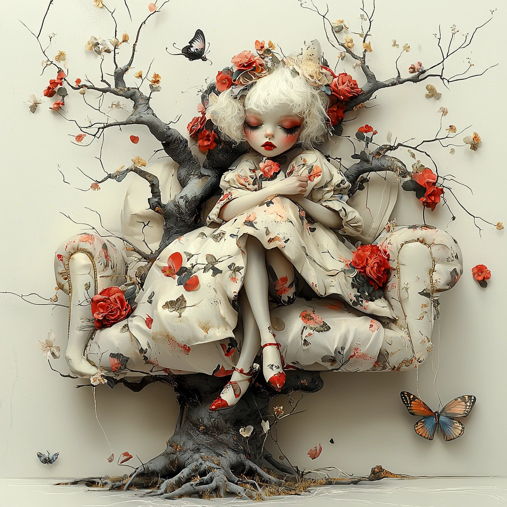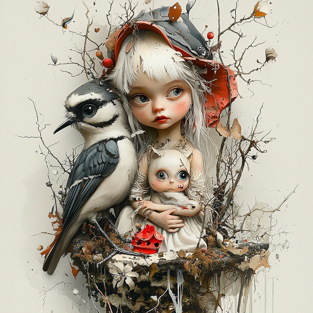 Lighting emphasizes contrasting colors while details are finely textured. Spatial depth is achieved through overlapping elements, while dynamic textures add vibrancy and movement. Composition benefits from intricate and decorative details.