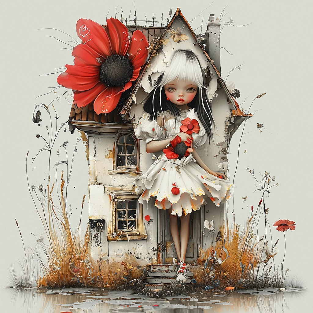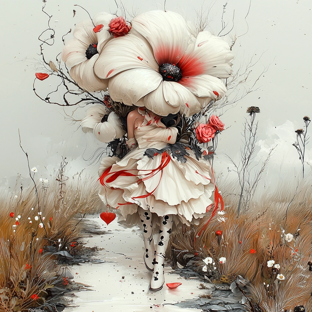 Rich reds and whites contrast against intricate brown elements, creating a distinct and engaging scene.