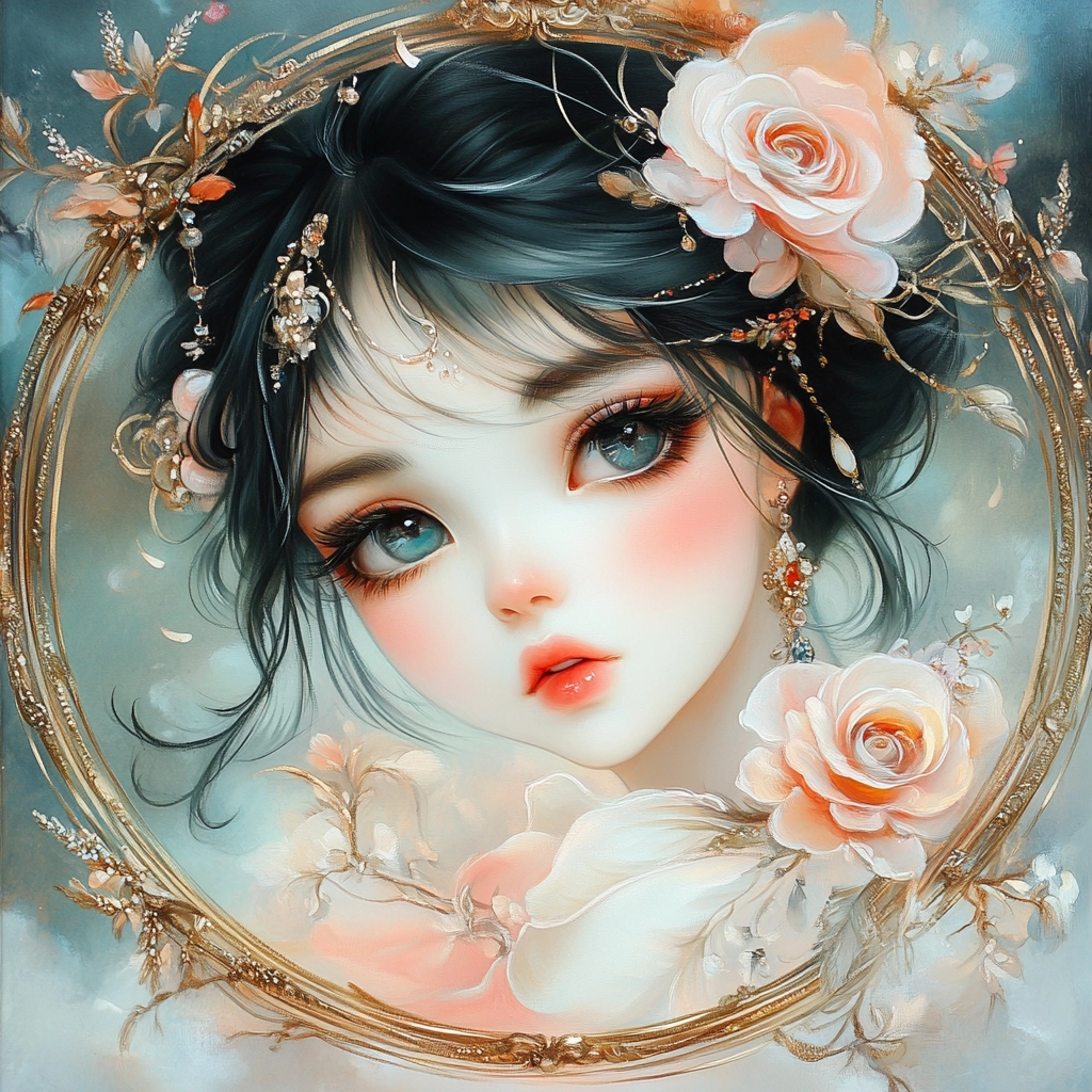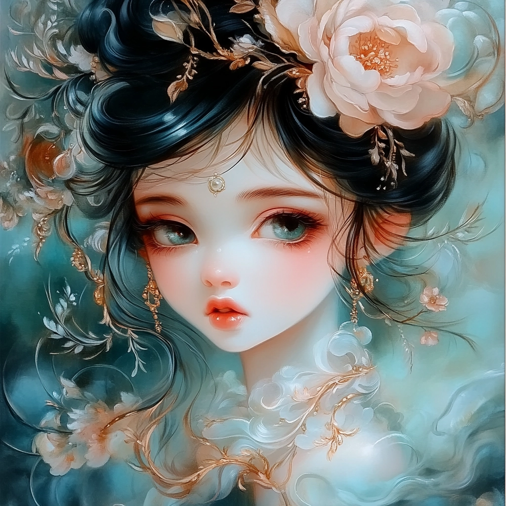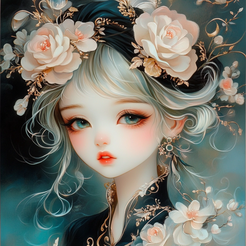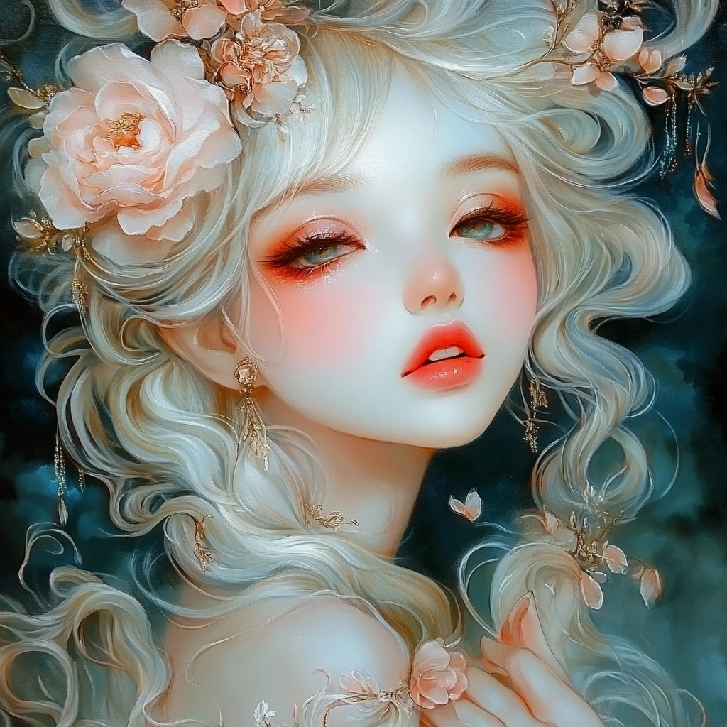 Soft lighting enhances the delicate pastel colors, while fluid shapes create a sense of movement and grace. The textures are lush, with meticulous detailing in the flowing elements and floral motifs, conveying a seamless blend of natural beauty and artistic finesse.