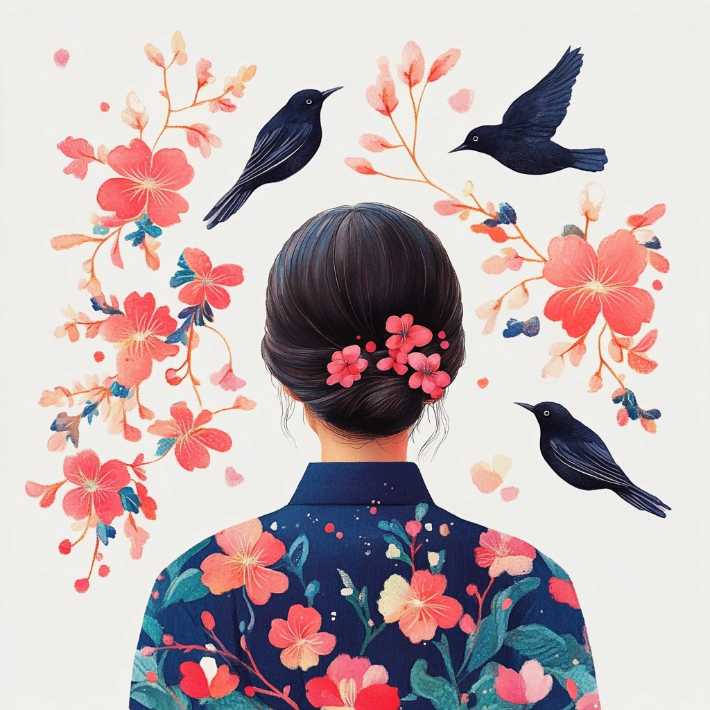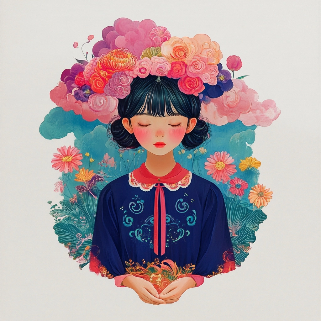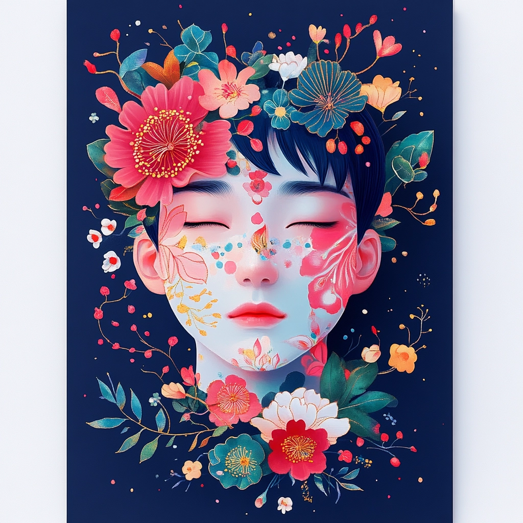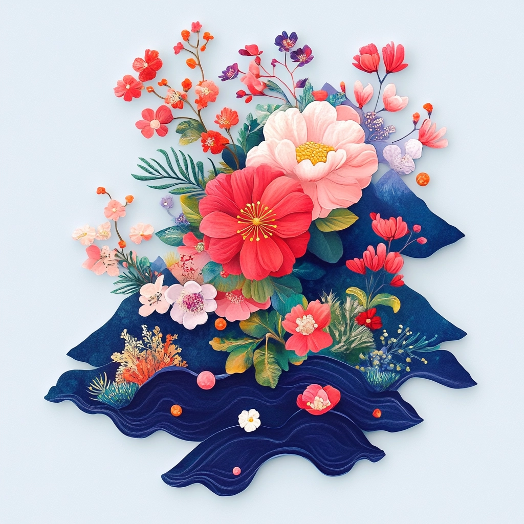 Rich, layered textures evoke a tactile quality, while vibrant pink and orange tones pop against a deep blue background. Delicate lighting highlights detailed floral patterns and creates a sense of depth.