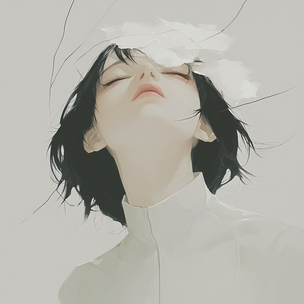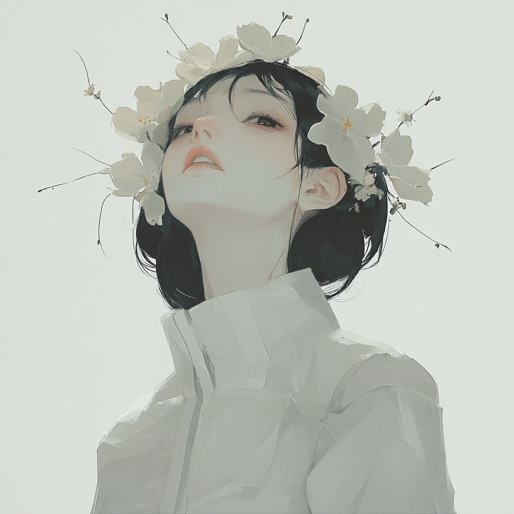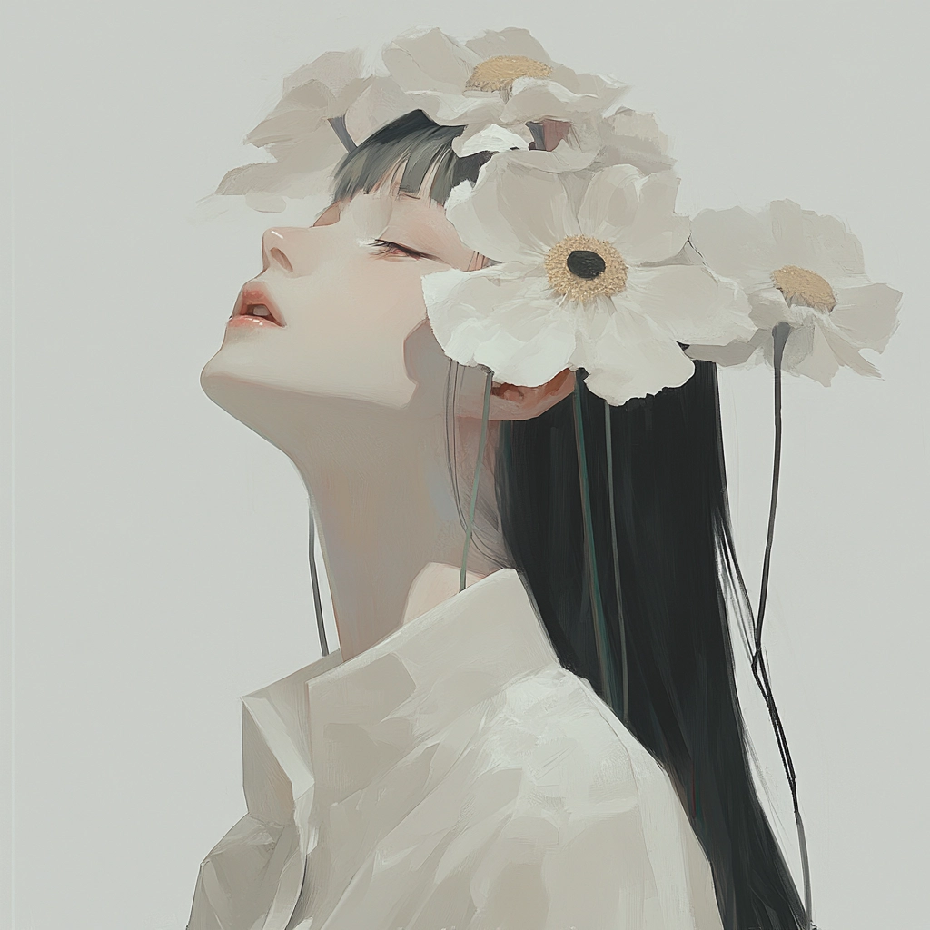 The use of soft lighting creates subtle gradients and gentle shadows, highlighting the delicate floral textures. The color palette is restrained, focusing on muted whites and grays to convey depth while maintaining simplicity. The spatial arrangement provides a sense of quiet elegance, enhanced by the interplay between solid forms and intricate natural details.