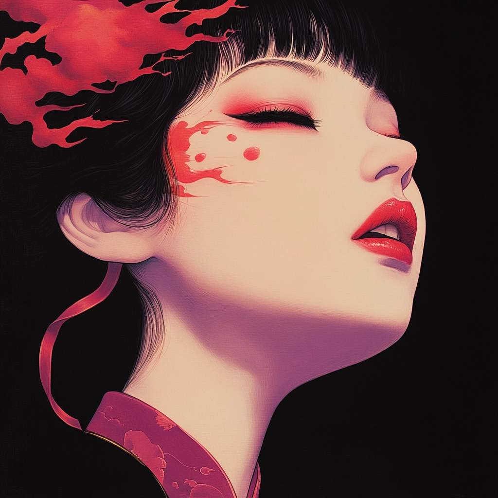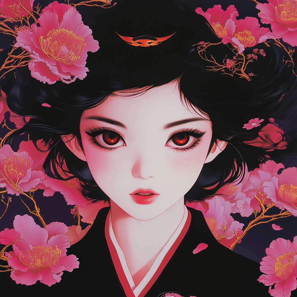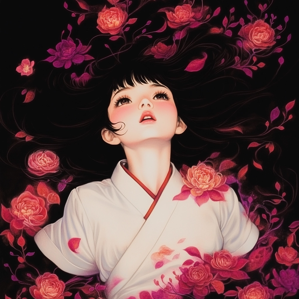 Intricate floral motifs contrast with deep backgrounds, combining vivid hues and serene lines.