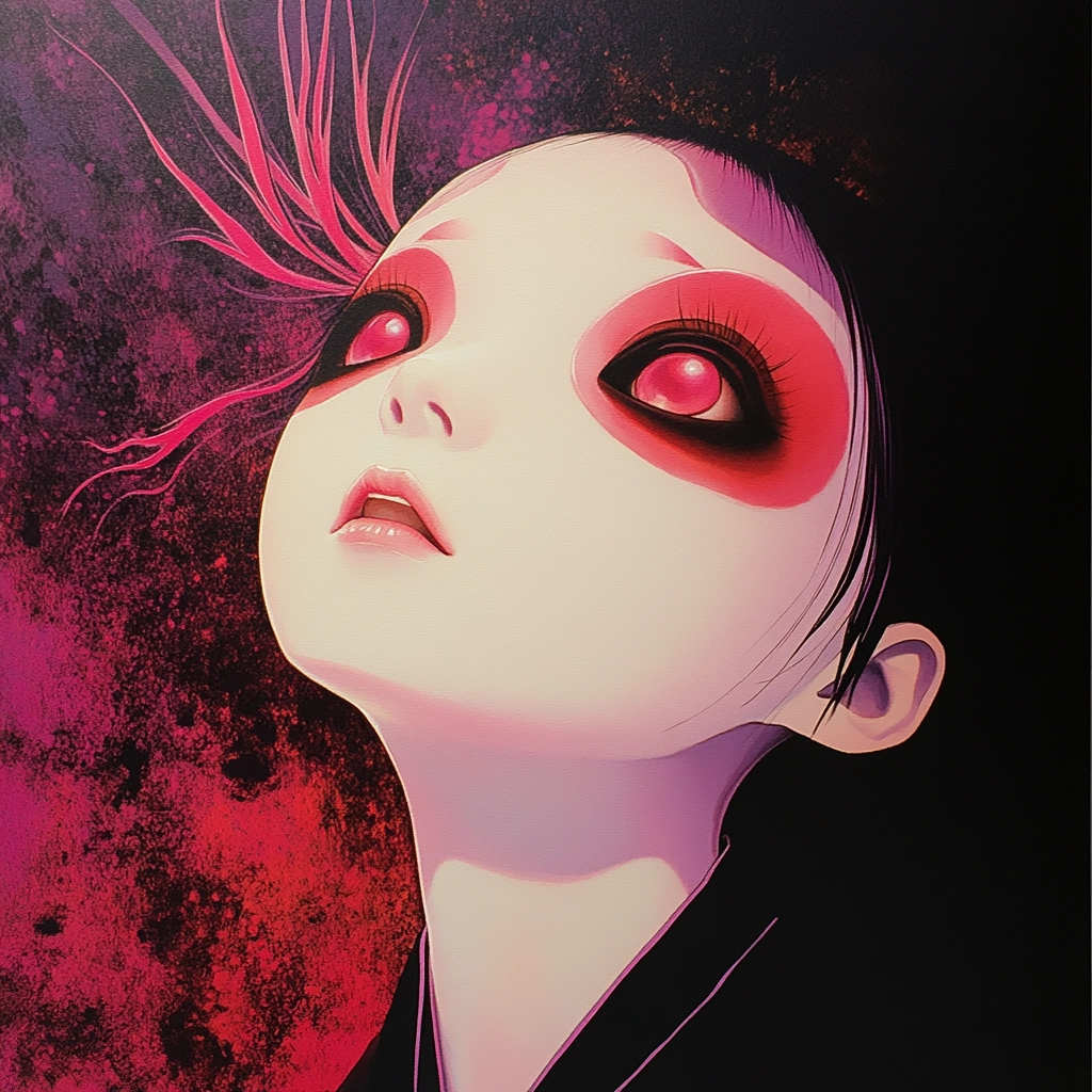 The artwork features strong lighting that highlights the vivid red and pink hues against a neutral black background, creating a pronounced sense of depth. Flowing lines and finely detailed textures give the appearance of motion and richness to the floral patterns.