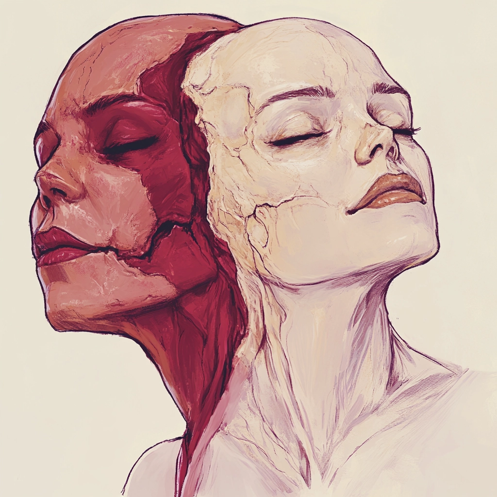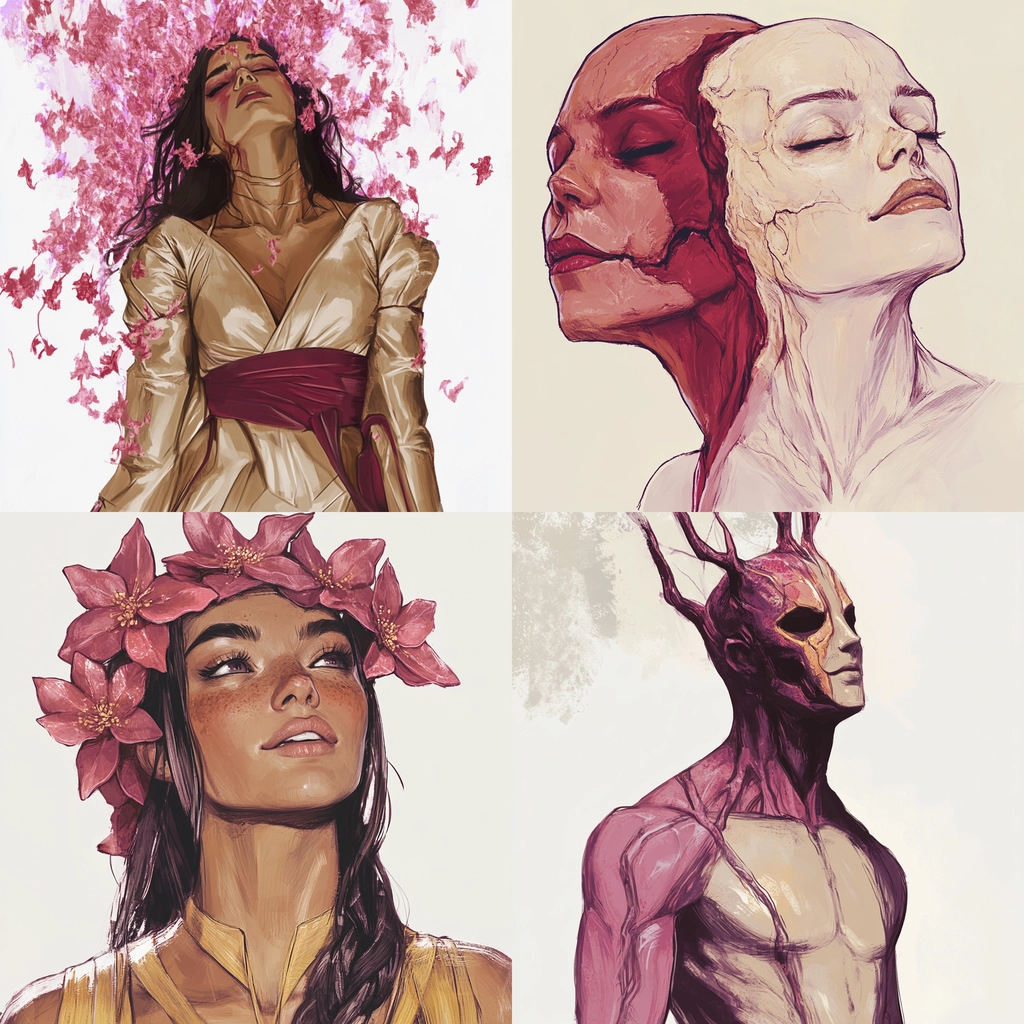 The lighting creates a soft glow on the subjects, enhancing the vibrancy of the pink and wine red hues against the beige background. The use of texture brings a tactile quality to the floral and fabric surfaces, while the spatial arrangement provides a balanced composition.