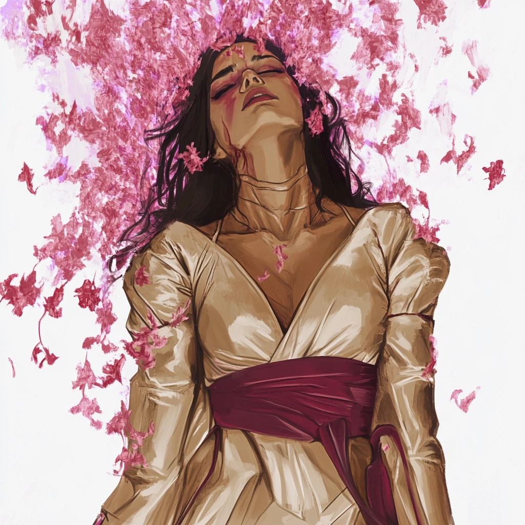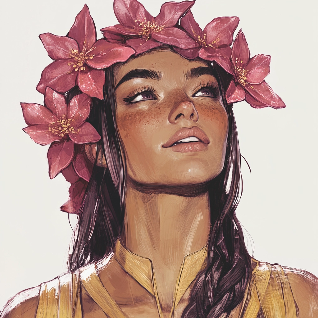 The scene integrates delicate floral elements with vibrant color contrasts.