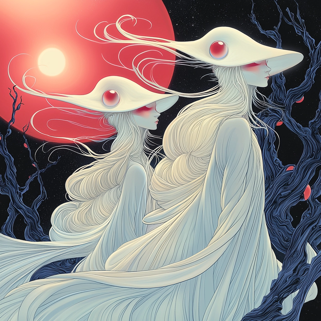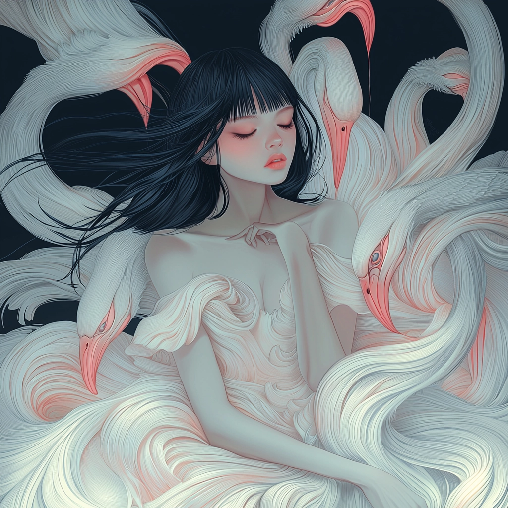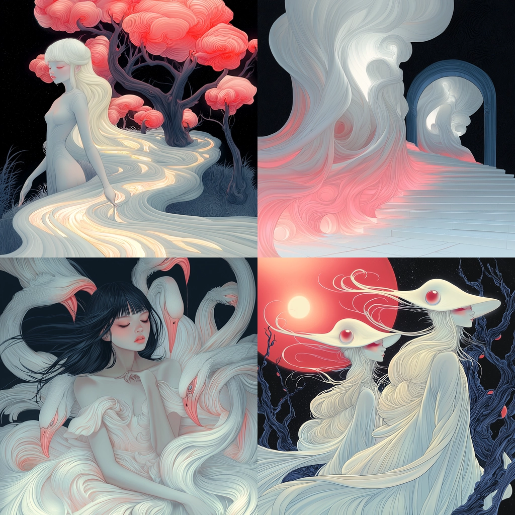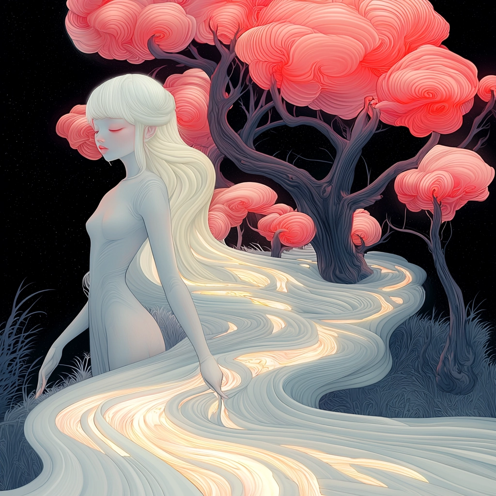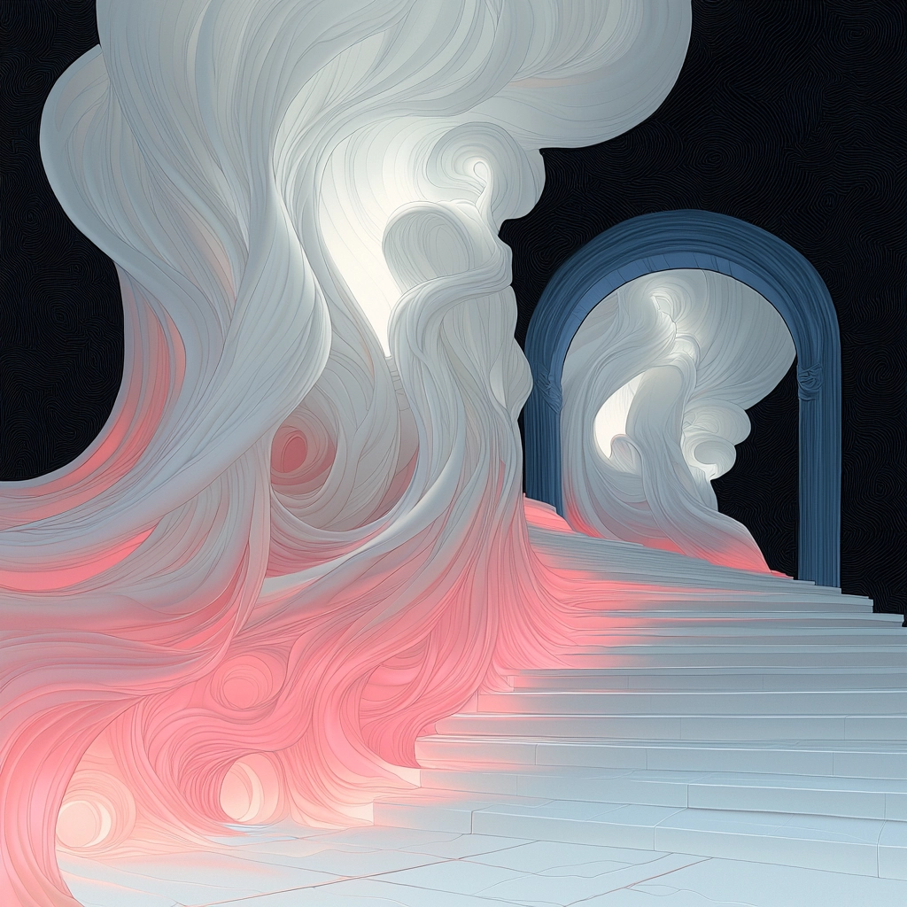 The lighting emphasizes flowing lines, creating glowing effects against dark backgrounds. Colors blend seamlessly, with dominant whites accented by vibrant pinks. There's a mystical contrast between illuminated forms and deep, dark spaces, enhancing the fluid texture.