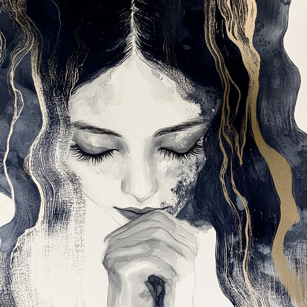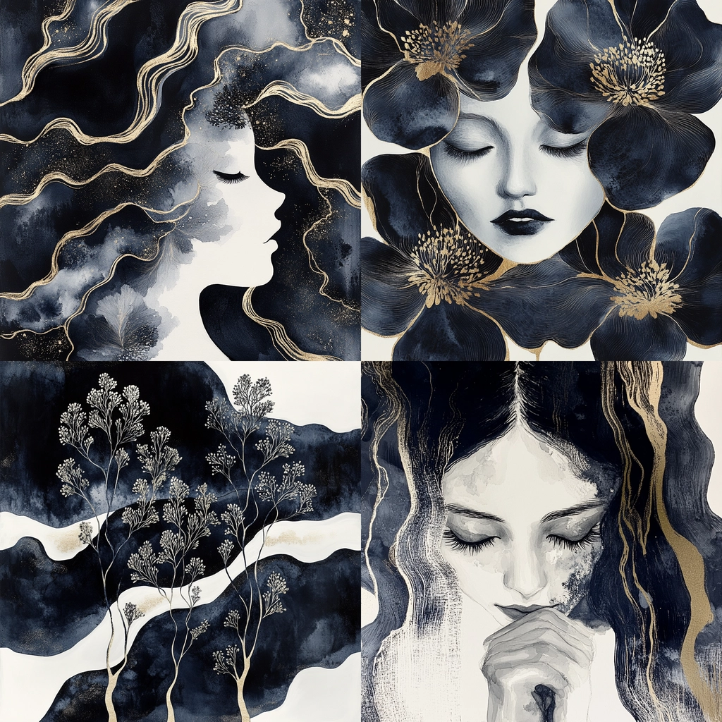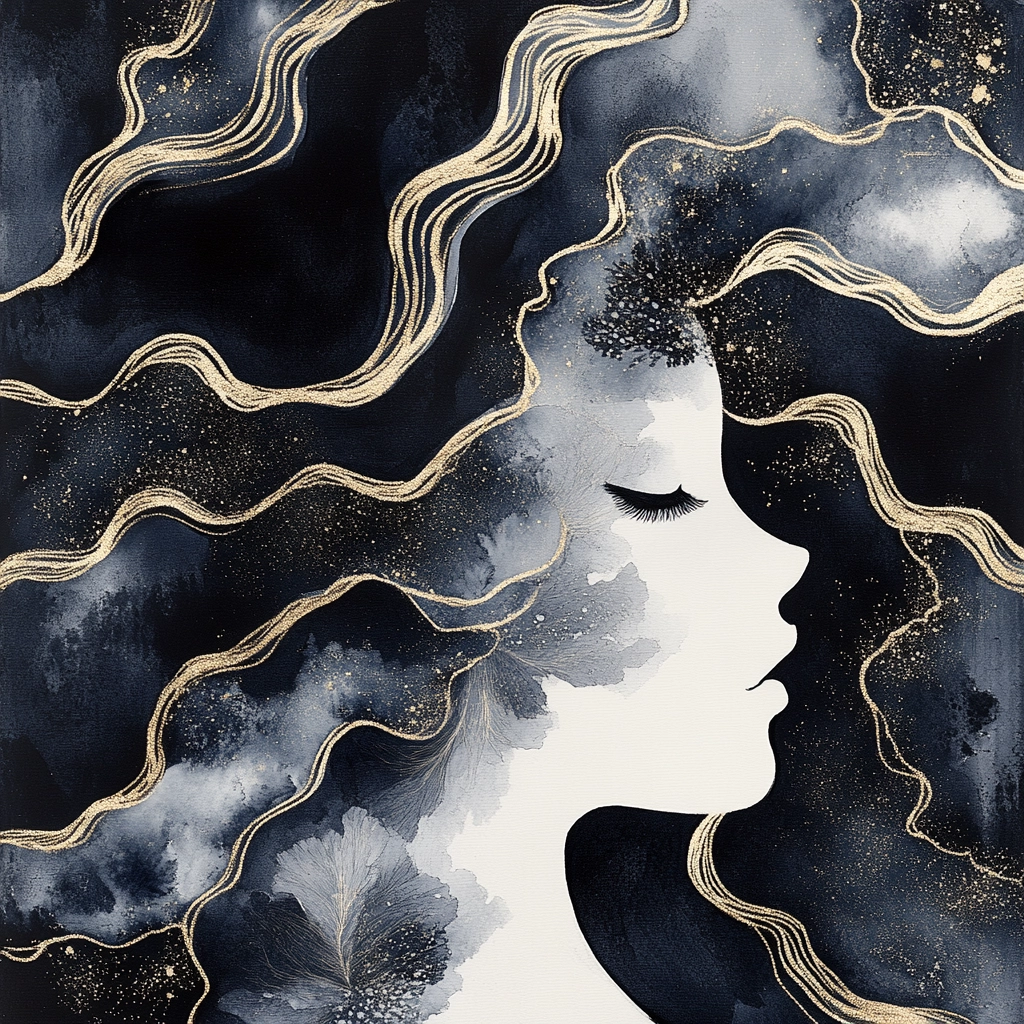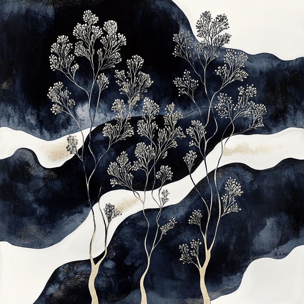 The artwork makes use of flowing dark blue lines accentuated by gold highlights, creating a sense of movement and texture. The composition is enhanced by contrasting light and dark elements, giving a dynamic spatial sense that is richly textured and detailed.