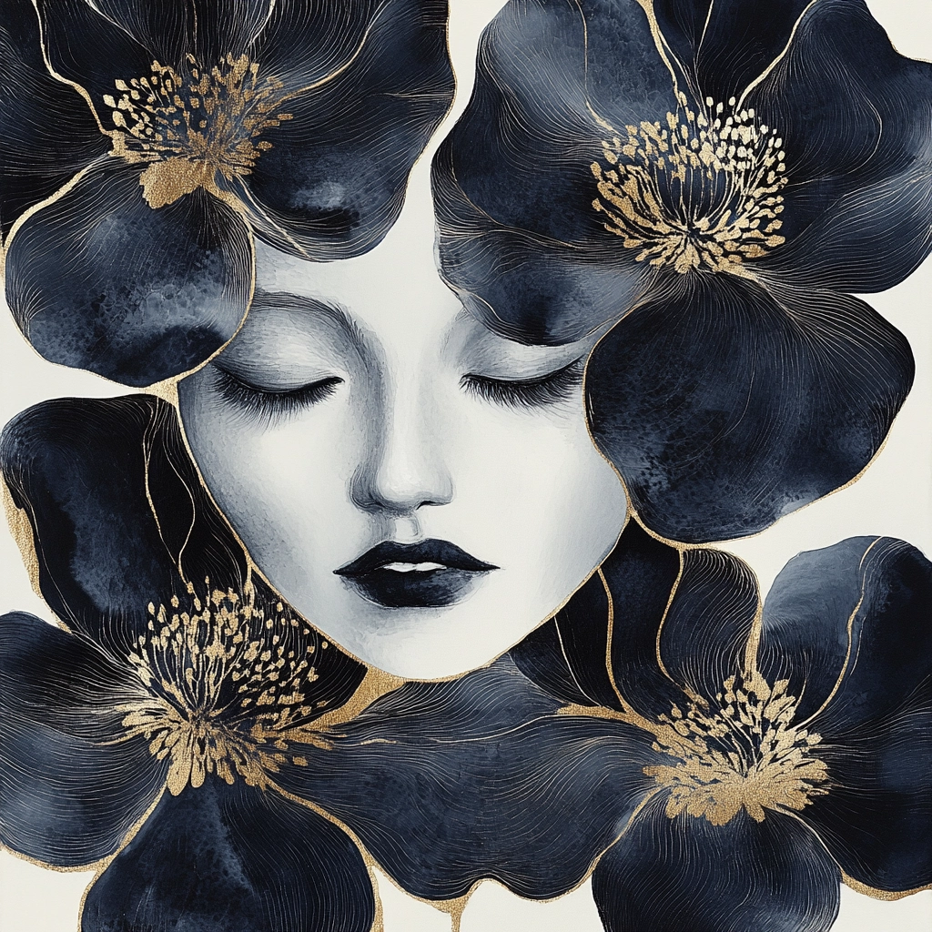 Curved dark blue patterns with gold highlights form an intricate composition.