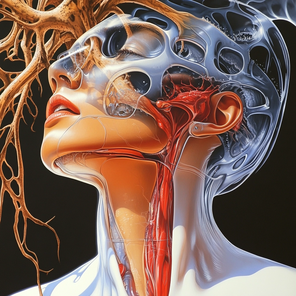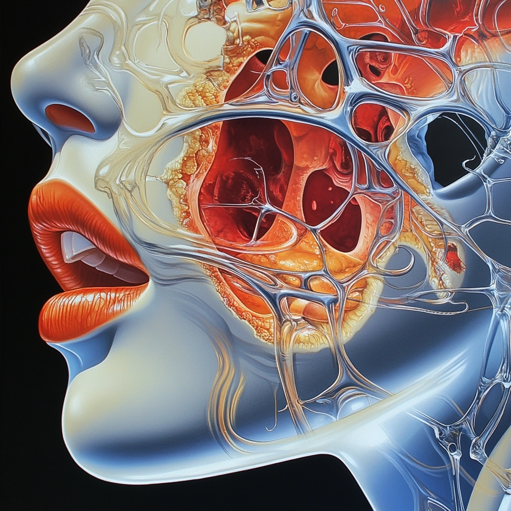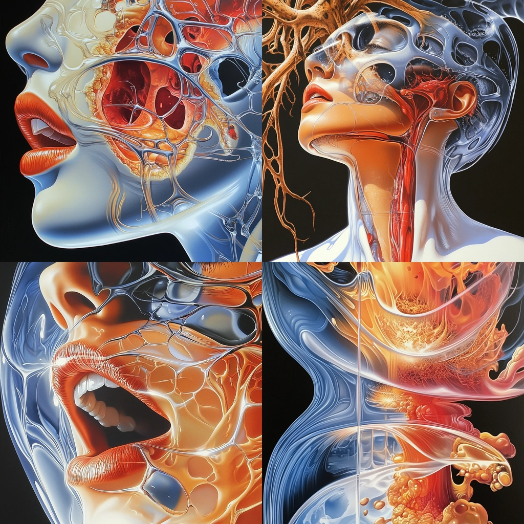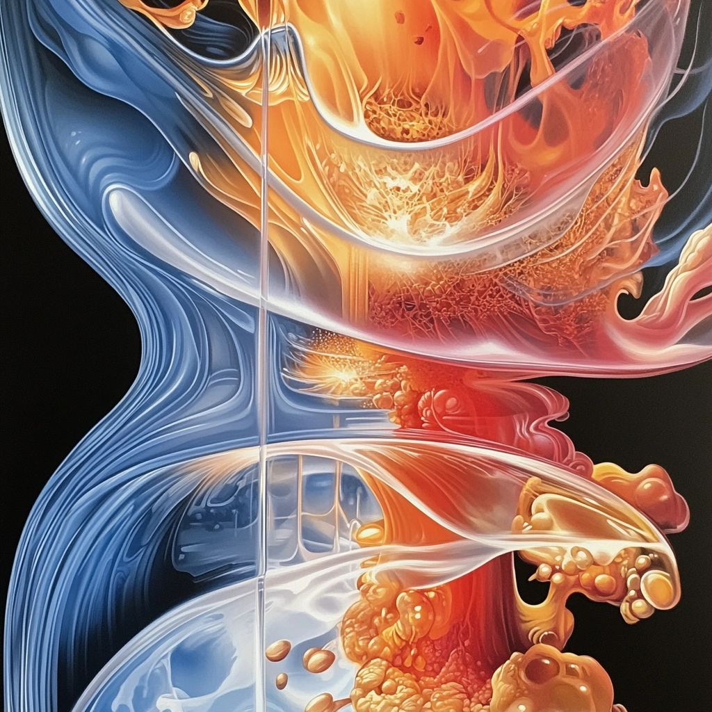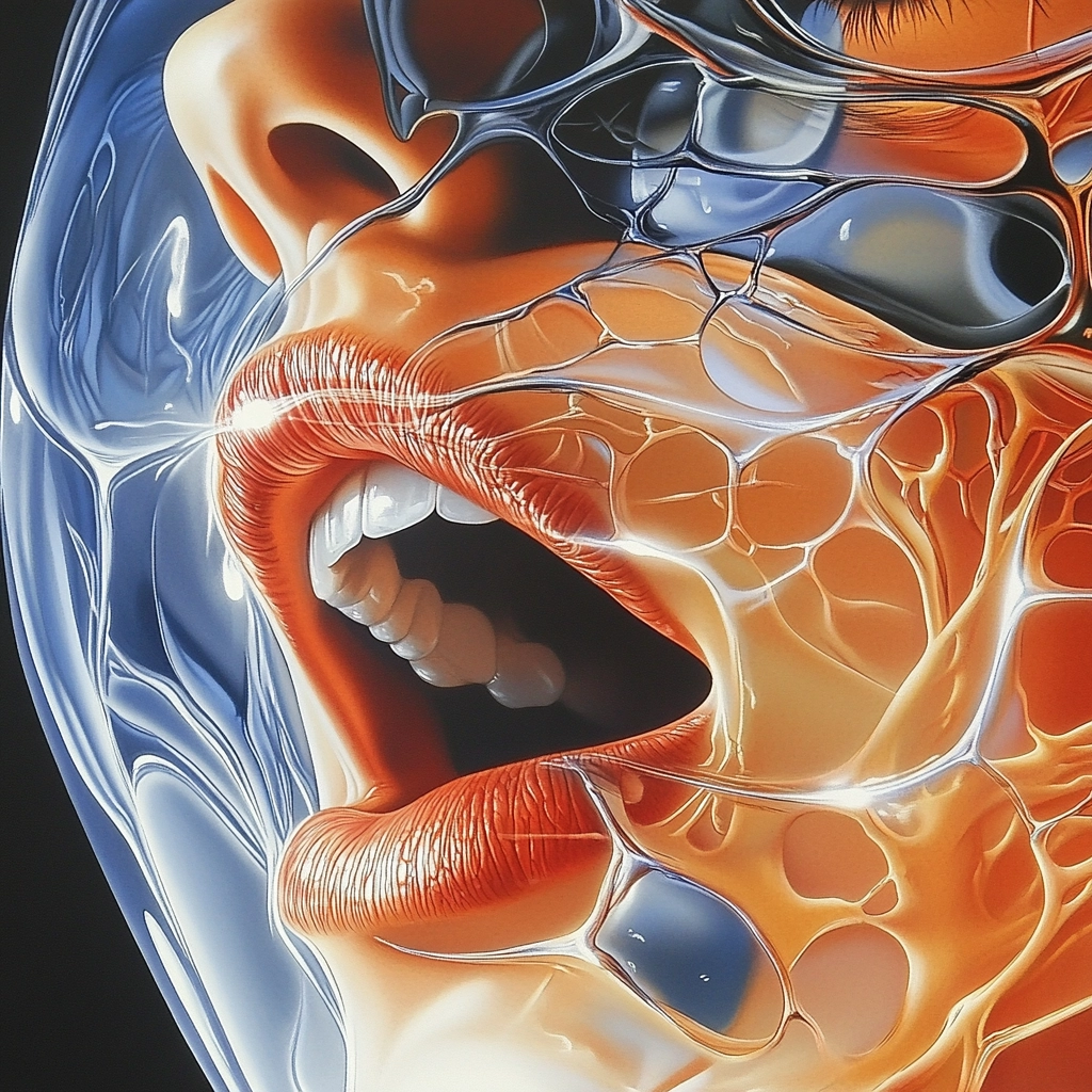 High gloss and reflective surfaces emphasize the vivid color transitions and the optical play between the smooth and intricate textures. Lighting creates a dramatic contrast that accentuates the fluid, almost flowing quality of the organic shapes, manipulating spatial perception.