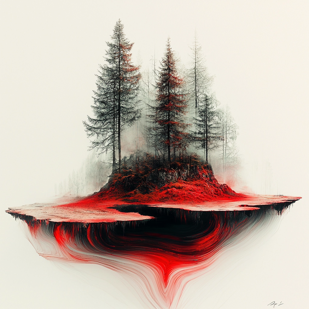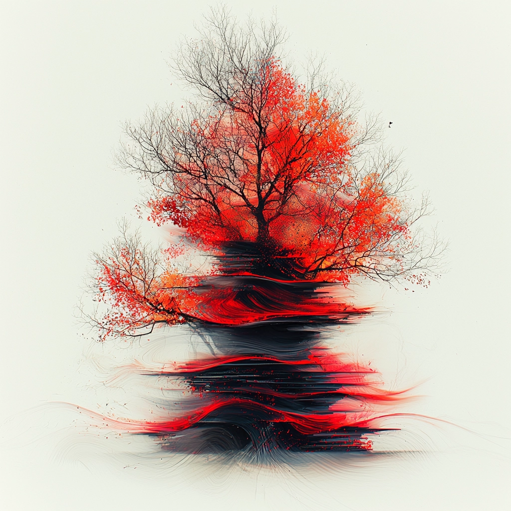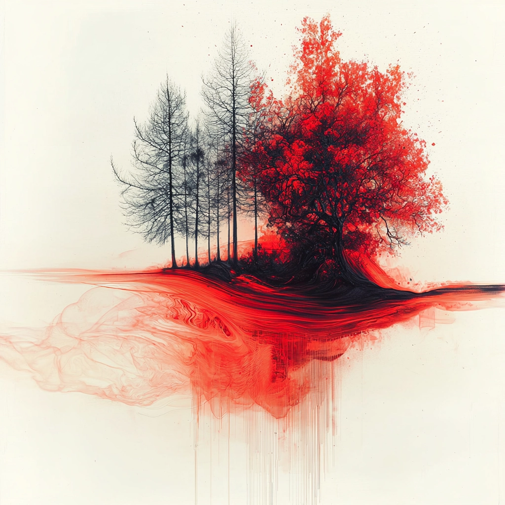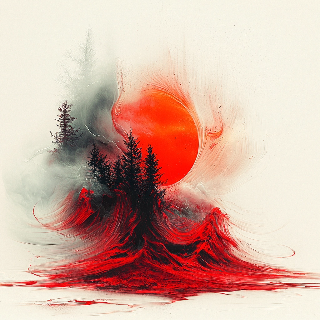 The lighting emphasizes the contrast between vibrant reds and deep blacks, with a fluid, swirling texture that conveys motion. A sense of depth is achieved through layered brushwork and a subtle play of shadow.
