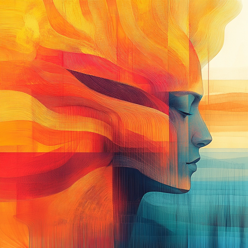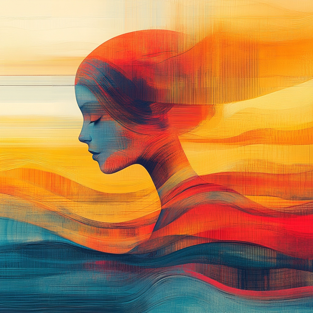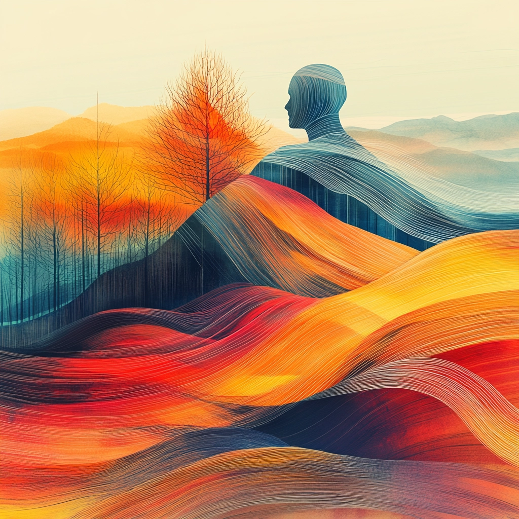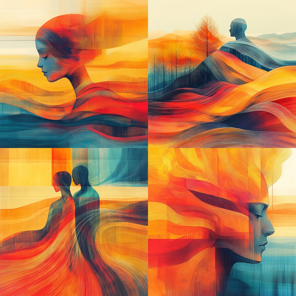 The images utilize bold, sweeping lines and warm color gradients, creating a sense of motion. Lighting effects highlight contours, while textures appear smooth and continuous. Spatial relationships reflect depth and layering through color transitions.