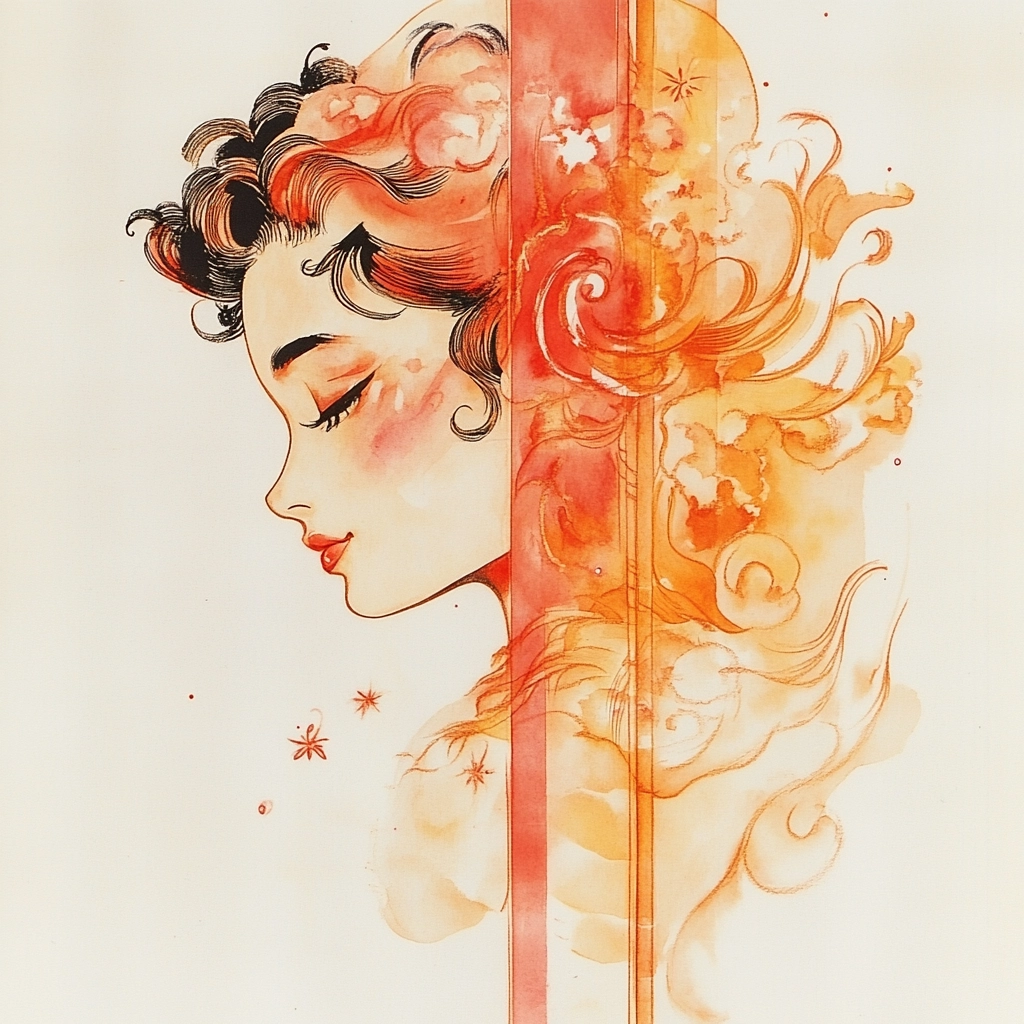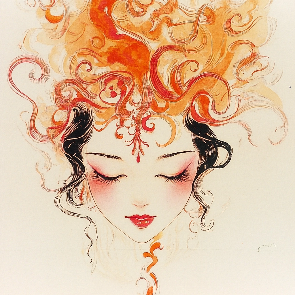 The lighting reveals bright contrasts, with swirling orange hues overlaid on textured black and red elements. The dynamic flow shapes create a sense of motion and depth.