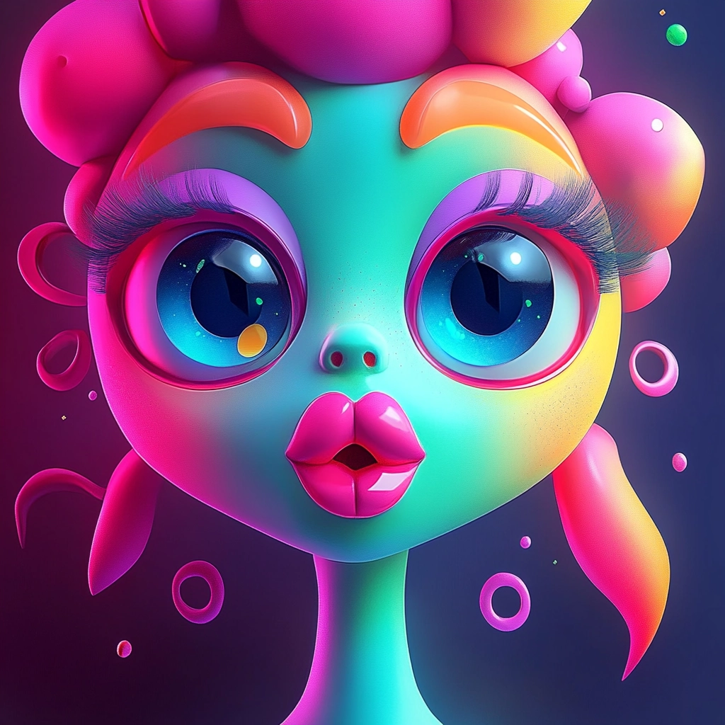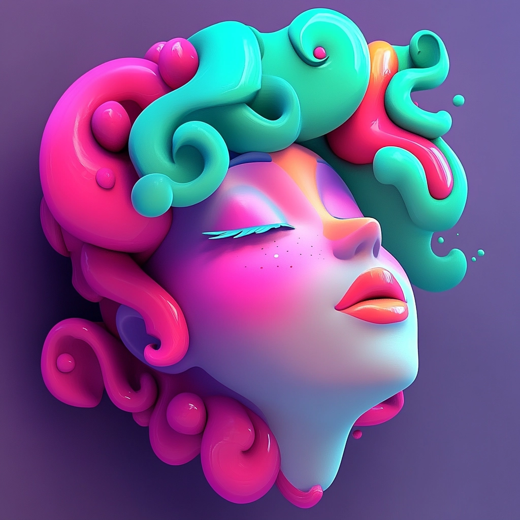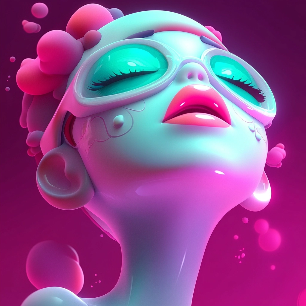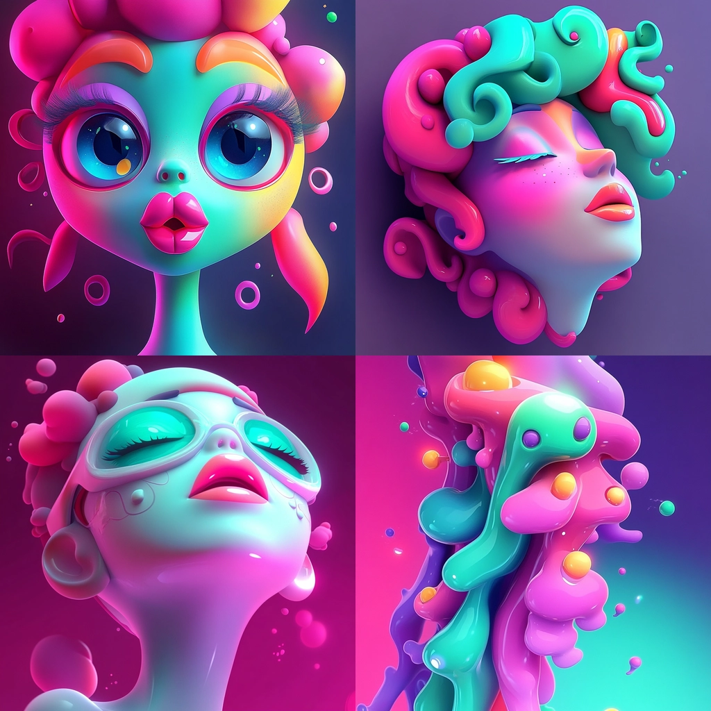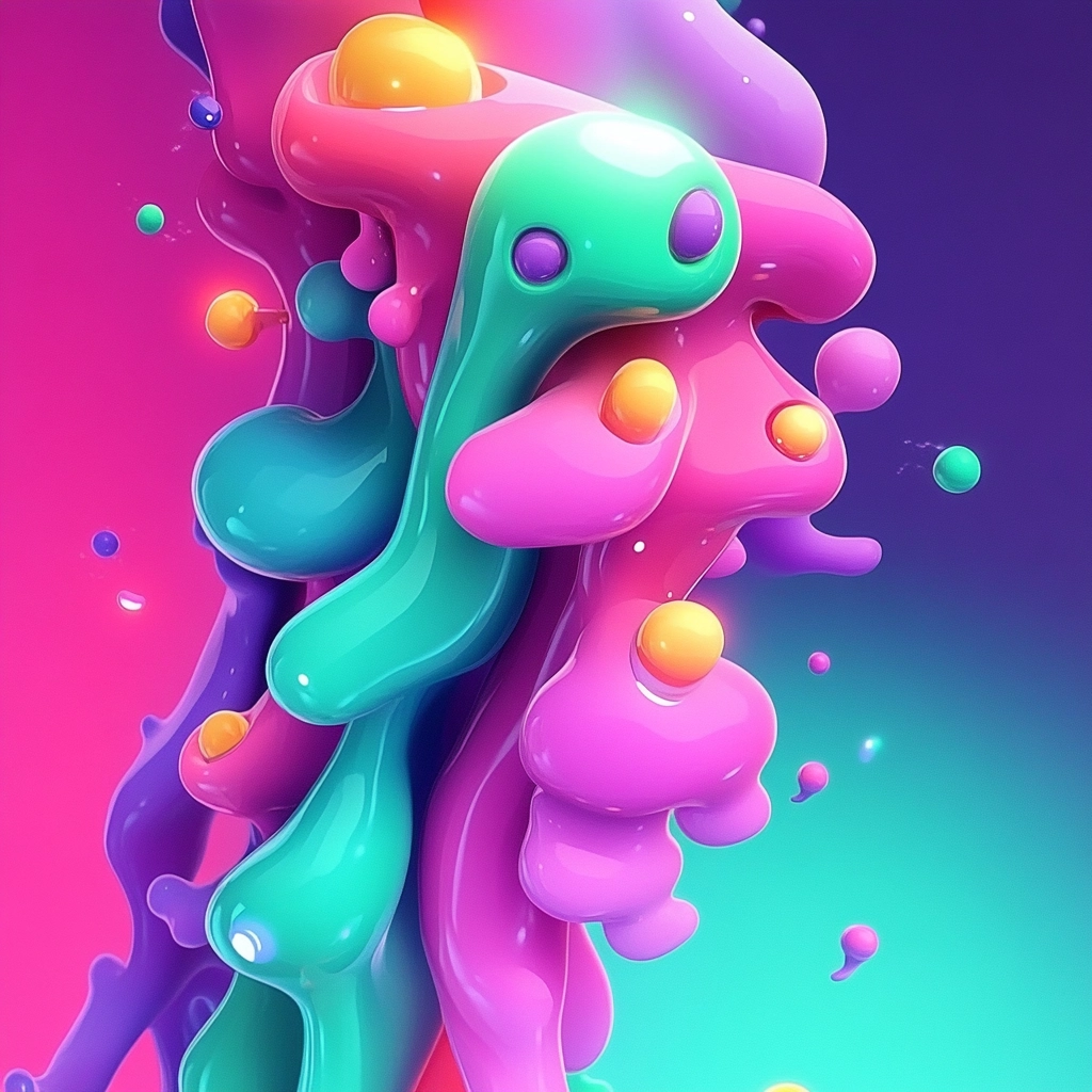 The lighting effects emphasize the glossy, wet textures of the forms, with a high level of contrast between the bright fluorescent colors. There is a clear sense of depth and volume, accentuated by the smooth transitions between light and shadow on the contoured surfaces.