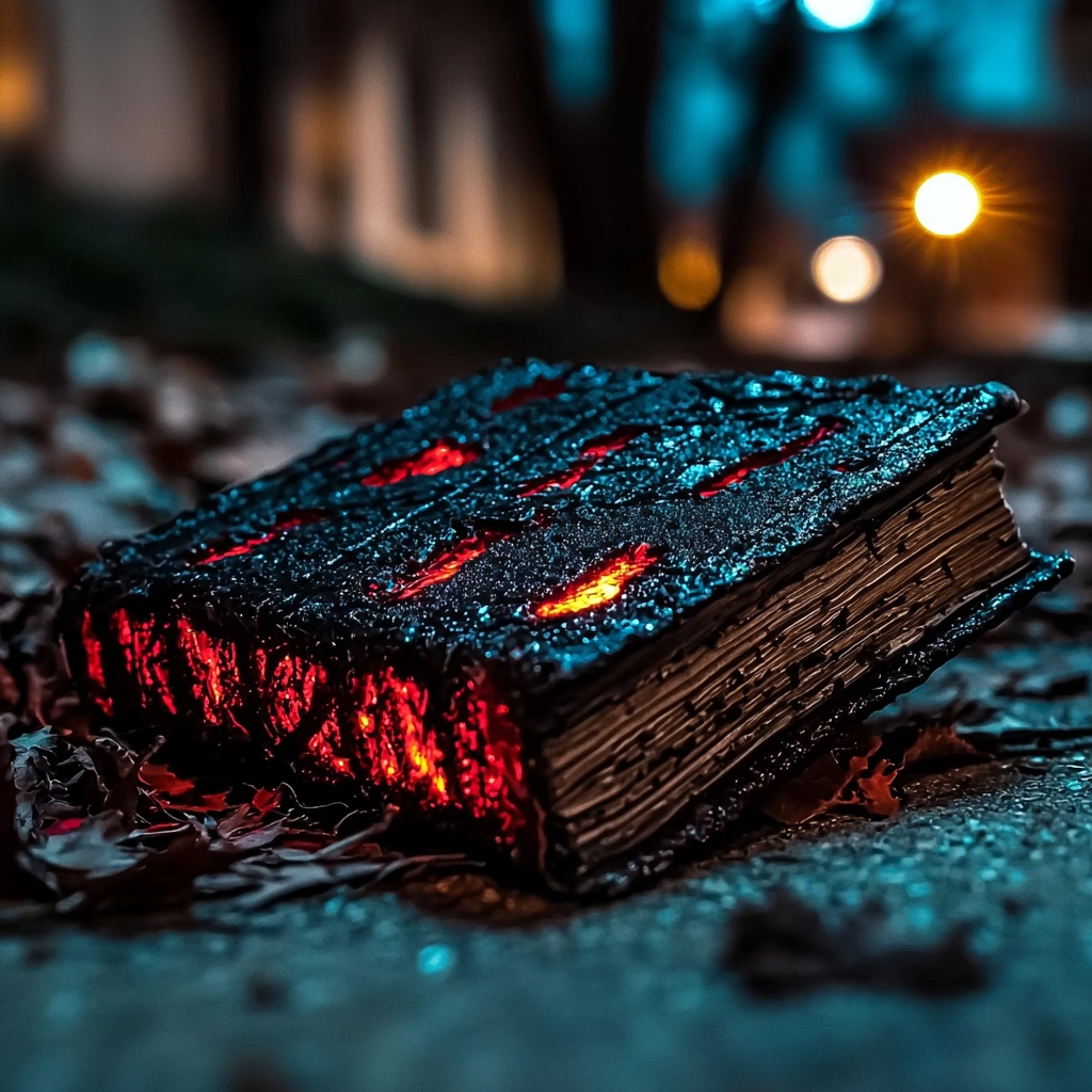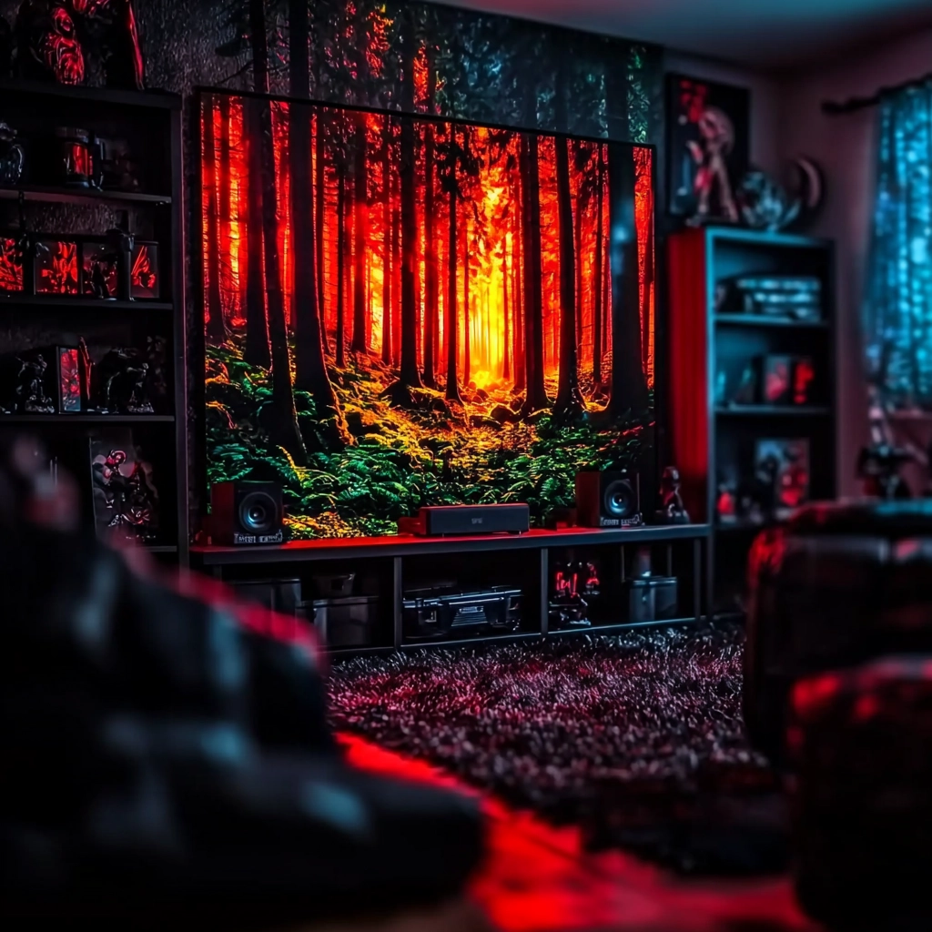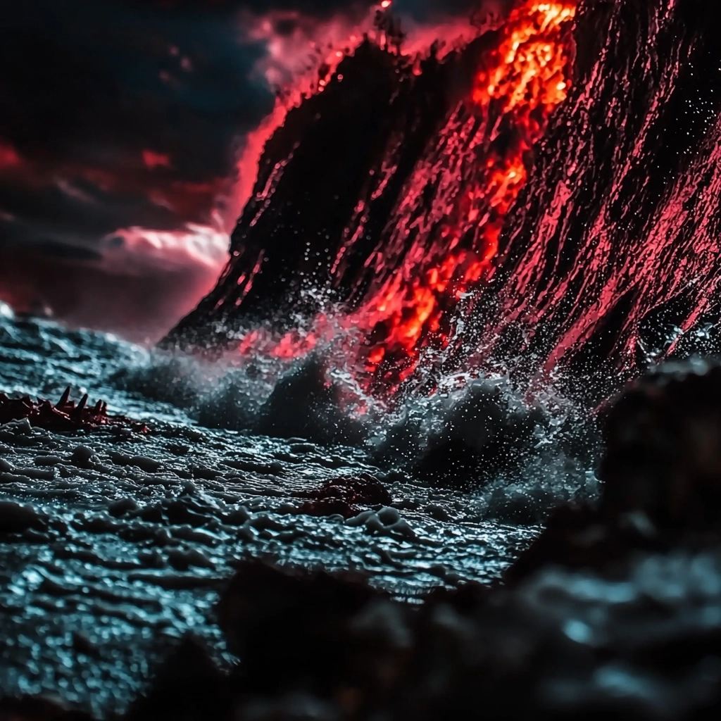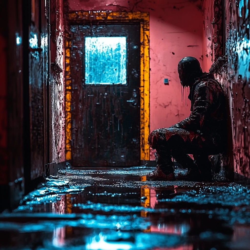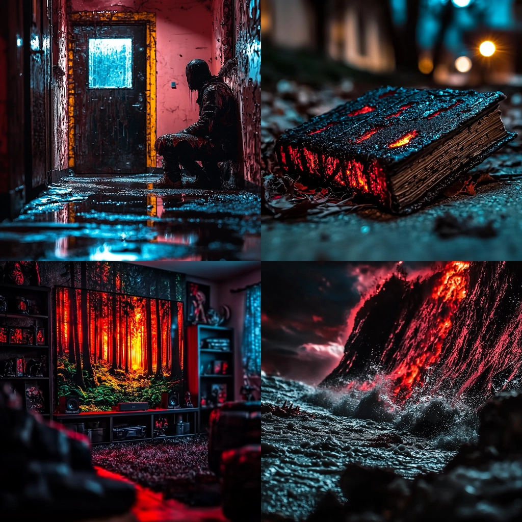 Lighting effects enhance contrast with prominently illuminated areas and deep shadows. Vivid red hues dominate foreground elements, while cool blue tones define background spaces. Textural details are highlighted through focused light sources, adding layers of visual complexity.