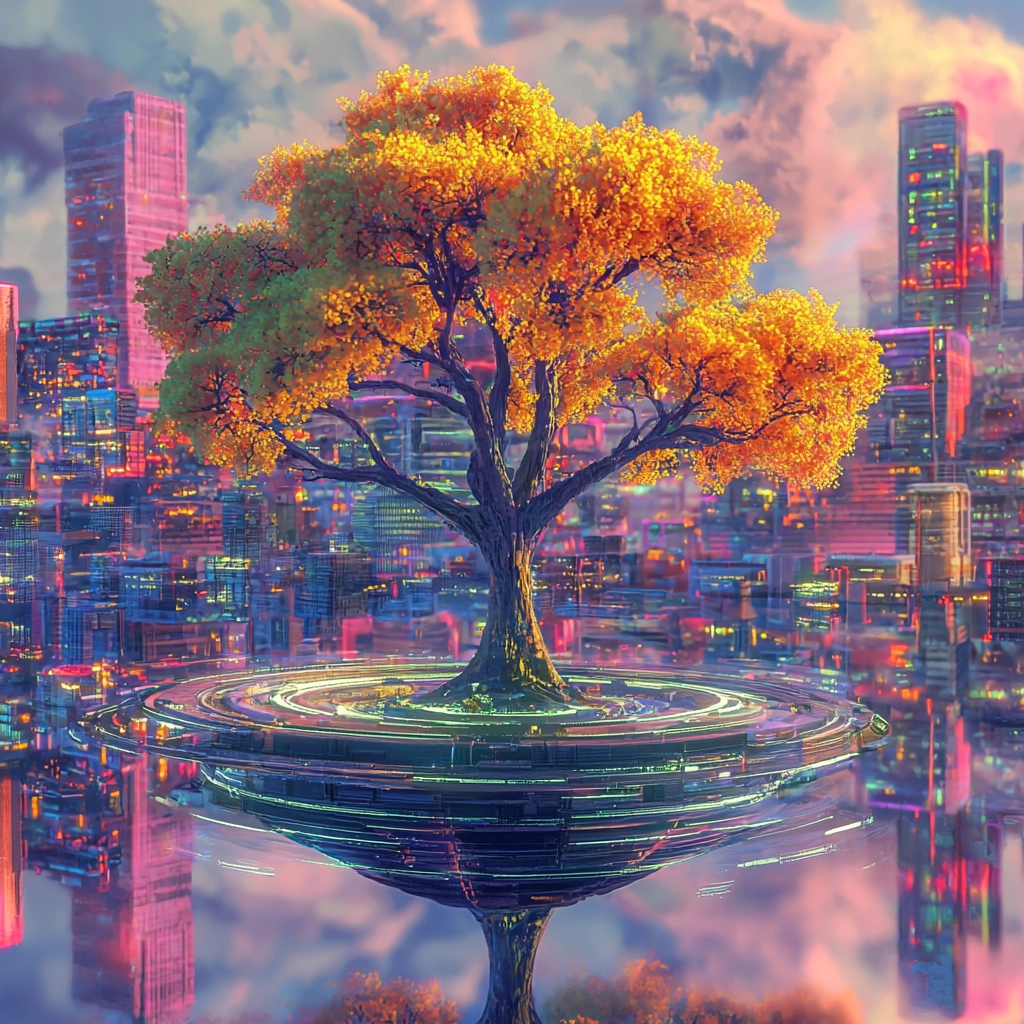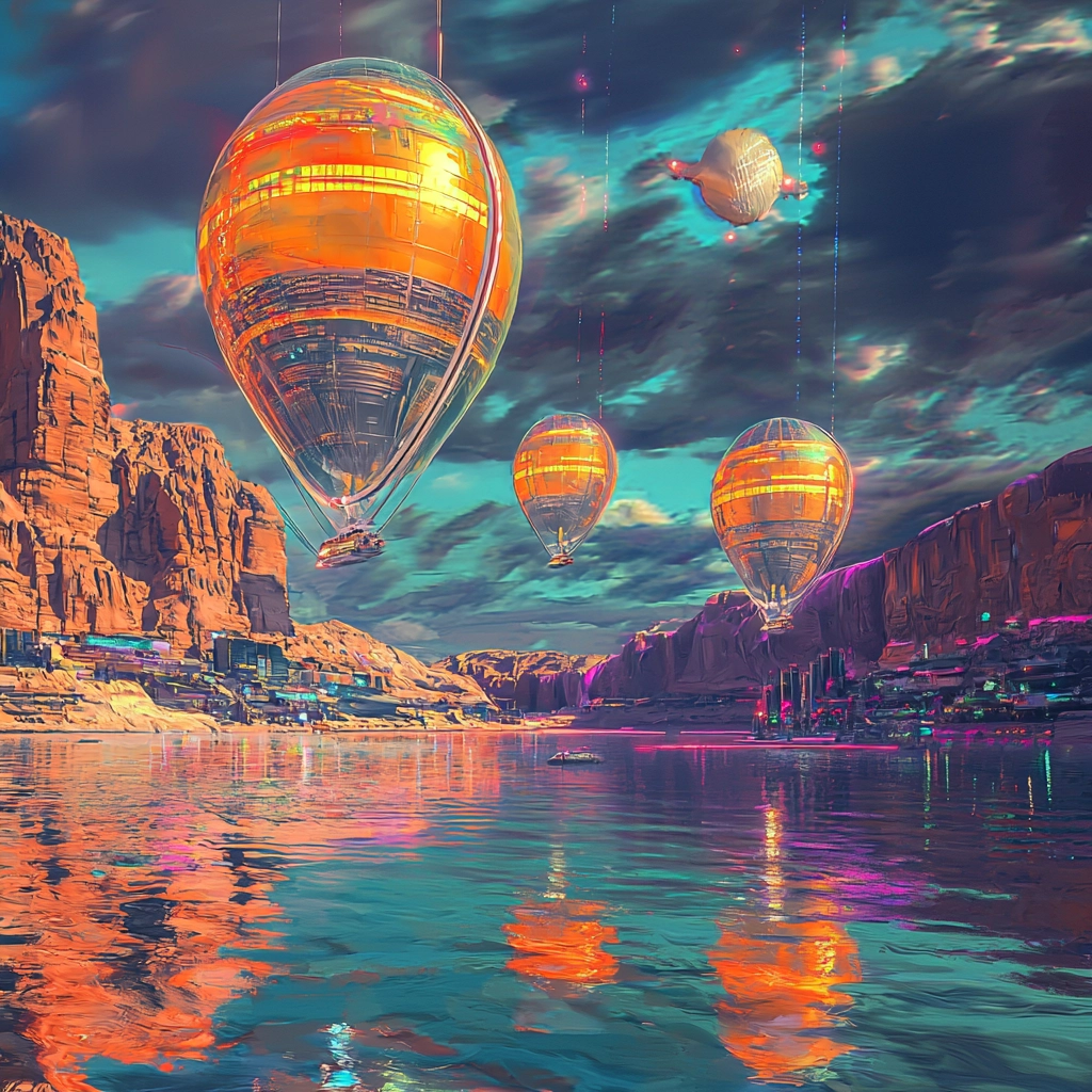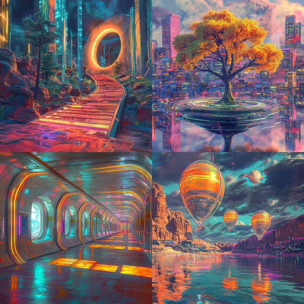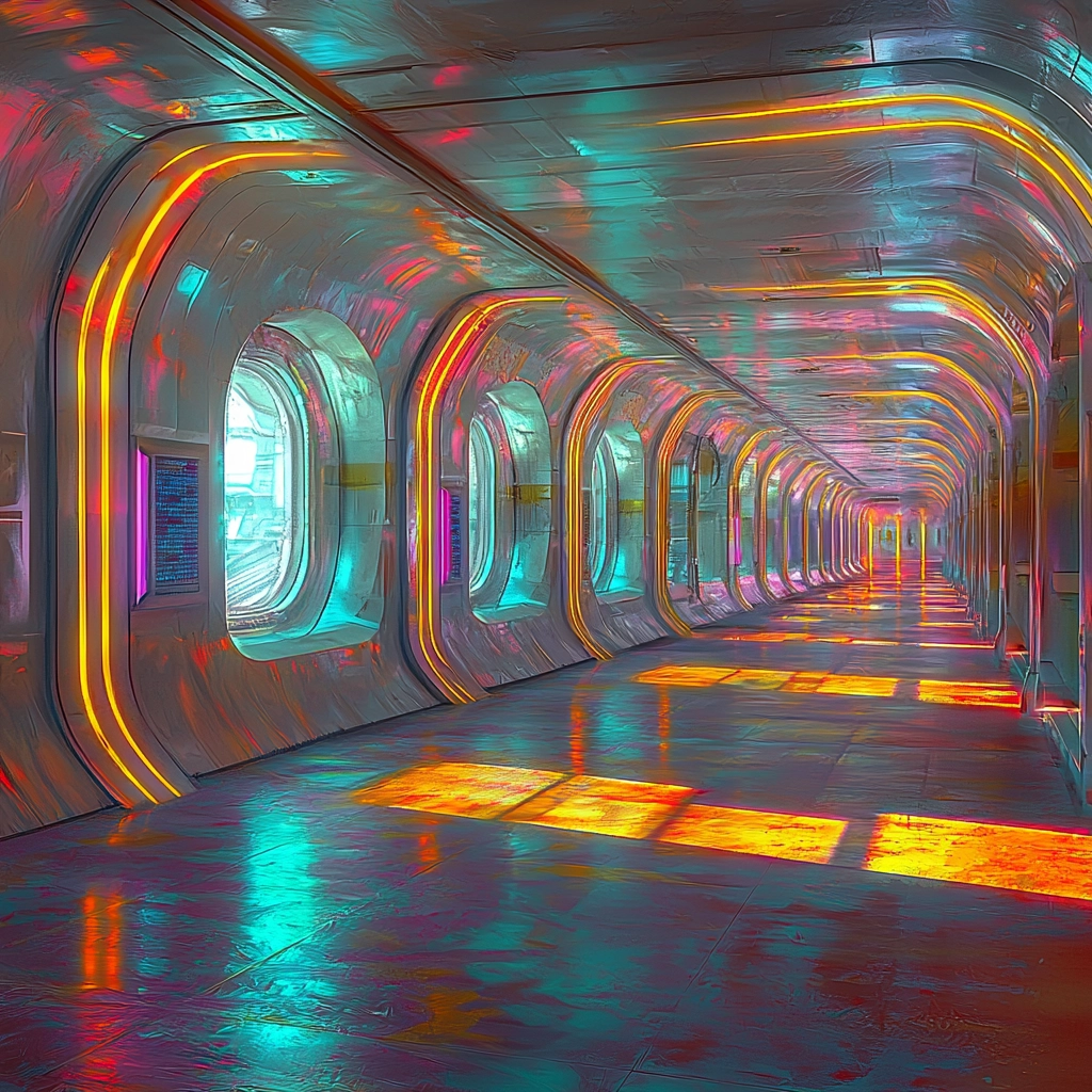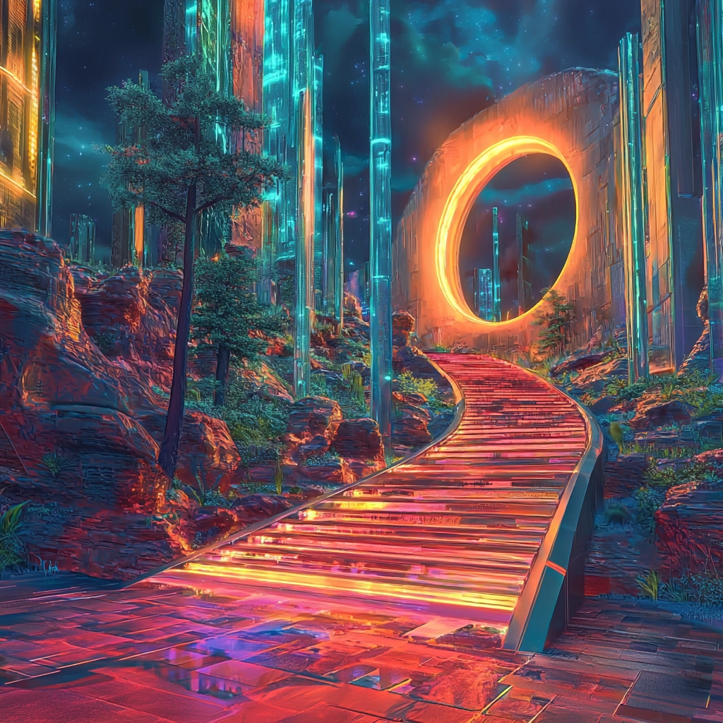 The lighting is dynamic and highlights vibrant hues of orange and cyan, creating a vivid contrast with deep purple shades. The spatial arrangement suggests depth and movement, enhancing visual immersion, while smooth textures mirror and reflect, augmenting the cyberpunk ambiance.