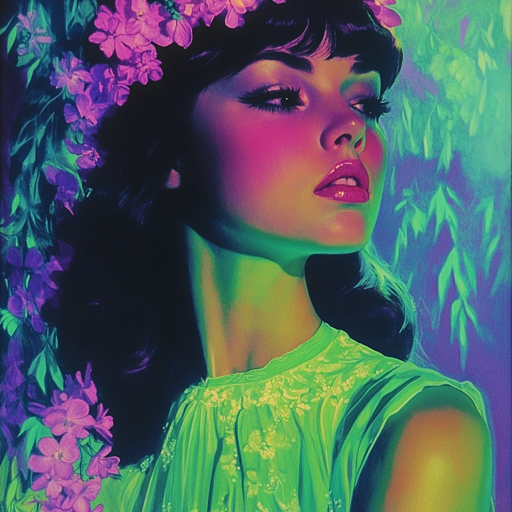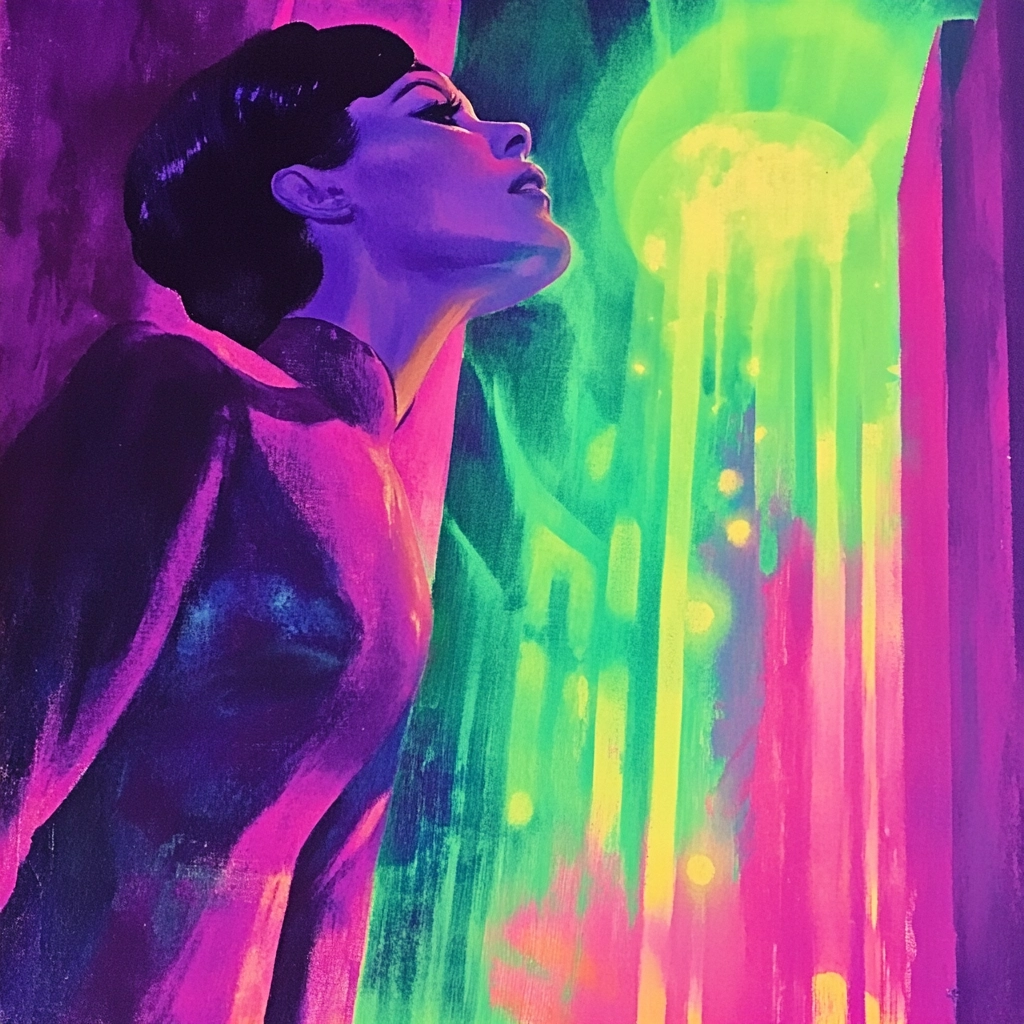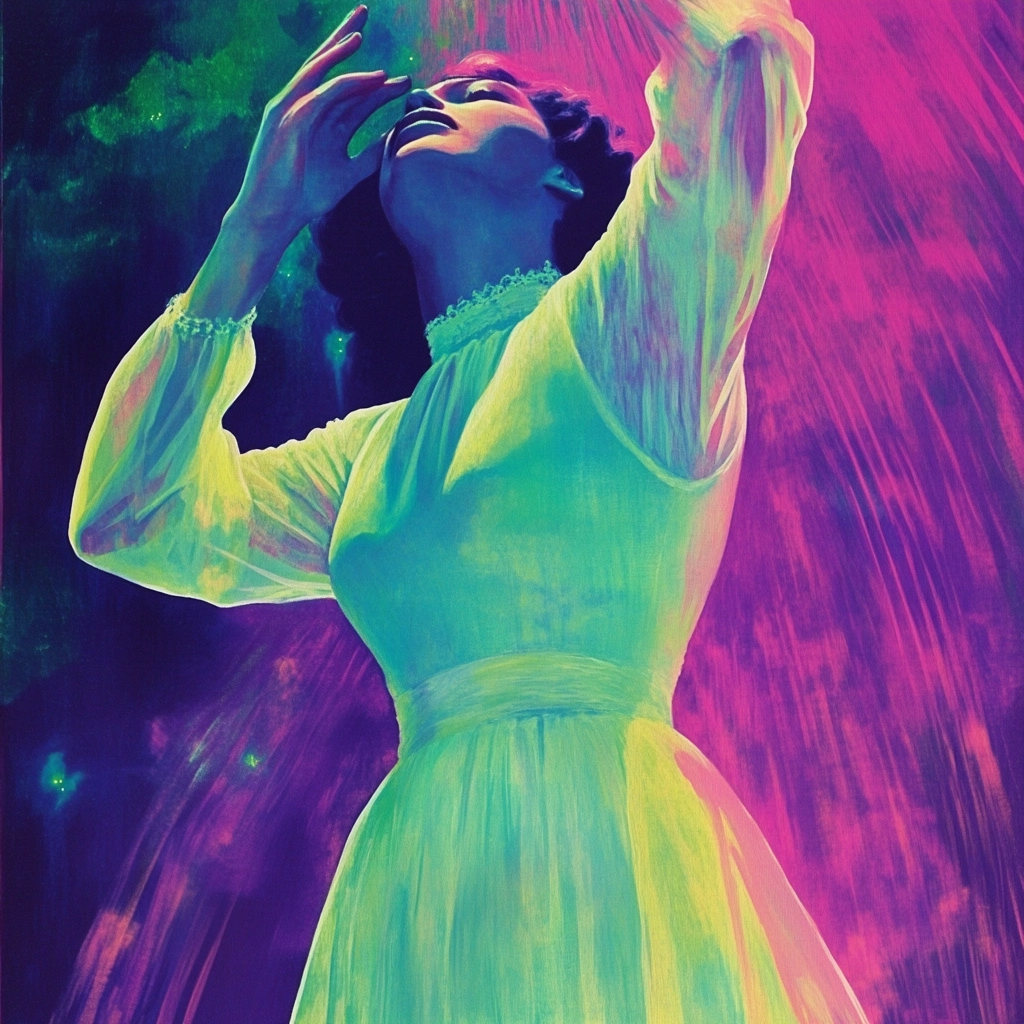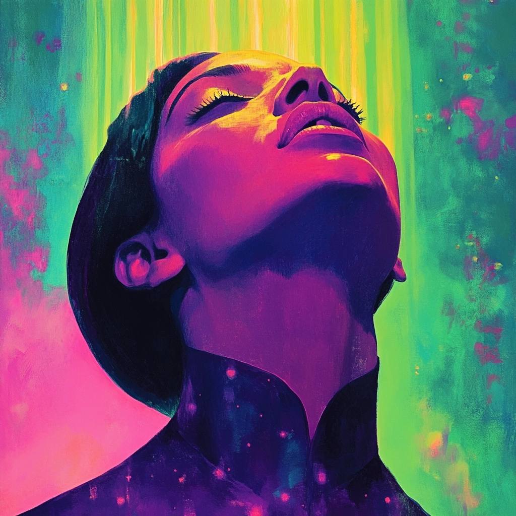 Dynamic lighting creates a sense of radiance, with colors transitioning smoothly to produce a vivid effect. The spatial arrangement is intimate, drawing focus on the posture. The use of contrasting hues and gradients enhances the visual intensity, while textures appear polished and smooth, amplifying the glow effect.