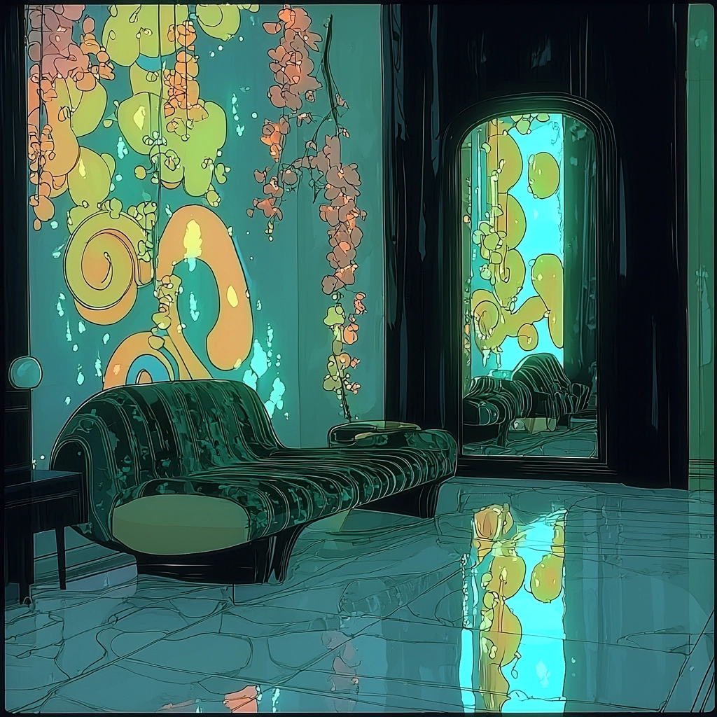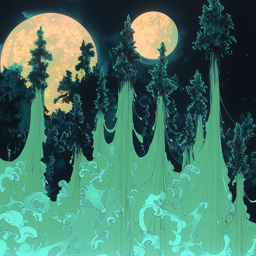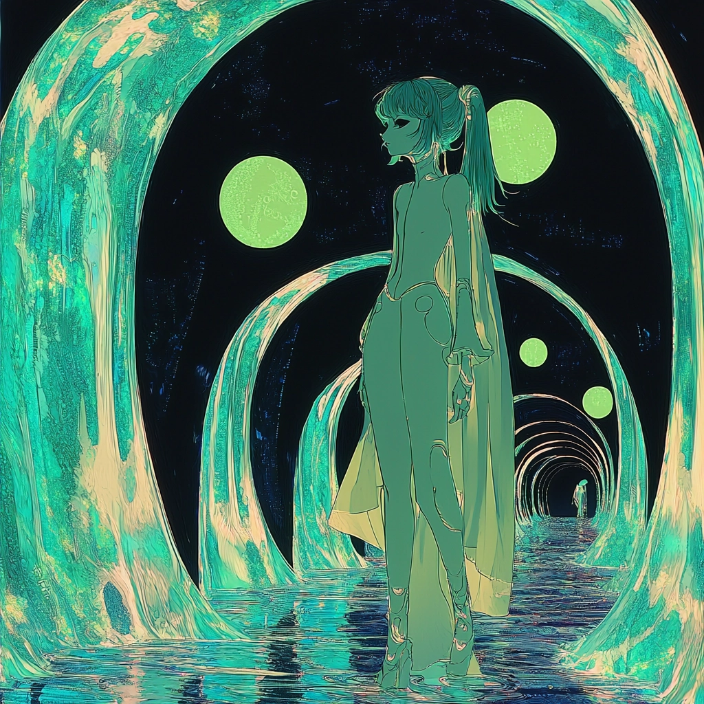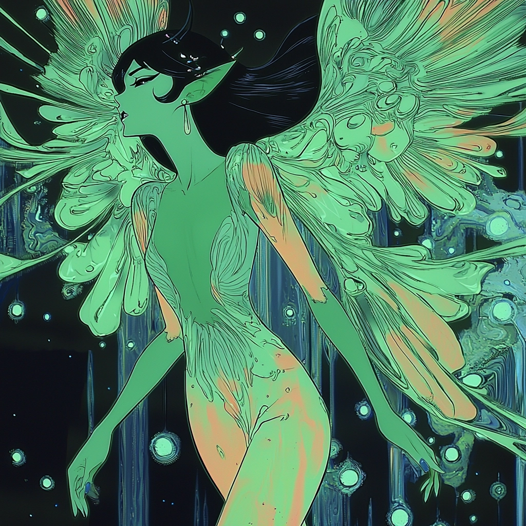 The use of intense fluorescent lighting creates vivid contrast against deep black backgrounds, producing dynamic highlights and shadows. The smooth, flowing textures amplify the sense of movement within the composition, highlighting sleek lines and curves.
