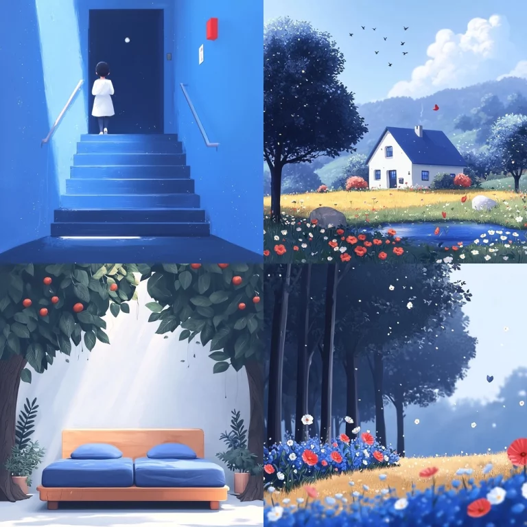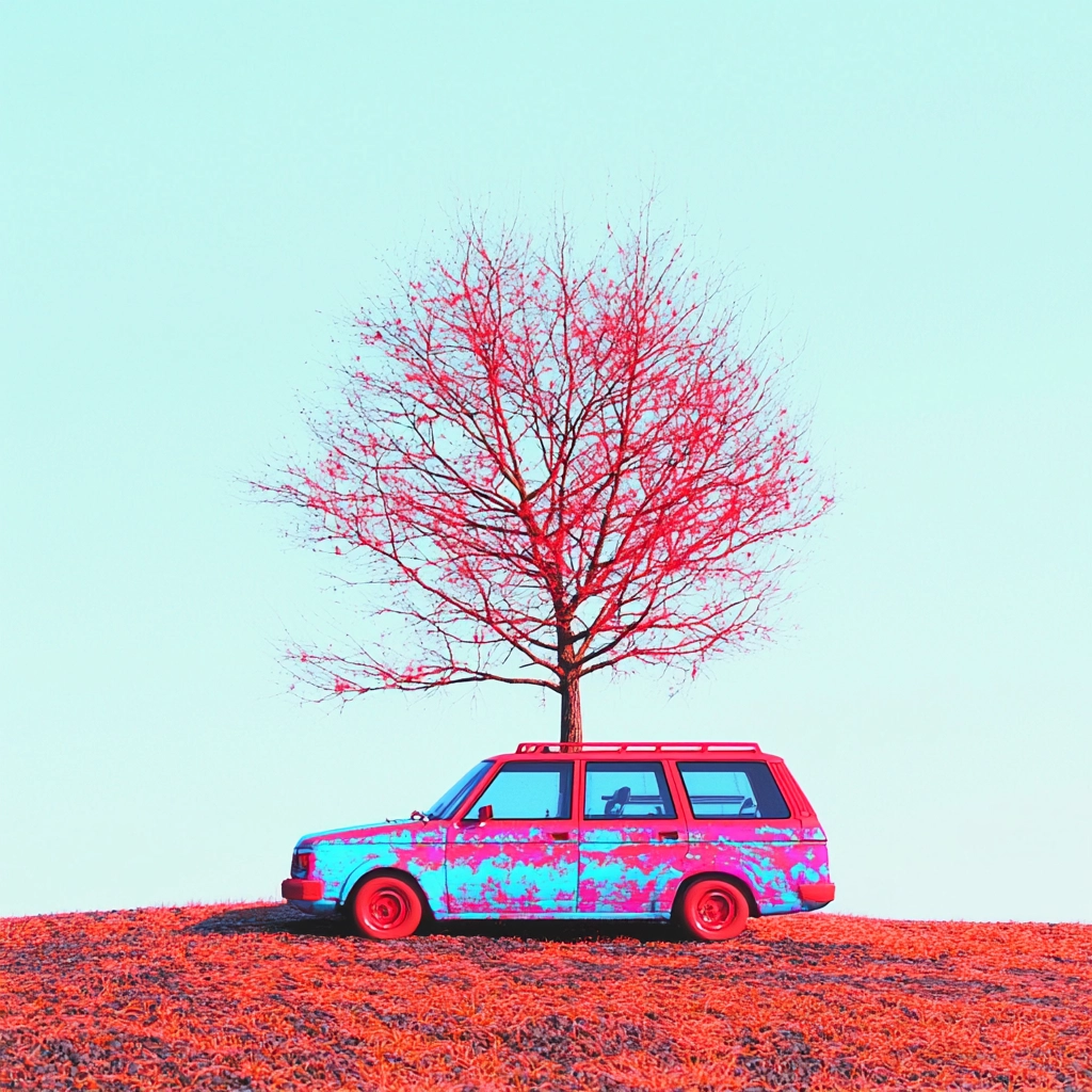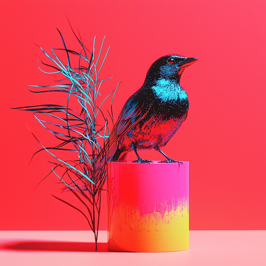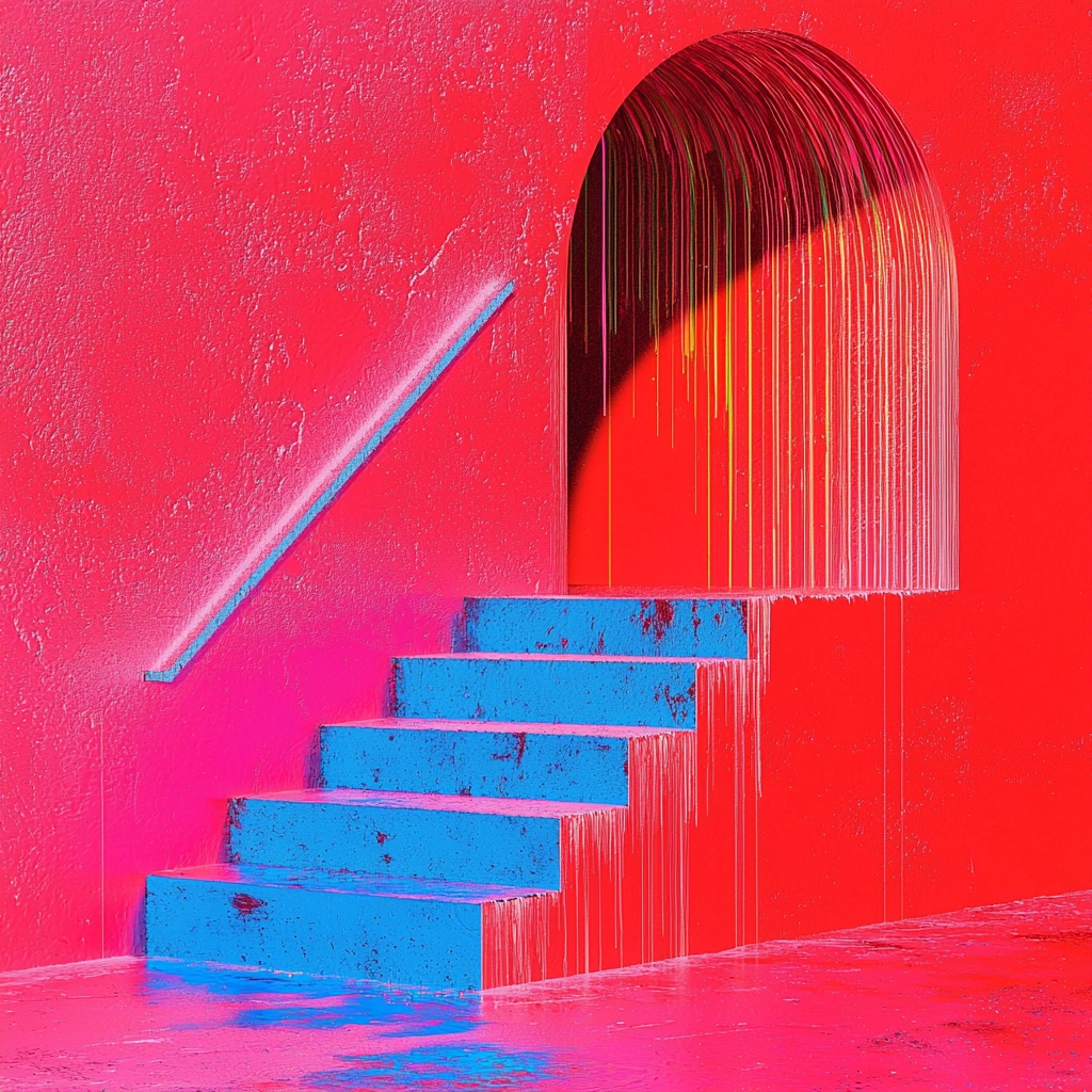 The lighting accentuates vivid, striking contrasts of red and blue with a glowing, saturated vibrancy. The spatial arrangement feels deliberately segmented, enhancing each component's texture, while smooth gradients add a digital softness to the sharp forms.