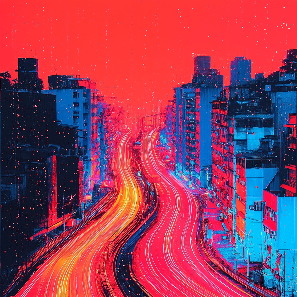 Bold contrasts of fluorescent red and blue define dynamic compositions.