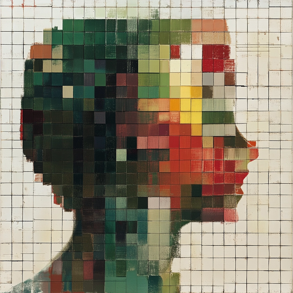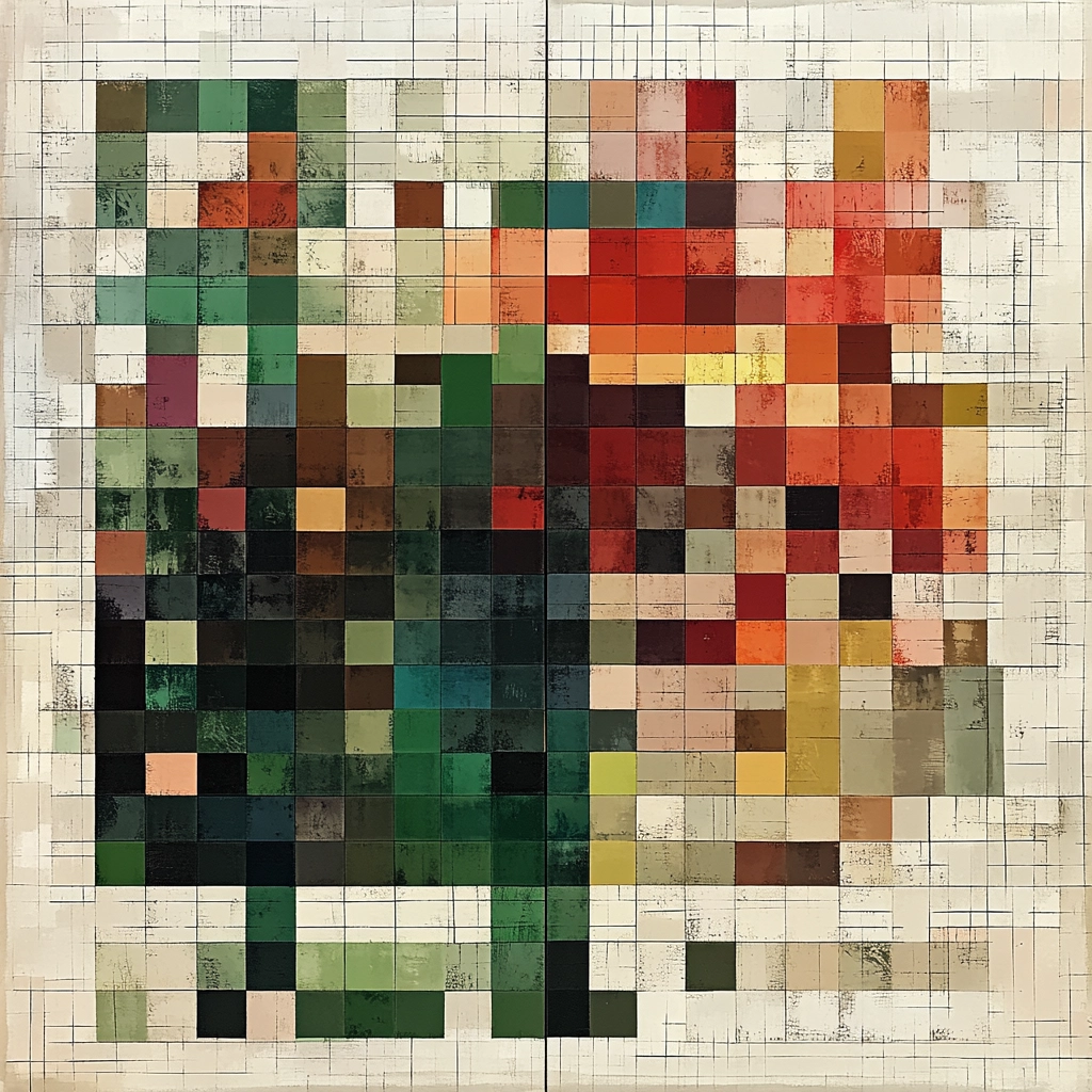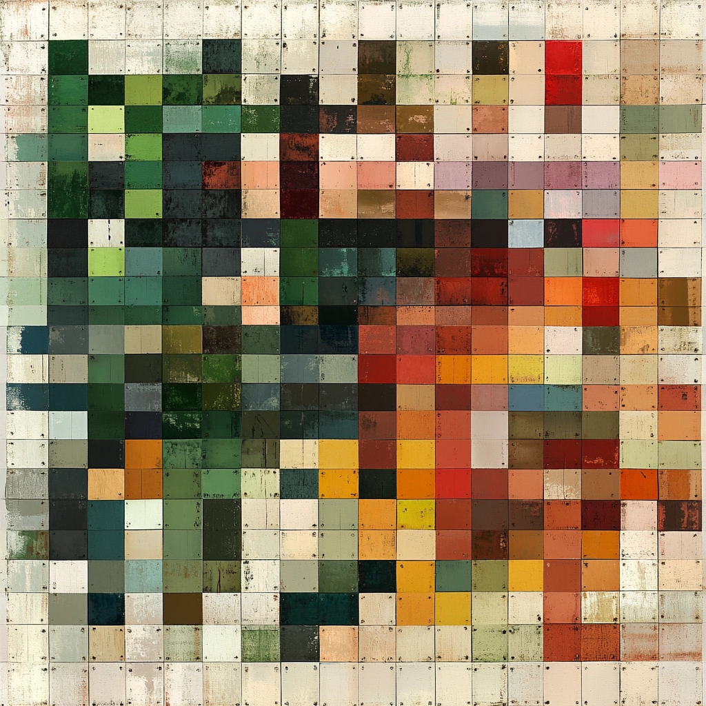 Distinct square tiles create a sense of fragmentation and cohesion. Bright greens and reds dominate, while beige provides a neutral balance. Each tile adds a layer of depth through its unique shade and texture.