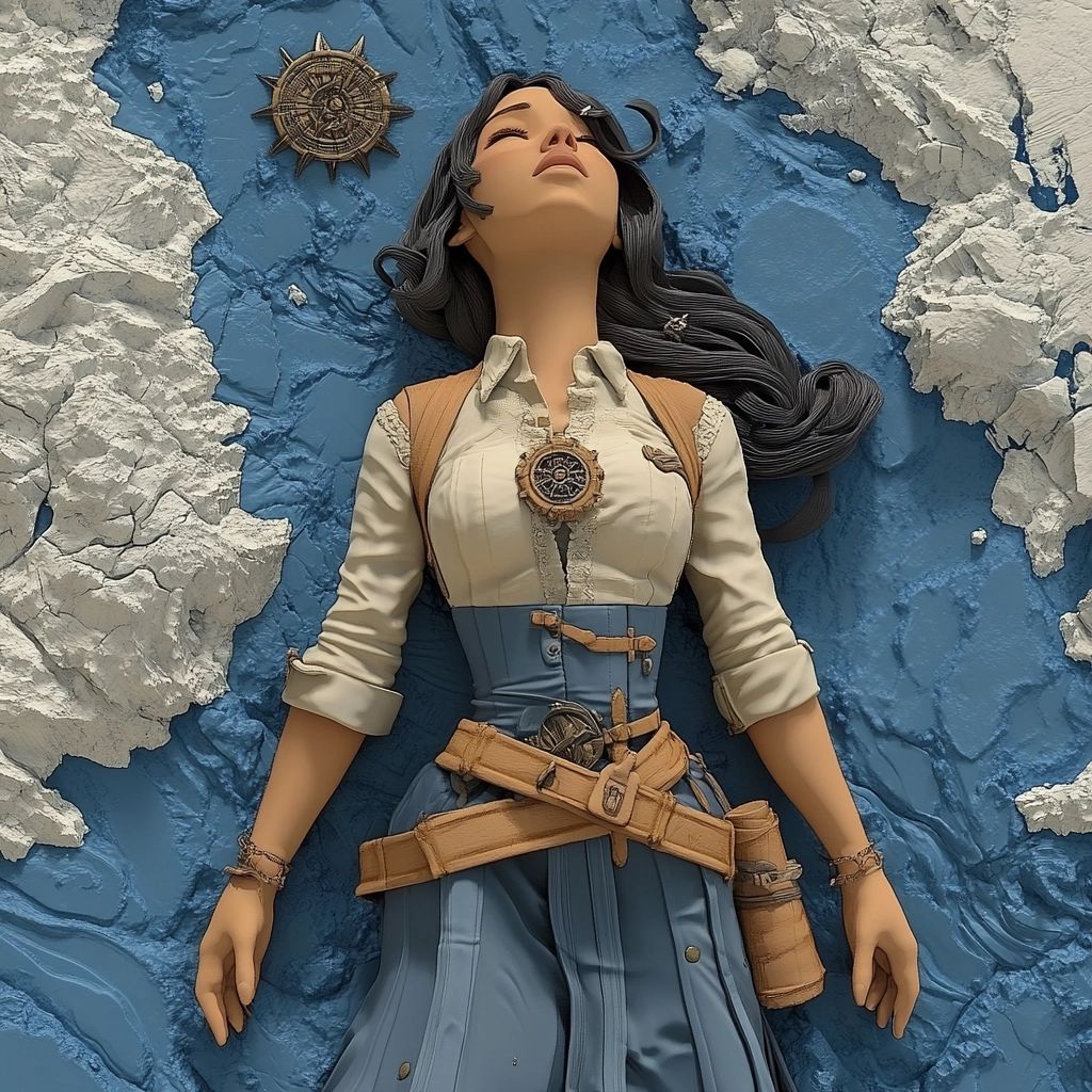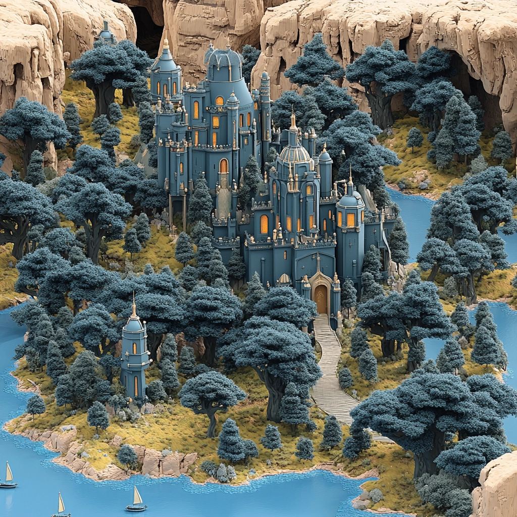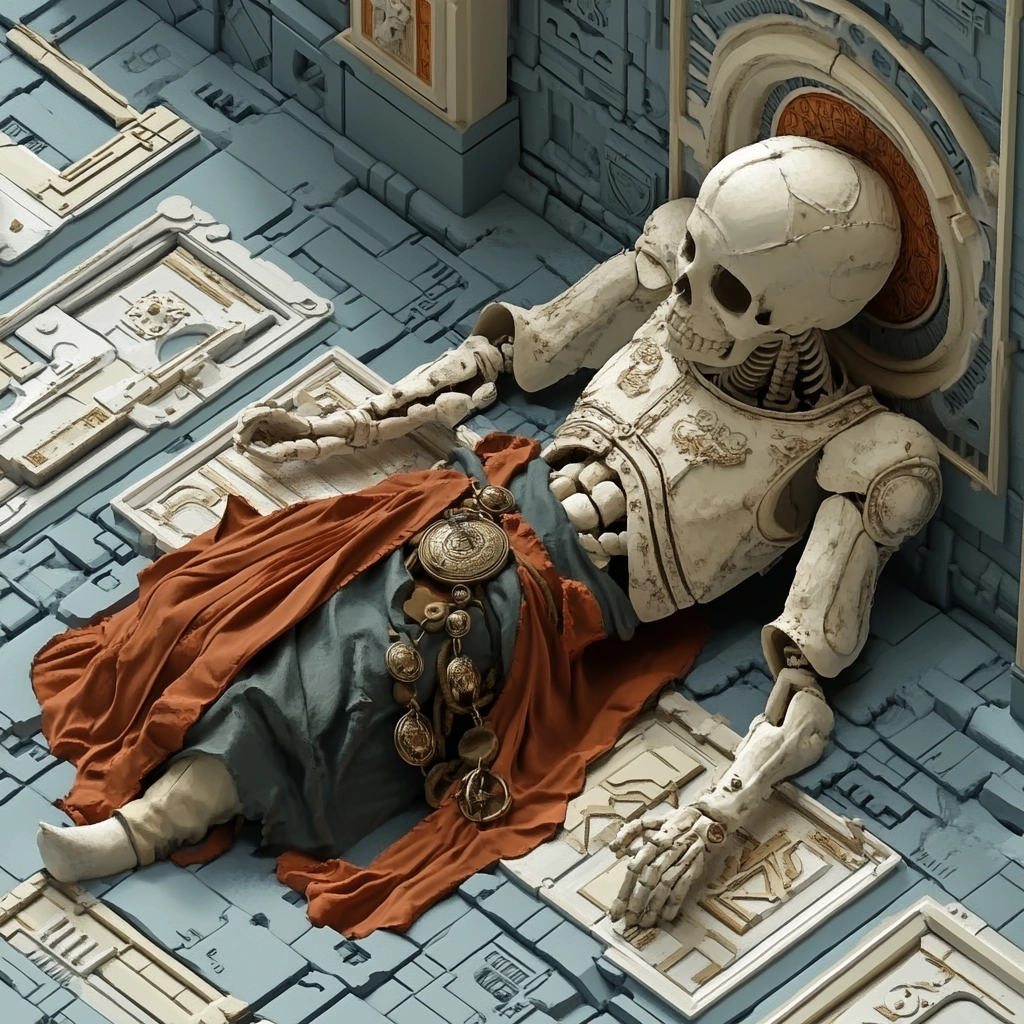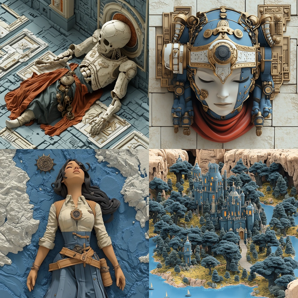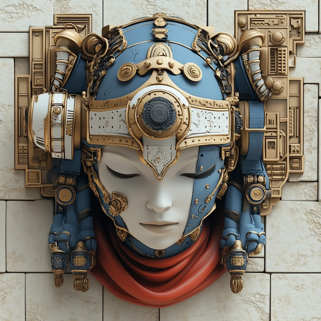 Intricate lighting enhances metallic textures; distinct color blocks create depth, with rich gold and blue providing a vintage yet futuristic quality combined with highly detailed relief work.