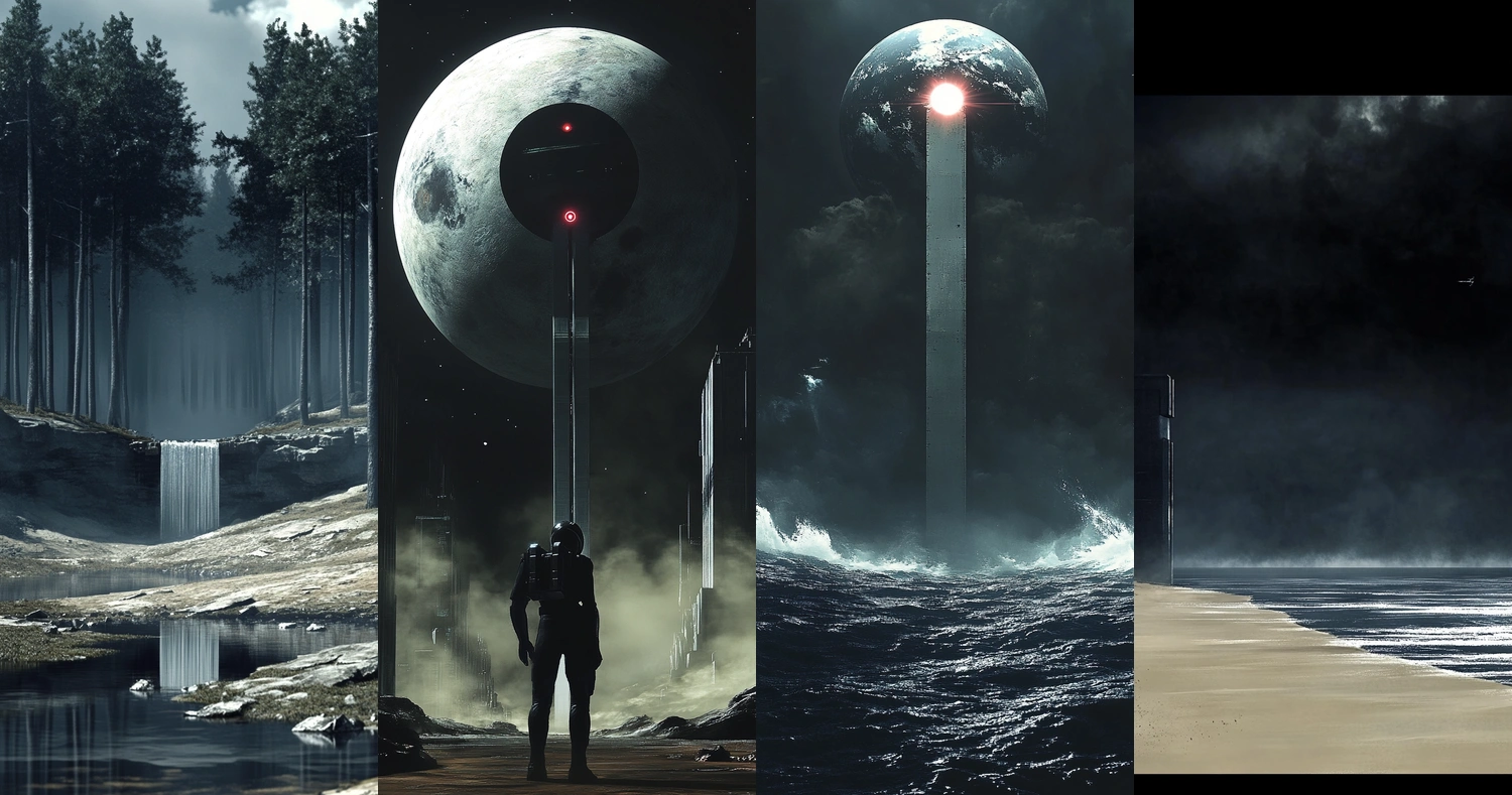 Strong contrasts accentuate stark lighting and shadows, enhancing the sense of depth. Textures range from smooth metallic surfaces to turbulent waters, creating a dynamic interplay with spatial perceptions.