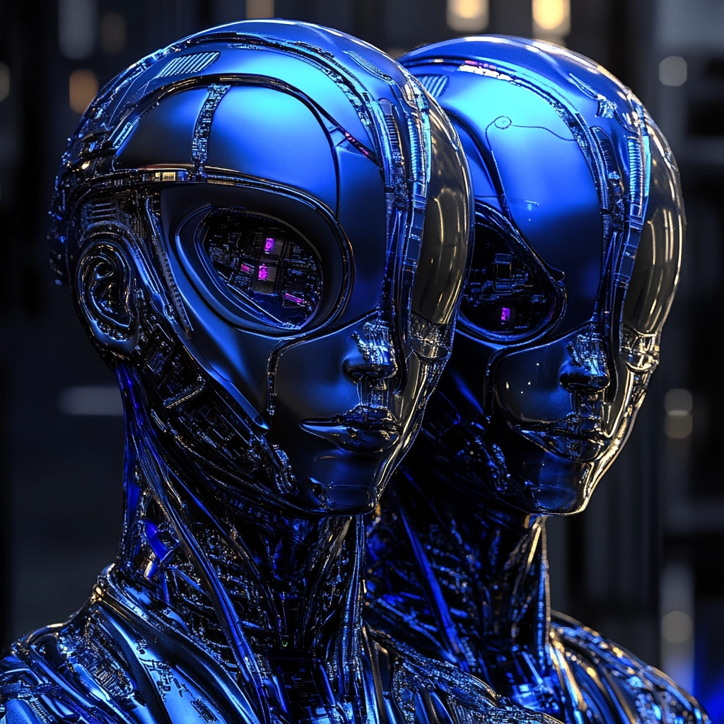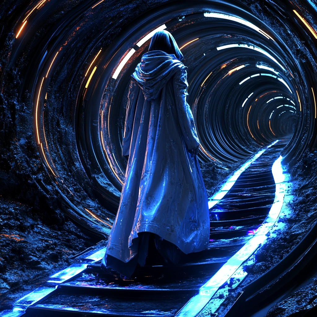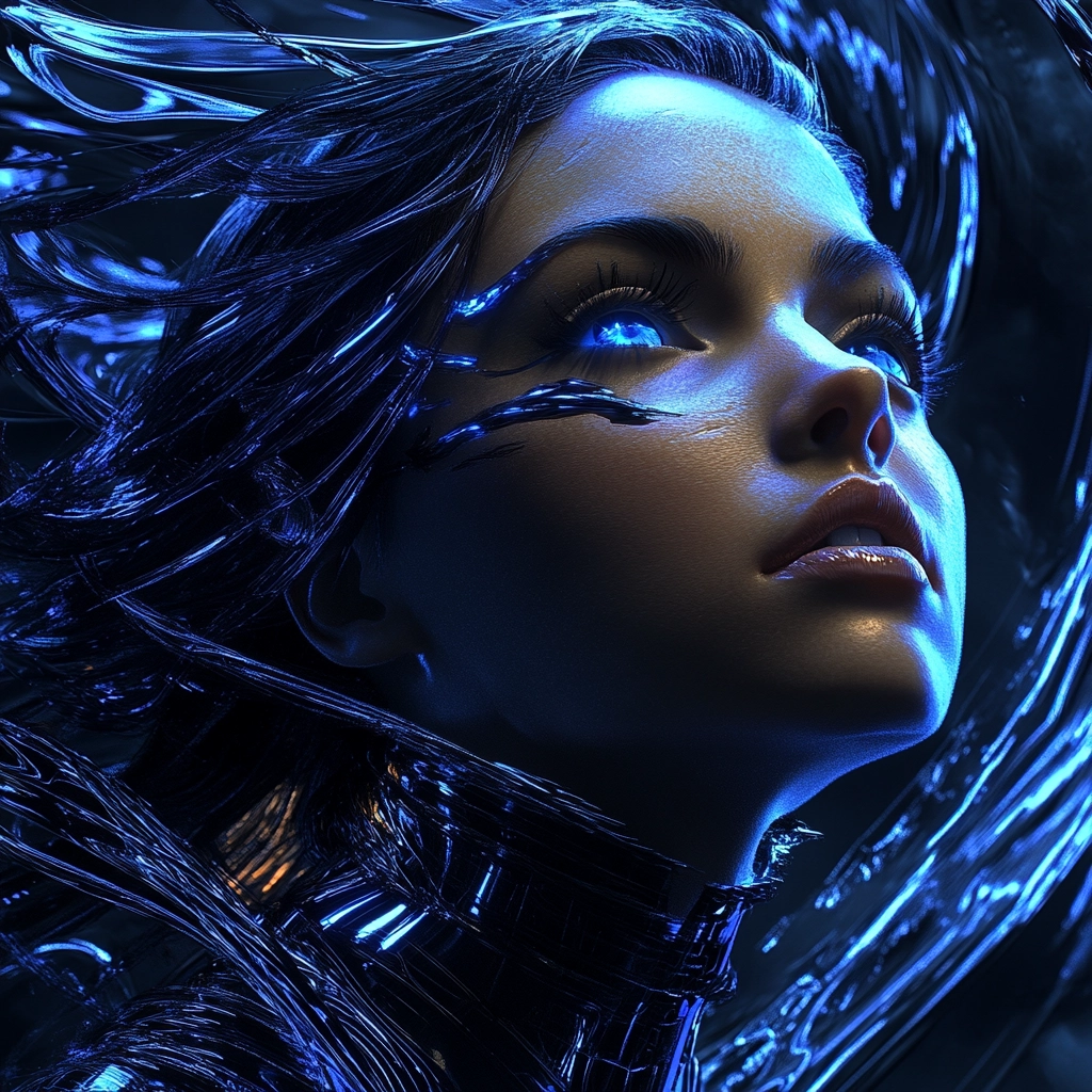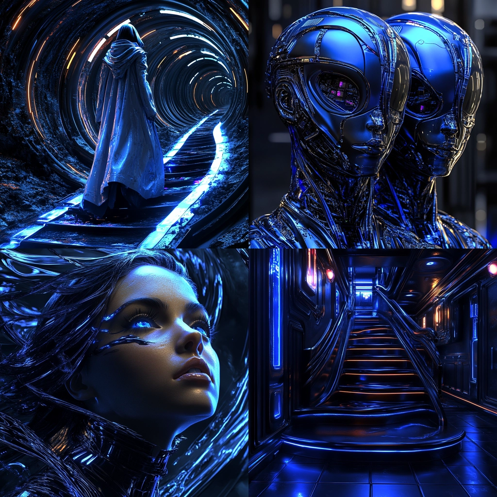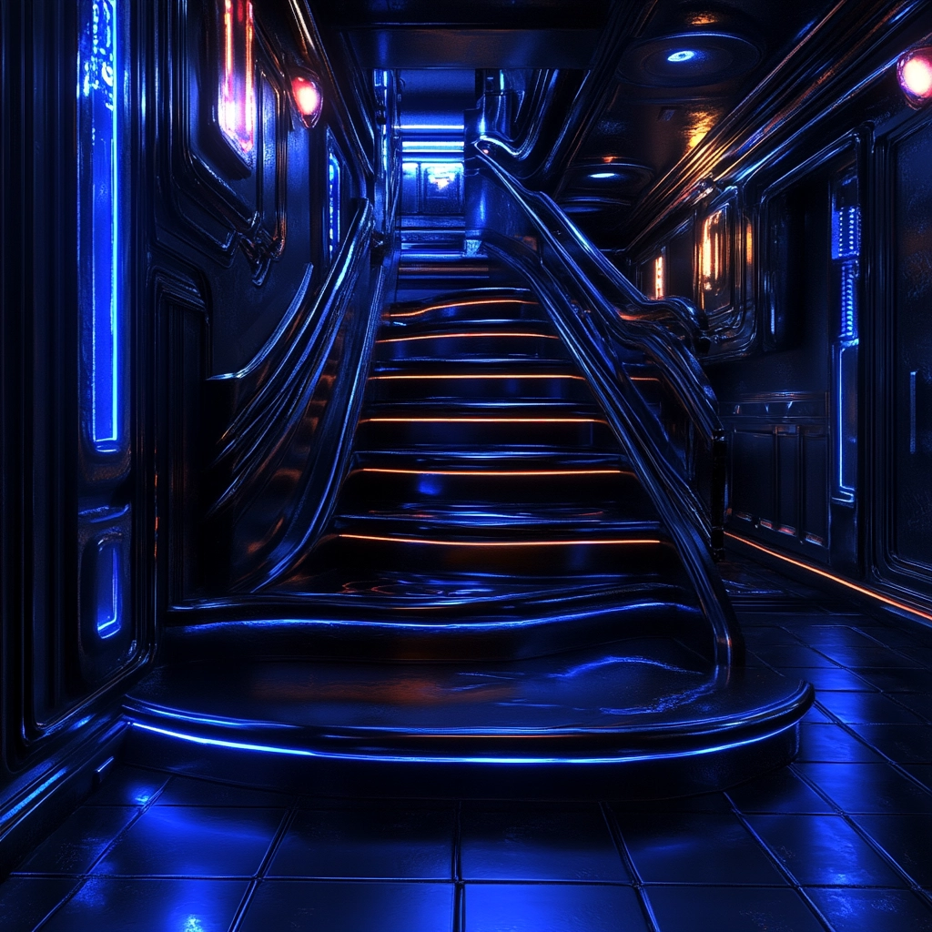 The artwork employs striking contrasts between dark and luminous tones, creating a sleek, metallic appearance. Neon lighting draws focus and enhances spatial dimensions, evoking a futuristic, visually compelling ambiance.