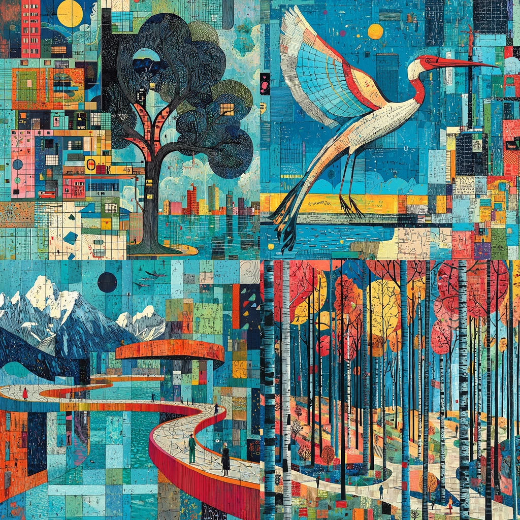 Intricate geometric patterns with vibrant contrasts and detailed textures creating a structured visual experience.