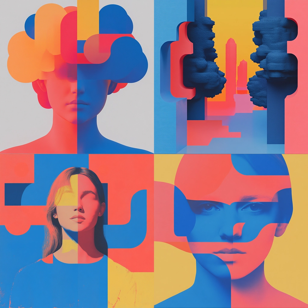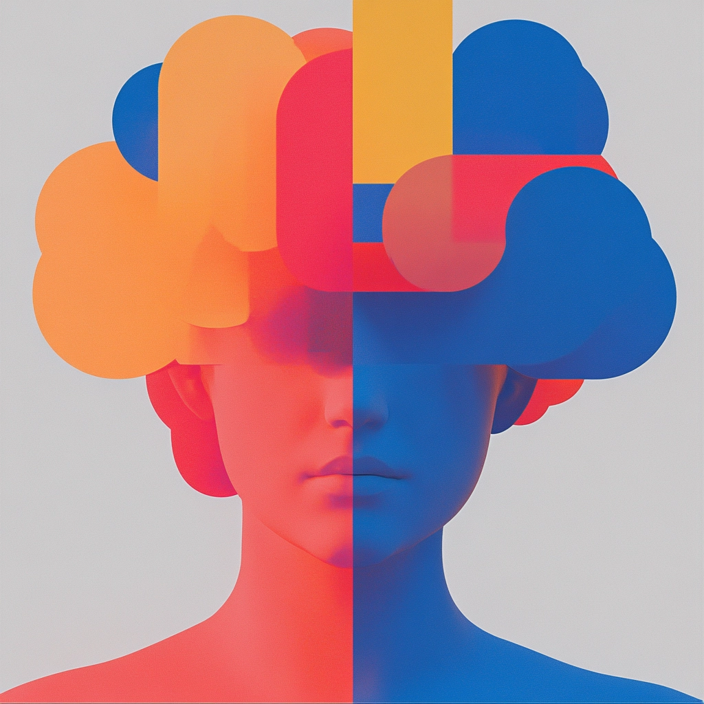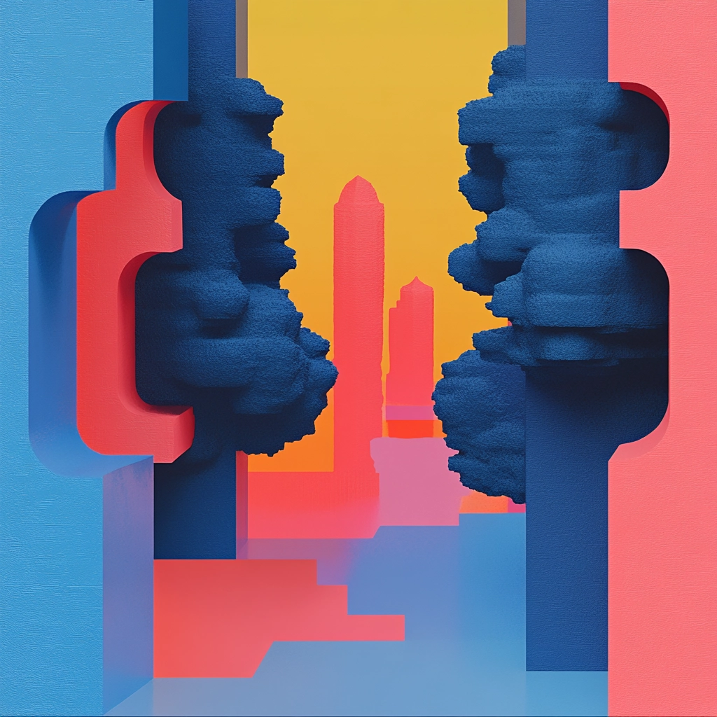 Strong contrast between bright blues, oranges, and yellows defines the composition. The interplay of geometric shapes creates a sense of depth and movement. Smooth color gradients enhance the dimensionality, while precise edges and flat areas emphasize the graphic quality.