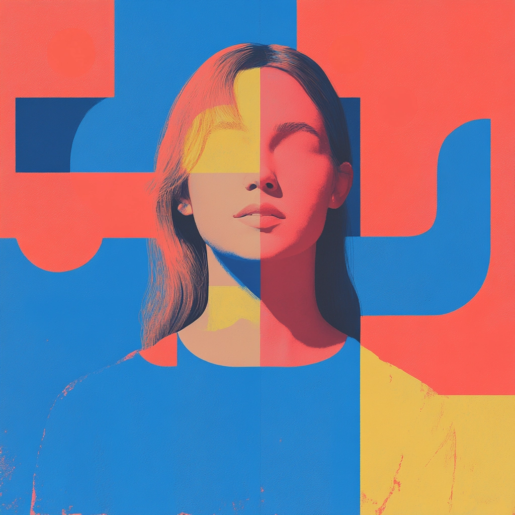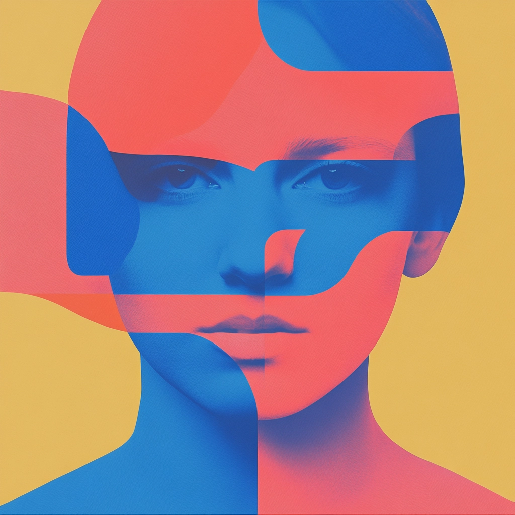 This piece uses bold geometric shapes and vibrant color blocks to create a striking visual composition.